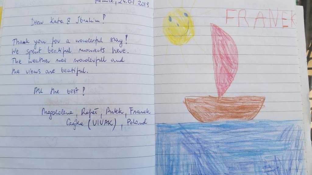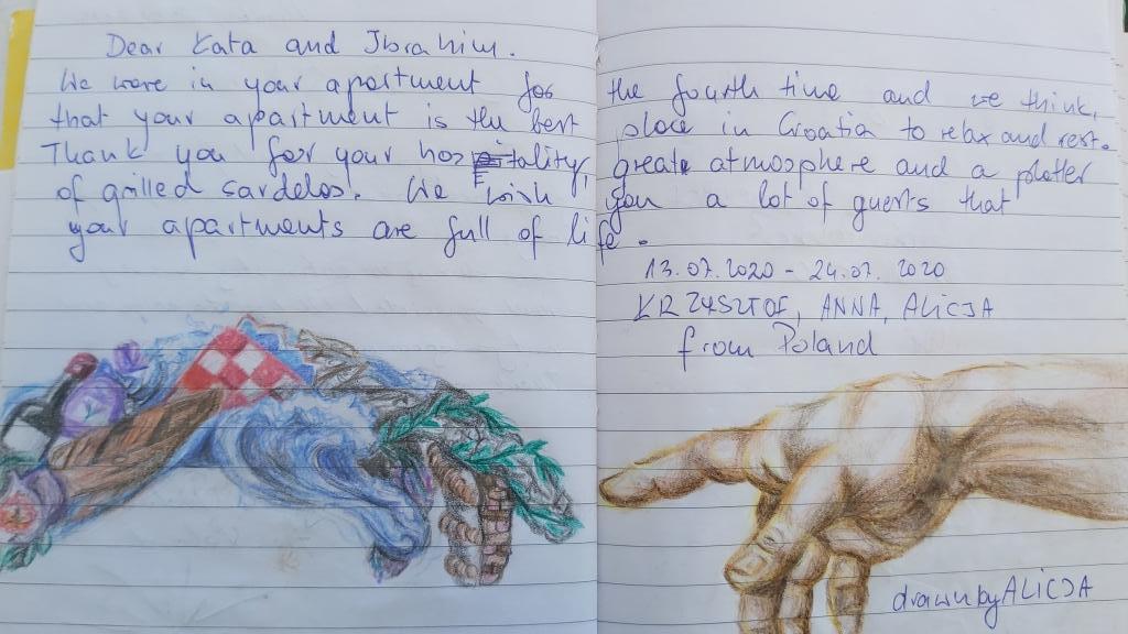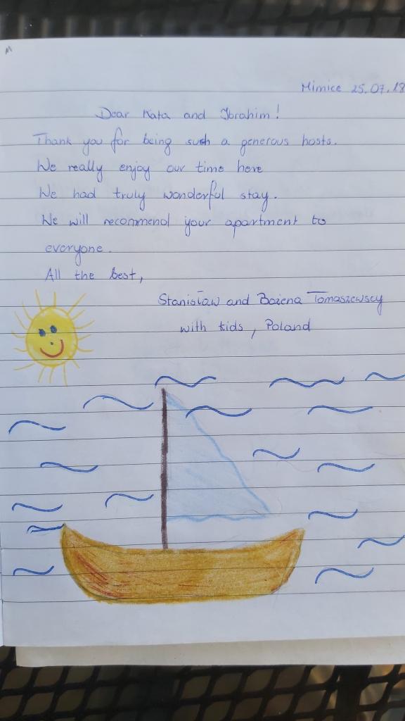 Vi tilbragte 10 dage i lejligheden med børn. Det var en fantastisk ferie, alle nød det virkelig. Huset er beliggende i et roligt område, omgivet af en stor have. Stranden ligger 10 minutter til fods. Vejen er lidt stejl, da huset står på skråningen, men til gengæld gør udsigten fra terrassen noget. Der er også store udflugter i retning af den gamle landsby og bjerget. Også med smukt panorama. Lejligheden er hyggelig, ren og veludstyret, den har alt, der sikrer et behageligt ophold. Vores værter er uendeligt venlige og hjælpsomme, tak for en uforglemmelig ferie!