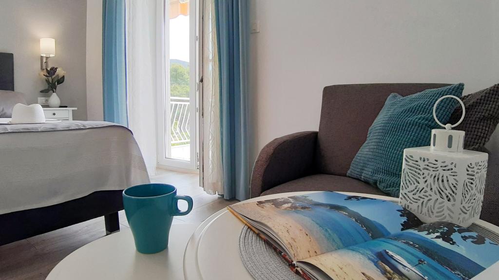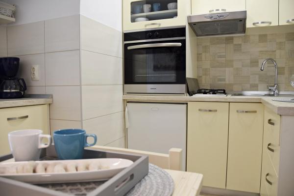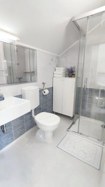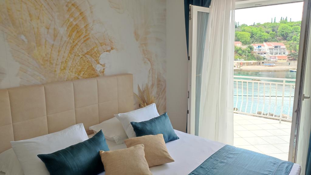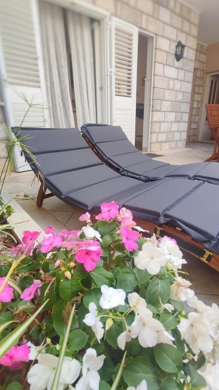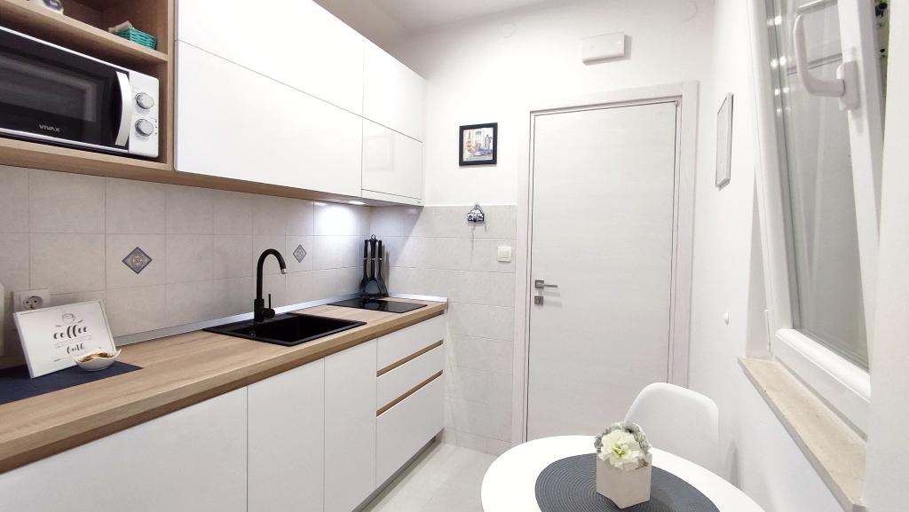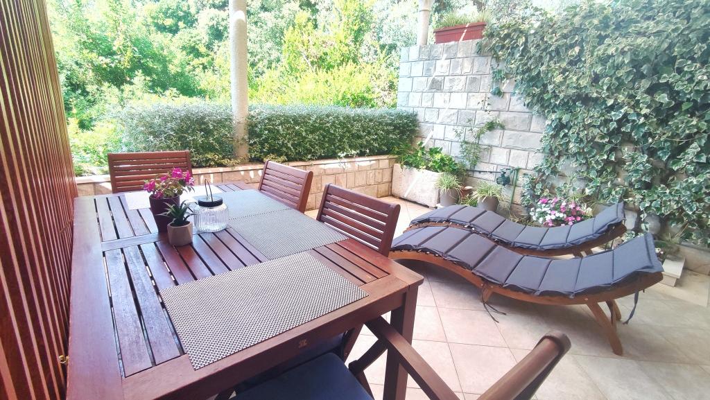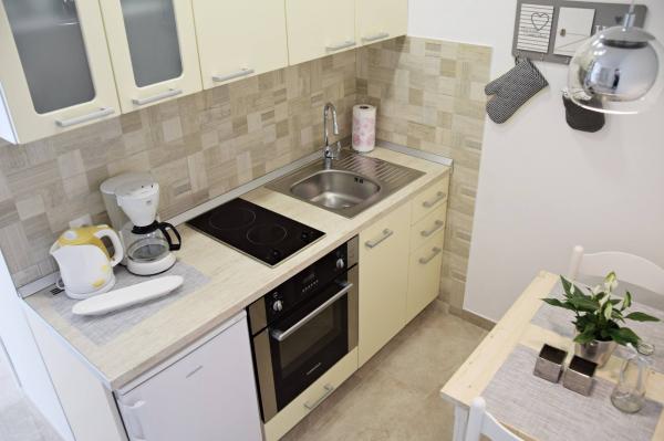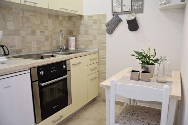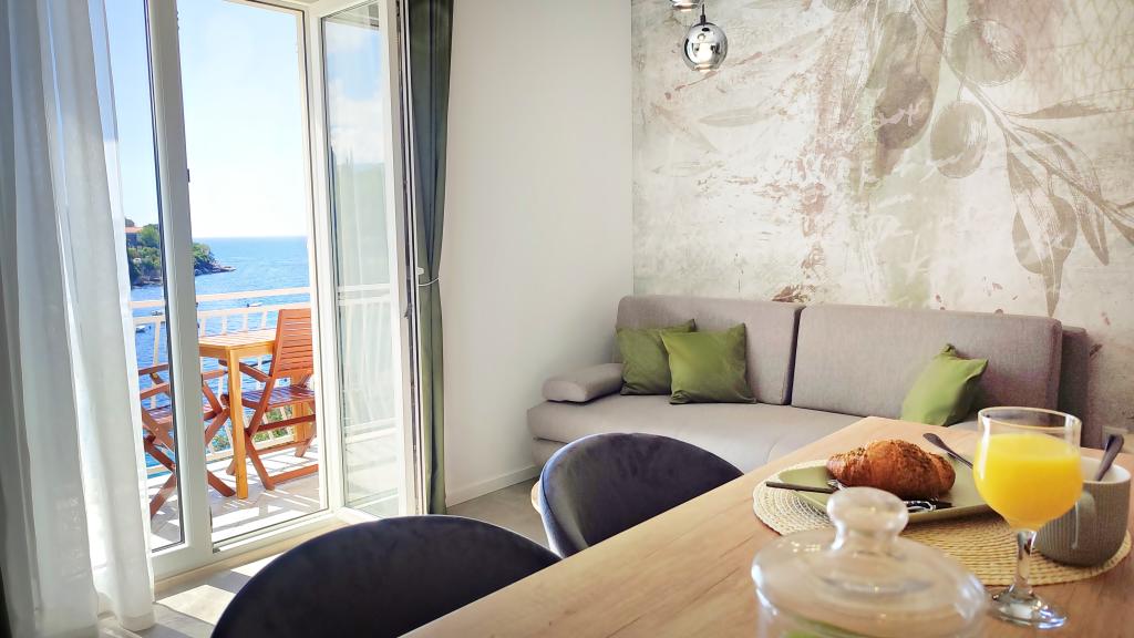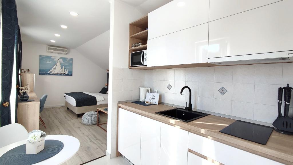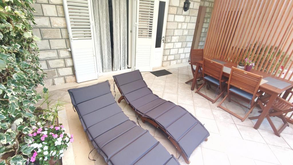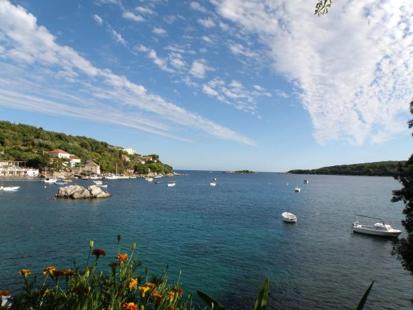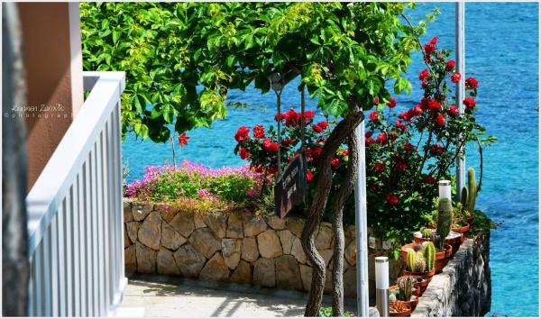 Jeg vil starte med værterne, for de er vidunderlige. Karmen og hele familien vil gøre din ferie yderst behagelig. De er der for ethvert spørgsmål og enhver form for hjælp. Vi blev mødt af en ren og pæn, smukt designet lejlighed, fuldt udstyret med alt nødvendigt i køkken og badeværelse. Håndklæder og klude skiftes regelmæssigt hver anden dag. De laver også fin olivenolie, som du kan købe i bygningen. Lejligheden er perfekt placeret, med sin egen lille stenstrand, hvor der er skygge om eftermiddagen. Du kan holde dig kold hele dagen, hvis du placerer dig under et træ. Vi kunne bruge grillen på stranden til enhver tid, den er tilgængelig for gæster. Den nærmeste restaurant ligger 3 skridt fra ejendommen og har et godt køkken med standardpriser for den kroatiske kyst. En mindre butik ligger 3 minutters gang væk, men den er veludstyret. Der er også en mindre sandstrand i nærheden af butikken, og en større er omkring 10 minutters gang væk. Hele byen er smuk og rolig, ideel til en fredelig ferie.