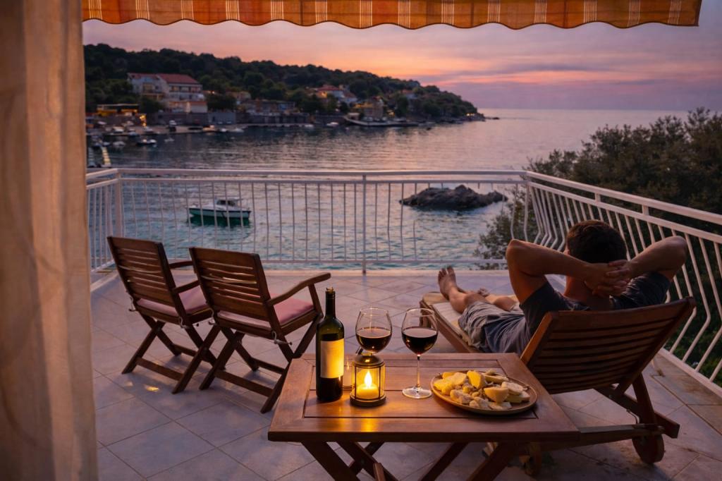 Villa Ana ligger i den smukke lille by Moluntu, beliggende i umiddelbar nærhed af havet med egen strand og fortøjning til både. Parkering i skyggen foran huset er tilgængelig for alle vores gæster. Vores komfortable lejligheder omgivet af middelhavsvegetation, fred, ro og klart hav vil gøre din ferie behagelig og uforglemmelig. Vi tilbyder dig et sted, hvor du vil føle dig hjemme, og du vil blive glad for at komme tilbage igen, og vi vil være glade for at være dine værter. Alle lejligheder har aircondition, hver af dem har SAT-TV, centralvarme og et fuldt udstyret køkken, balkon eller terrasse med udsigt over havet.