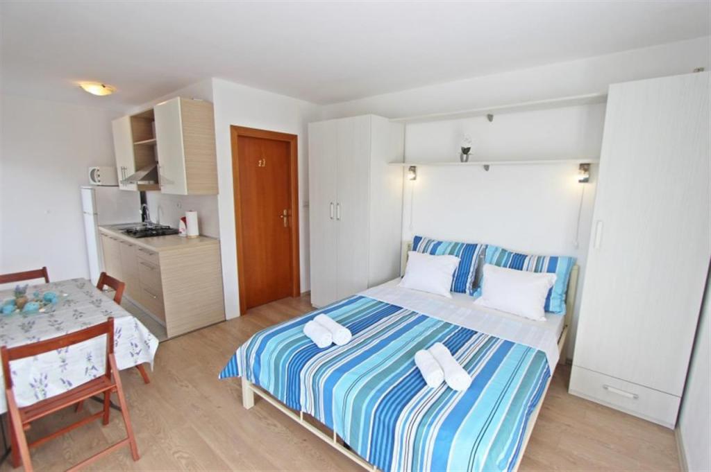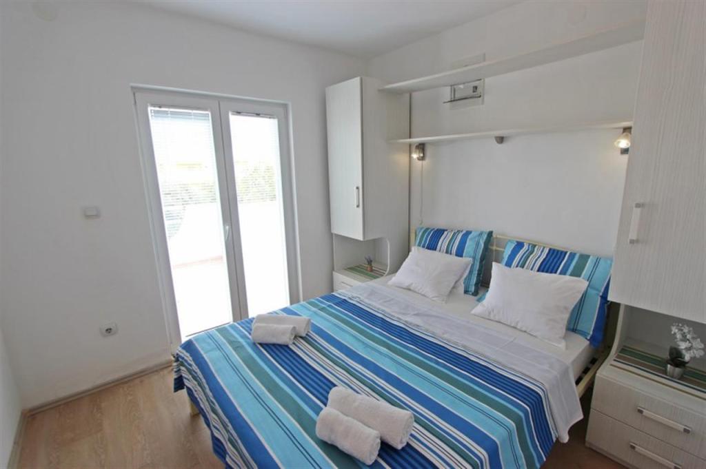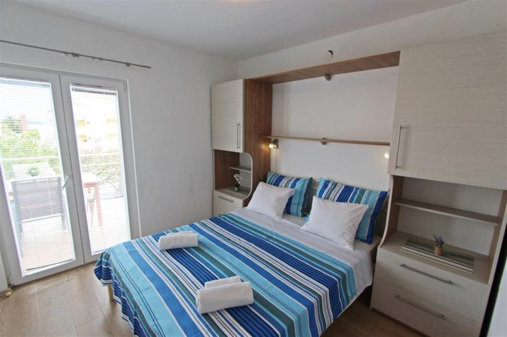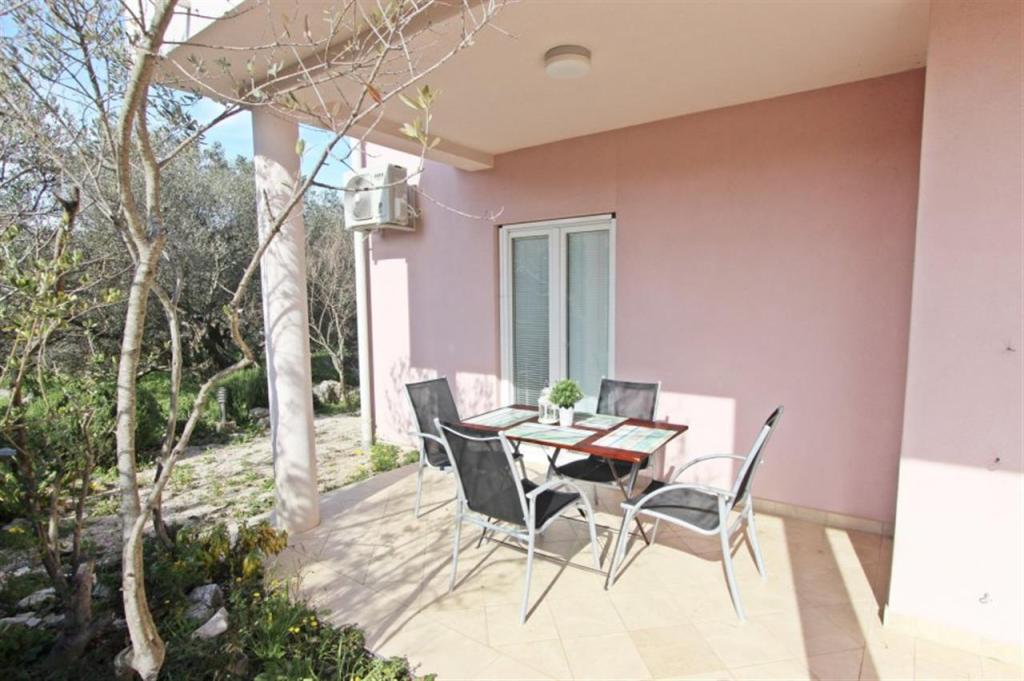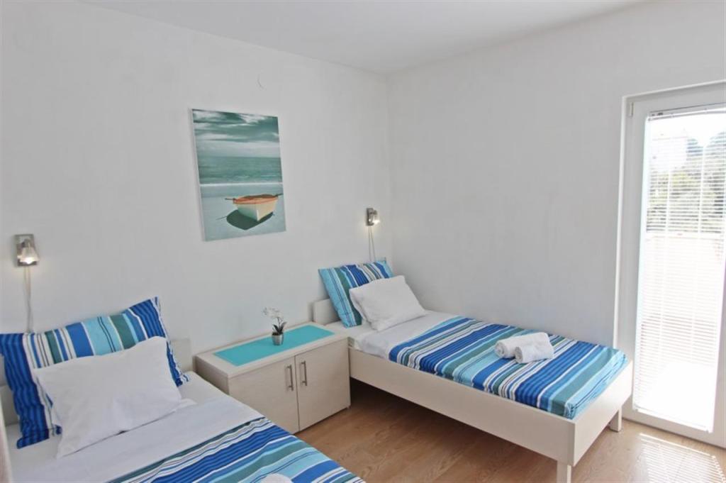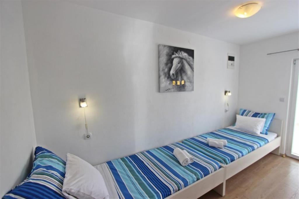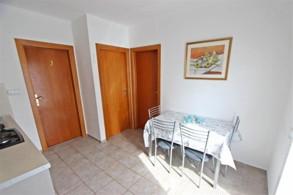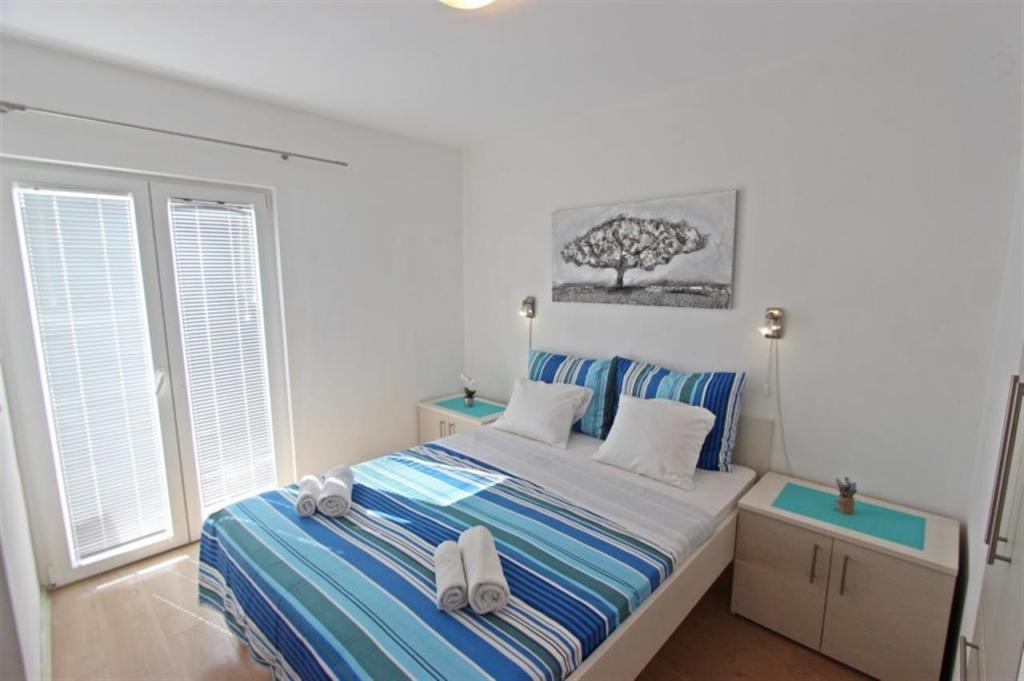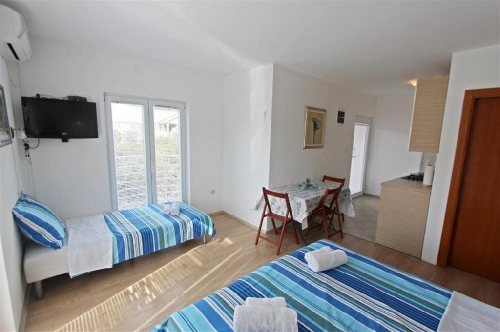 Lejligheder til fire personer 2 + 2 eller studielejligheder 2 + 1. De består af et soveværelse (en dobbeltseng) og et værelse med to enkeltsenge (mål 200x90) eller et soveværelse og en seng i stuen, mens studielejlighederne består af en dobbeltseng med ekstra seng, køkken, badeværelse og stor terrasse (15m2 / 18m2). I stueetagen er der også et værelse med en vaskemaskine, som gæsterne kan bruge. Lejlighederne er udstyret med TV og aircondition, wi-fi, mikroovn og køleskab med fryser. Foran lejligheden har vi en udendørs grill, som gæsterne kan bruge til enhver tid. Parkering er tilvejebragt og placeret i gården. Afstanden til den første strand og butikker er 250 m, mens centrum er 1 km væk
