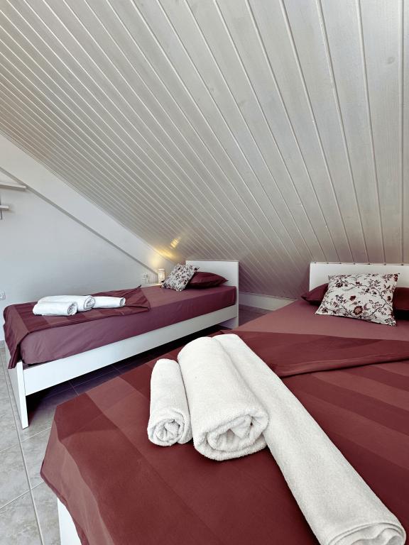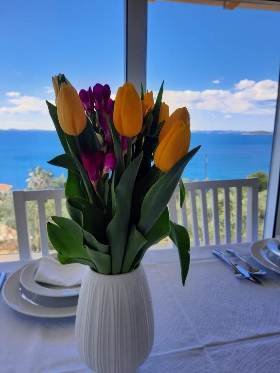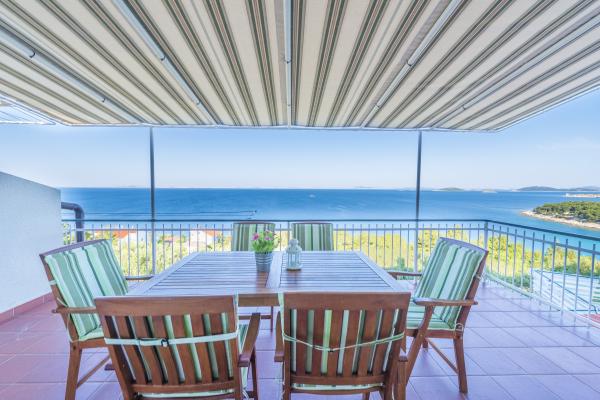 Utvivlsomt, vores lejligheder er blandt de bedste i Murter, ønskelig på grund af den smukke udsigt, attraktiv beliggenhed og komfort, men også på grund af vores åbne hjerter og gæstfrihed. Lyden af bølgerne, duften af havet og den smukke udsigt over nationalparken Kornati og Murter øhav, vil gøre din ferie smuk og uforglemmelig oplevelse for hele familien. Grønne områder, stort hus have, fred og hus kun 150 meter fra havet og strandene Saltlage er hovedårsagen vores gæster at besøge og komme tilbage hvert år. I huset er der 3 lejligheder, som er lejet. En stor lejlighed til 4 personer AP (4 1) med 2 soveværelser, stue, spisestue, køkken og badeværelse, og to mindre lejligheder med 1 soveværelse, 1 badeværelse og stue med køkken: AP 1 (2 1) og AP 2 (2 1). Hver lejlighed har en terrasse med udsigt over havet.