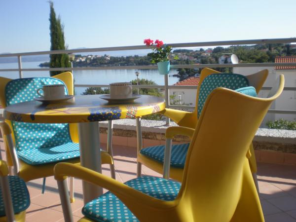 Fuldt og moderne udstyret lejlighed i umiddelbar nærhed af stenstranden. Anlægget ligger 2 minutters gang fra stranden og bymidten. Den består af en entré, to soveværelser, et badeværelse, en stue med køkken og en stor altan. Fra balkonen er der udsigt til stranden, fyrreskoven, bugten og i det fjerne øen Čiovo og byen Split. I det større soveværelse er der senge til tre personer: en stor seng til to personer og en seng til en person. Det mindre værelse er udstyret med en seng til to personer, hvis orientering gør, at gæsten kan vågne op med udsigt over havet fra sengen. Køkkenet er udstyret med alle nødvendige husholdningsapparater: køleskab, ovn, komfur, opvaskemaskine, vaskemaskine, kedel og andre køkkenredskaber. El- og kulgrill er til rådighed for gæsterne. I stuen er der stort køkkenbord, sofa og fjernsyn. Der er en offentlig parkeringsplads ved siden af lejligheden, som er gratis, men det er ikke muligt at reservere.