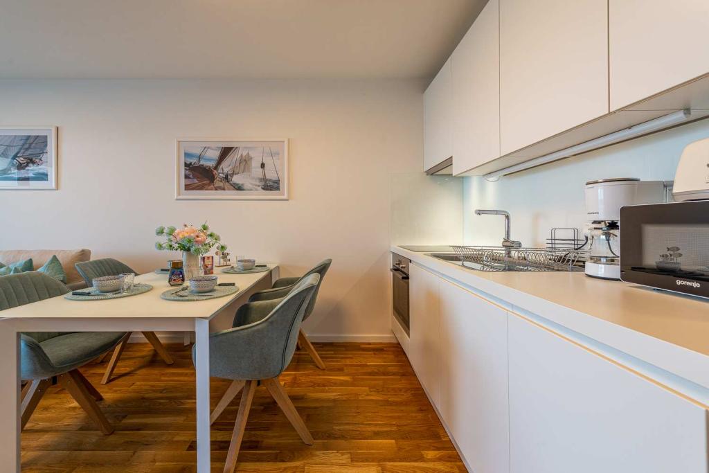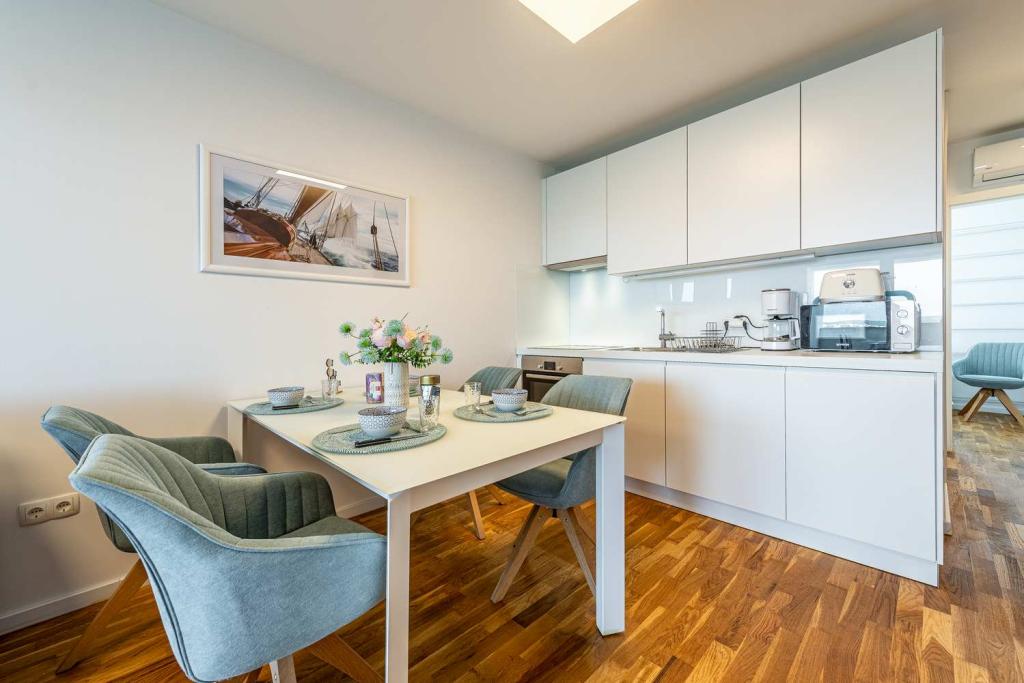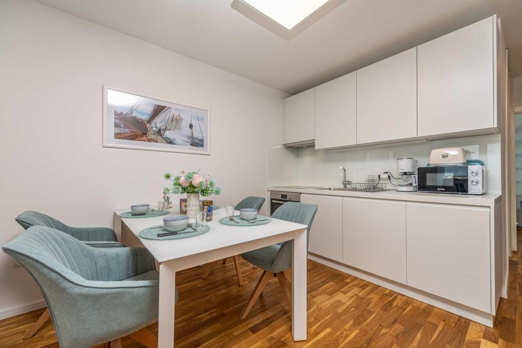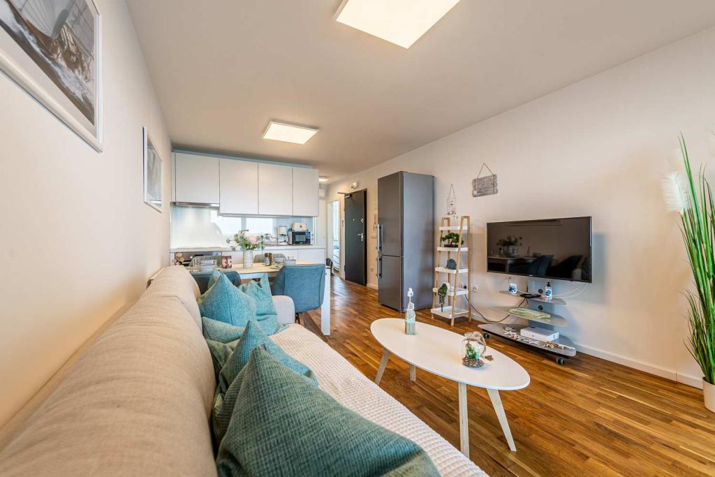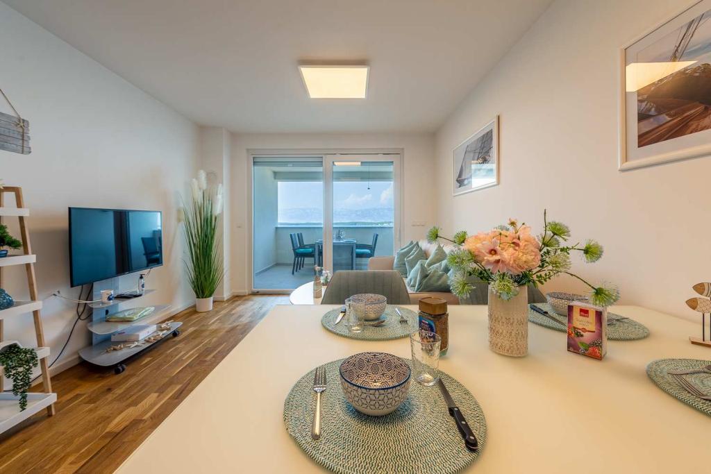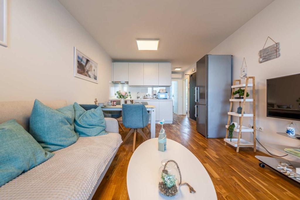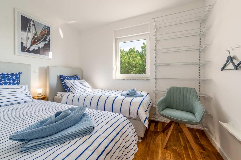 FØRSTE RÆKKE fra havet! 10 meter fra gågadestranden. 5 minutter fra den gamle bydel i Nin. Moderne lejlighed, pænt indrettet, meget veludstyret køkken (opvaskemaskine, brødrister, elkedel, elektrisk kaffemaskine, mikrobølgeovn, køleskab og fryser, ovn, 4 induktionskogeplader. 1 soveværelse med dobbeltseng + 1 soveværelse med 2 senge. bruser og vaskemaskine. Fantastisk havudsigt fra din terrasse.