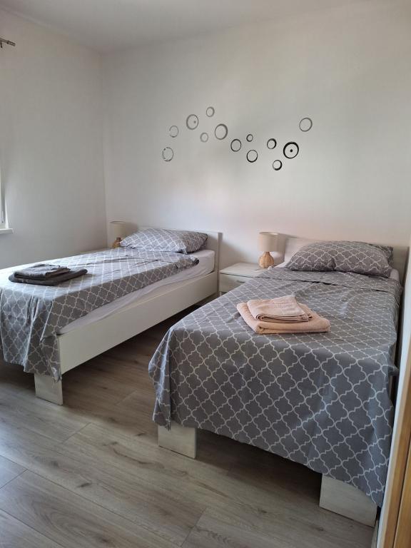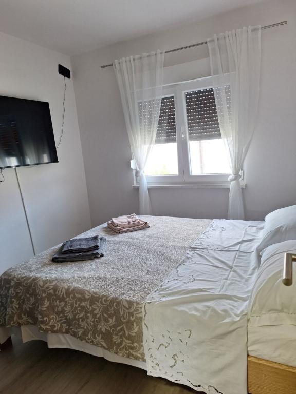 Lejlighederne ligger i Nin - bydelen Ždrijac - i et roligt område, 150 m fra stranden, dvs. 5 minutters gang, og 400 m fra byen, dvs. 10 til 15 minutters gang langs gåstien. Lejlighed 1... består af 3 værelser, hvoraf det ene er udstyret med tv, og et værelse (stue med tv og separat toilet (med vaskemaskine) og en ekstra seng), køkken med opvaskemaskine, køleskab med fryser, mikrobølgeovn, elkedel, badeværelse med bruseniche og entré og terrasse, mens der er en reserveret parkeringsplads i gården. Lejligheden er registreret til 6 personer. Lejlighed 2... består af 2 værelser, hvoraf det ene er udstyret med tv og en ekstra seng, samt køkken, badeværelse og balkon. Der er en parkeringsplads i gården. Lejligheden er registreret til 4 personer - lejlighederne har højhastighedsinternet og tv (Netflix...). A 1 er prissat højere, hvis der er mere end 4 personer. A2 er prissat højere, hvis der er 4 personer.