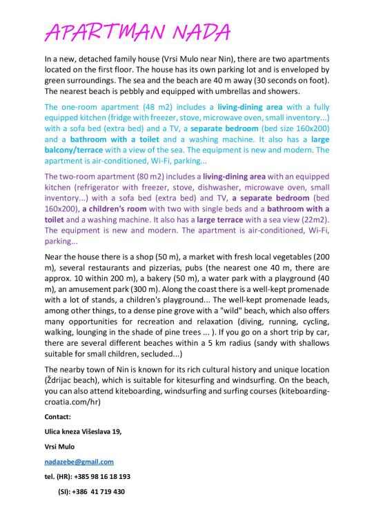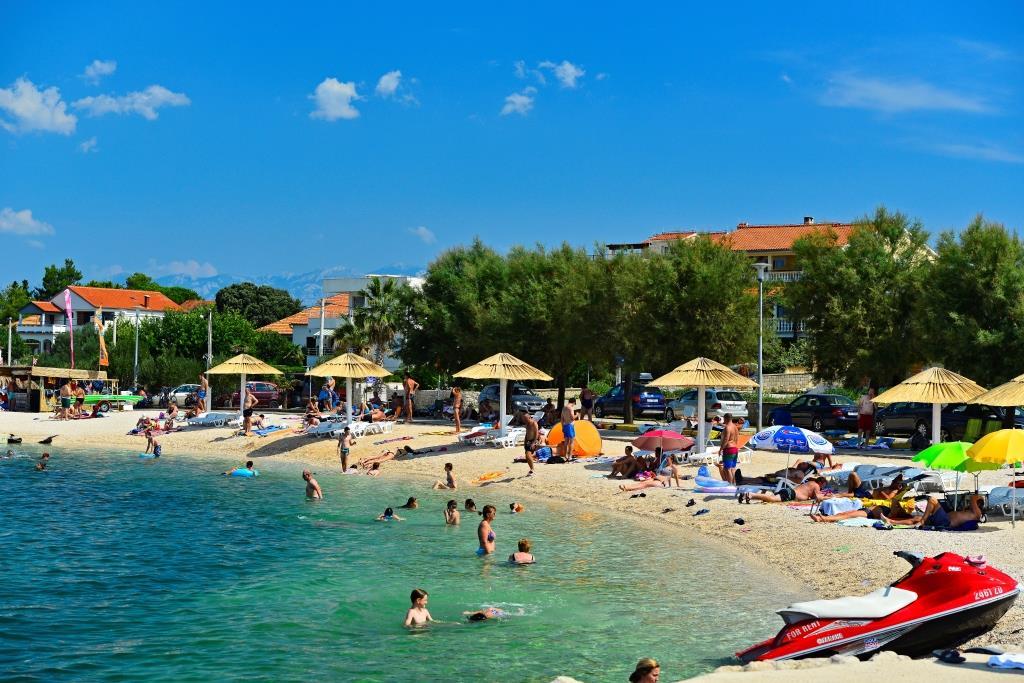 Turistskat er inkluderet i prisen. Dokumentation for reservationsbekræftelse ved reservationI nærheden af lejligheden er der en butik (50 m), et marked (200 m), flere restauranter, pizzeriaer og barer. Hvis du ikke vil lave mad, kan du bestille et færdiglavet måltid til huset. Til de unges underholdning er der et vandland med en legeplads (40 m), en forlystelsespark (300 m). En promenade med boder, en legeplads og et rekreativt hjørne er arrangeret langs kysten. Promenaden fører ind i en tæt fyrreskov med "vilde" strande, der også byder på adskillige muligheder for rekreation og afslapning (dykning, jogging, cykling, gåture eller ligge i skyggen af fyrretræer...). Det bredere område har 34 km forskellige strande - sandede, småsten, stenet, mange skjulte bugter og skygge i fyrreskoven. Nin, som ligger i nærheden, er kendt som en gammel by med romerske levn, og har også områder med helbredende mudder til kiteboarding. Det bredere område har velholdte cykelstier. Udflugter til nationalparken Kornati, Telaščica, Zrmanja, Paklenica samt kortere udflugter i omgivelserne arrangeres fra vores sted.