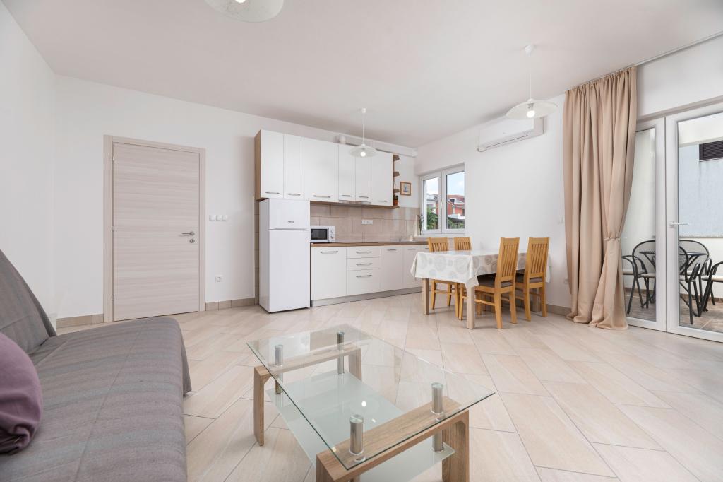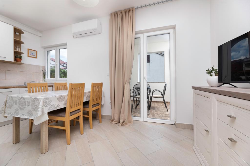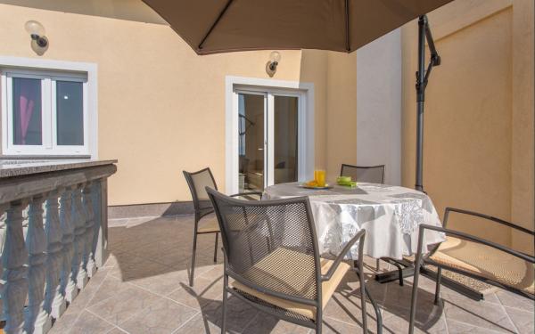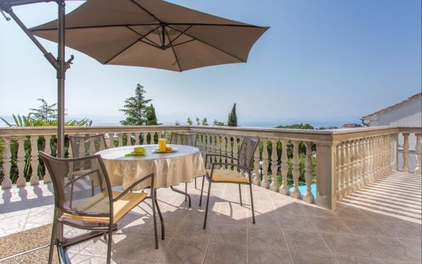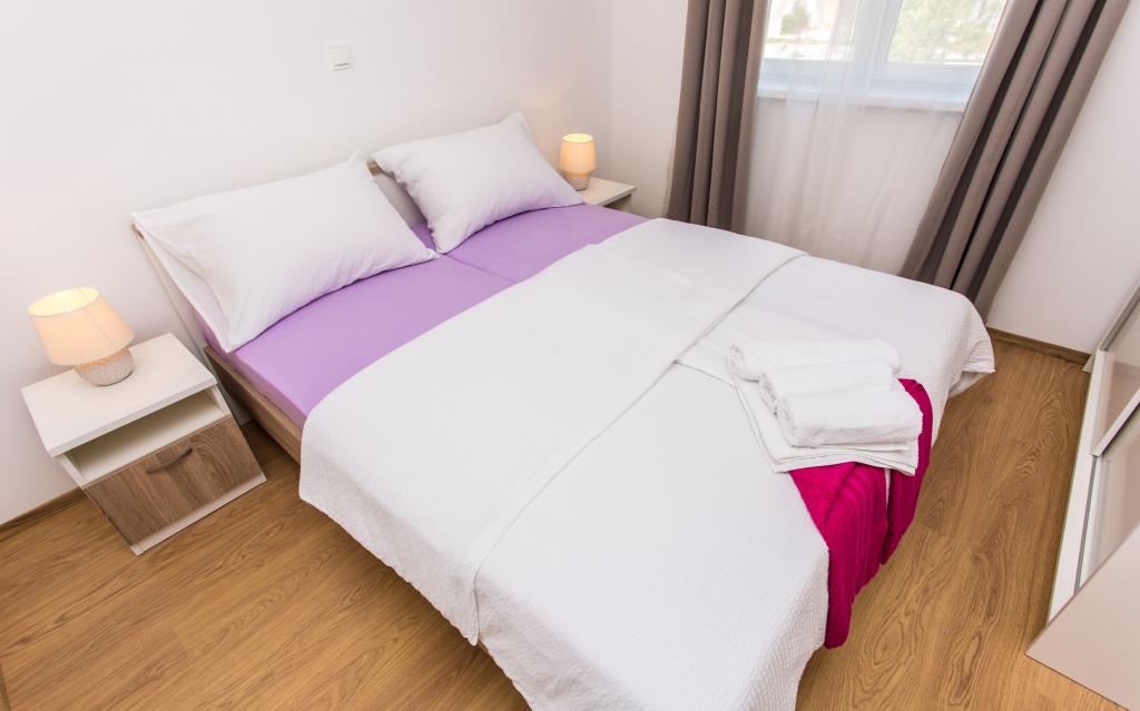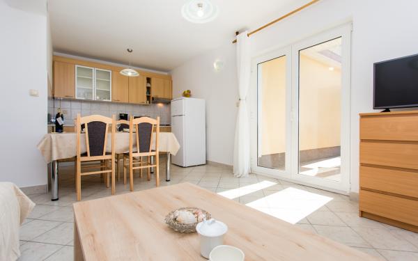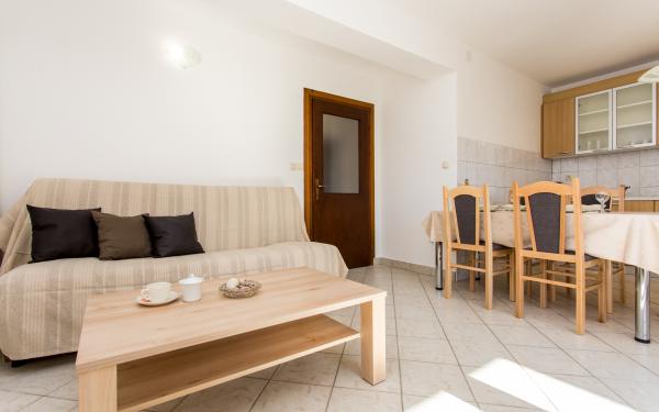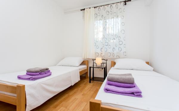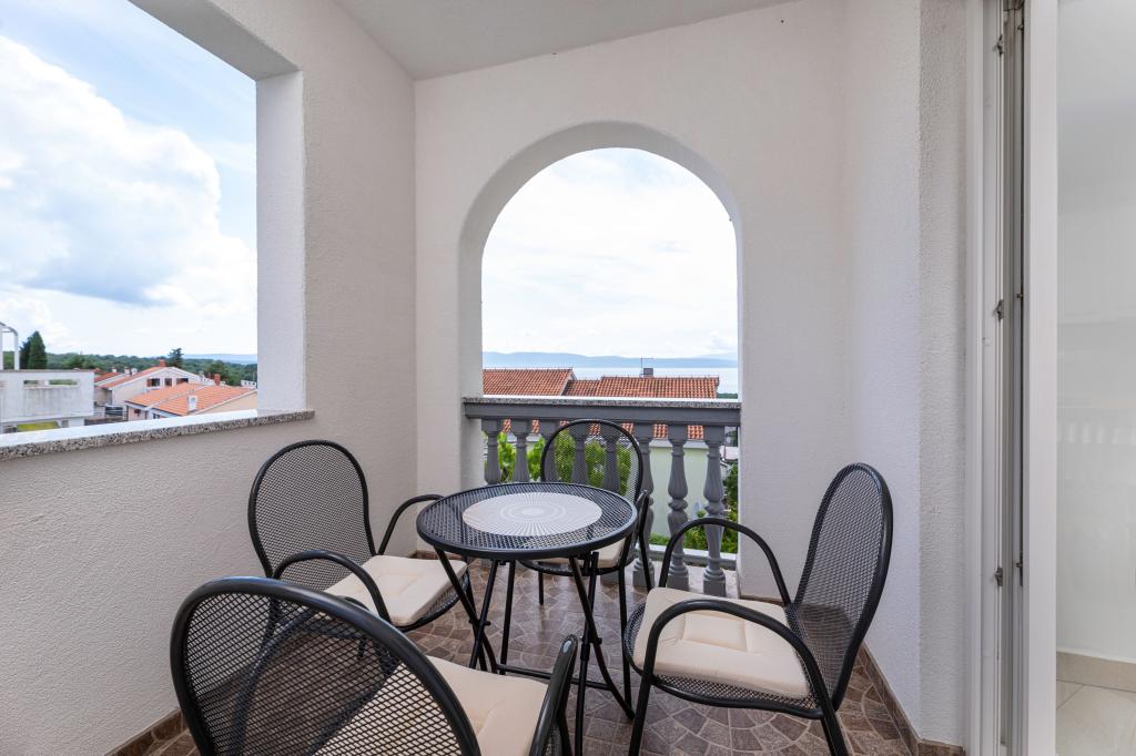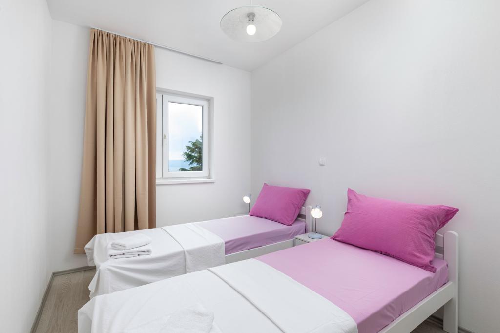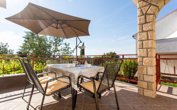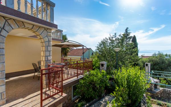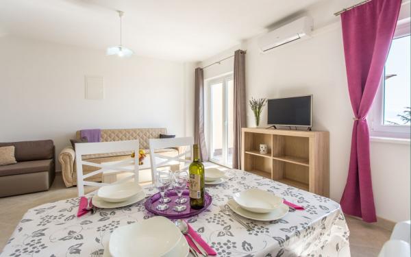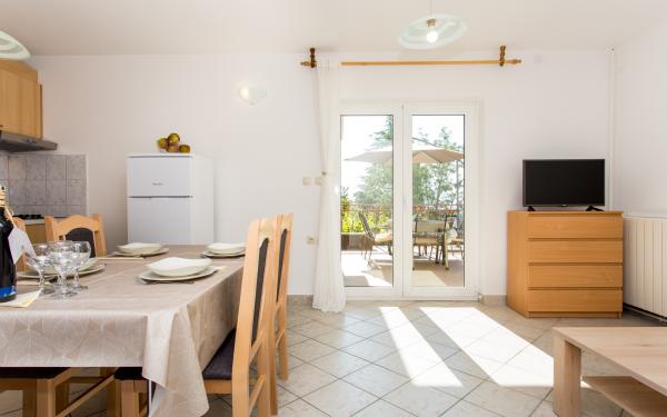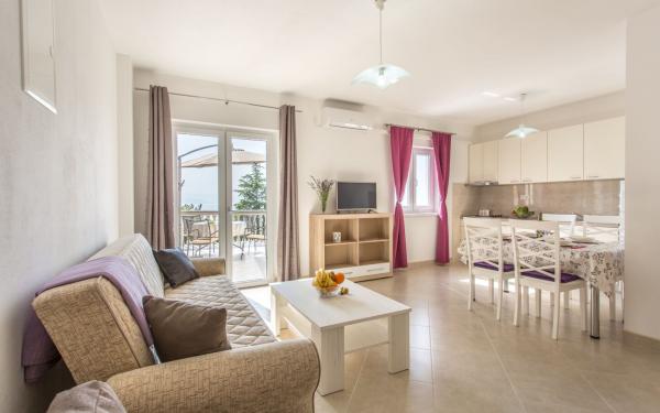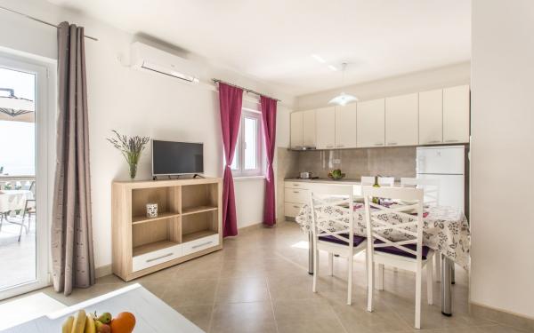 Tre fuldt udstyrede lejligheder i et familiehus. Hver lejlighed har en separat indgang udefra. Lejlighederne ligger på husets første og anden sal og har hver en overdækket terrasse med udsigt over havet. Sikret parkeringsplads i haven. Kijac strand ligger 600 m fra ejendommen og har en smuk promenade langs havet i retning mod Njivica eller Malinsko. Perfekt til let rekreation og familie, vandreture eller cykling. Anlægget ligger på en bakke, og det tager 10 minutter at gå til stranden.