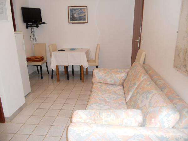 Meget flot ældre par, lejligheder store, spotlessly ren, meget godt rustet. Meget komfortable senge. Masser af kabinetter. Stort køleskab med fryseboks. Mikroovn. Hver lejlighed har en overdækket terrasse, som er meget cool og komfortabel, kan du spise et måltid i skyggen. Meget køligt sted at kommandere især med unge børn, køkken fuldt udstyret (gryder, pander, bestik, tallerkner, pander, skærebrætter -du kan tilberede måltider selv). Der er ingen aircondition, som jeg betragter som en plus, især for vores struber, og lejlighederne er cool, skulle du bare huske at vende det blinde blinds. Udgangene af lejlighederne på haven, væk fra gaden (vigtigt for børn). Overdækkede parkeringspladser. Jeg anbefaler virkelig til alle !!!!!!!