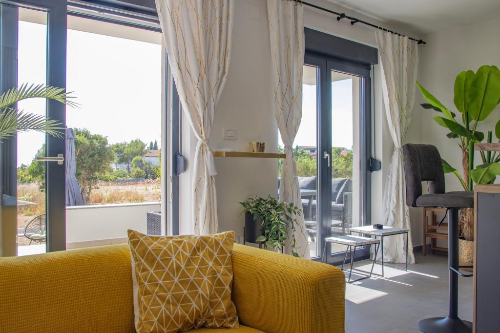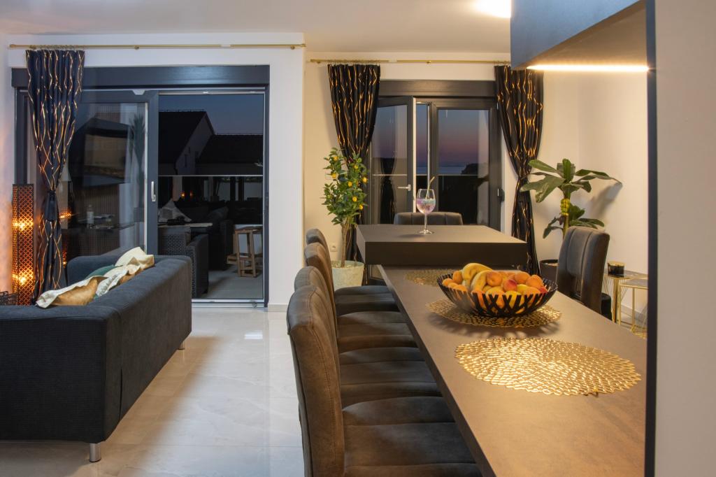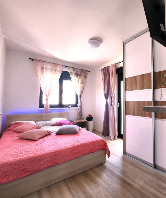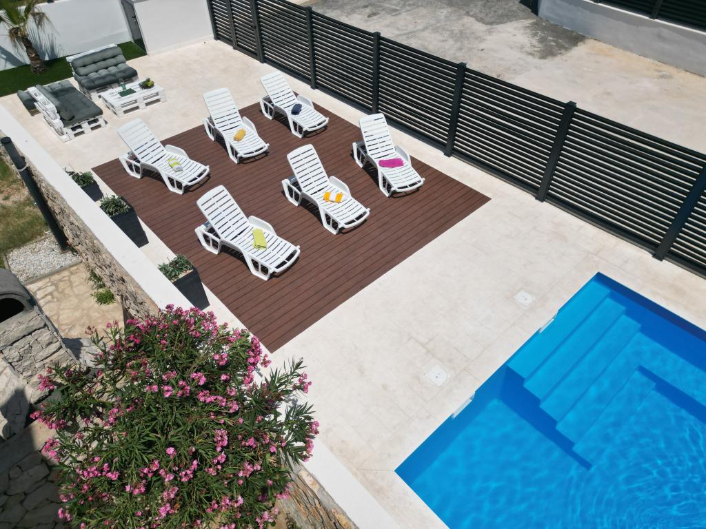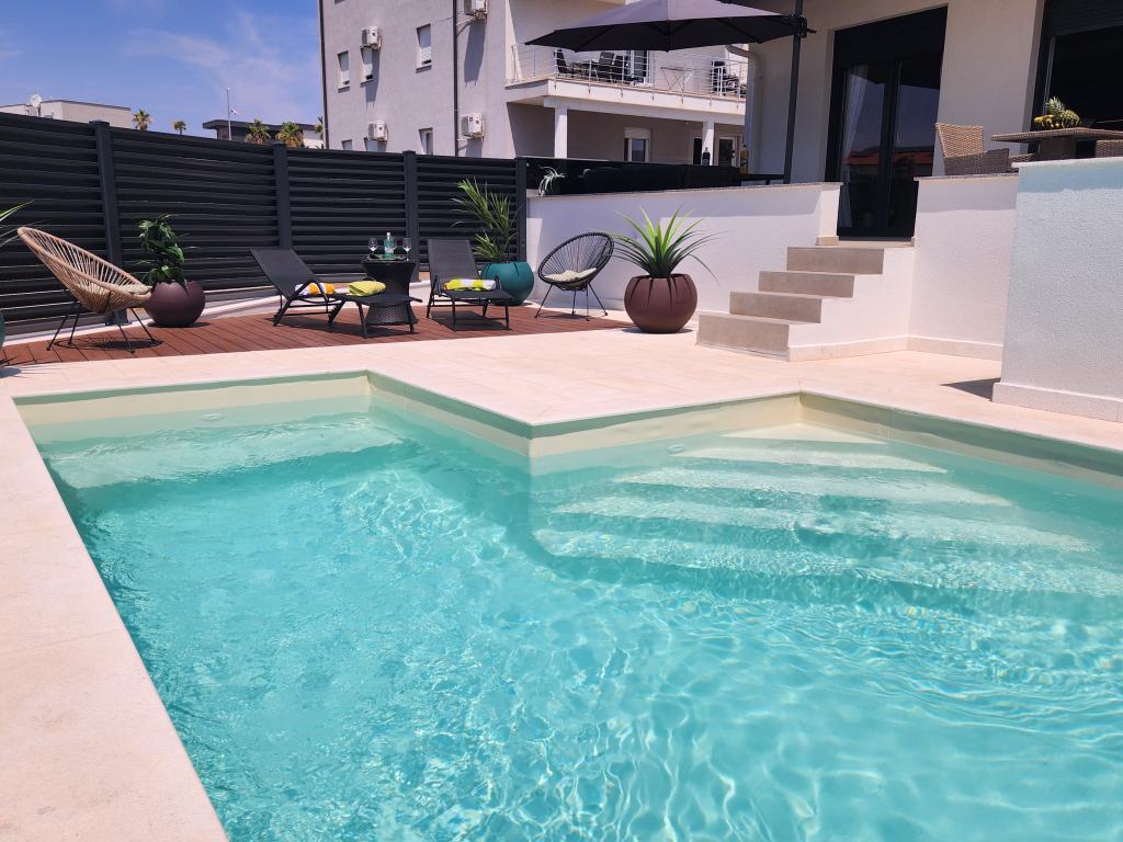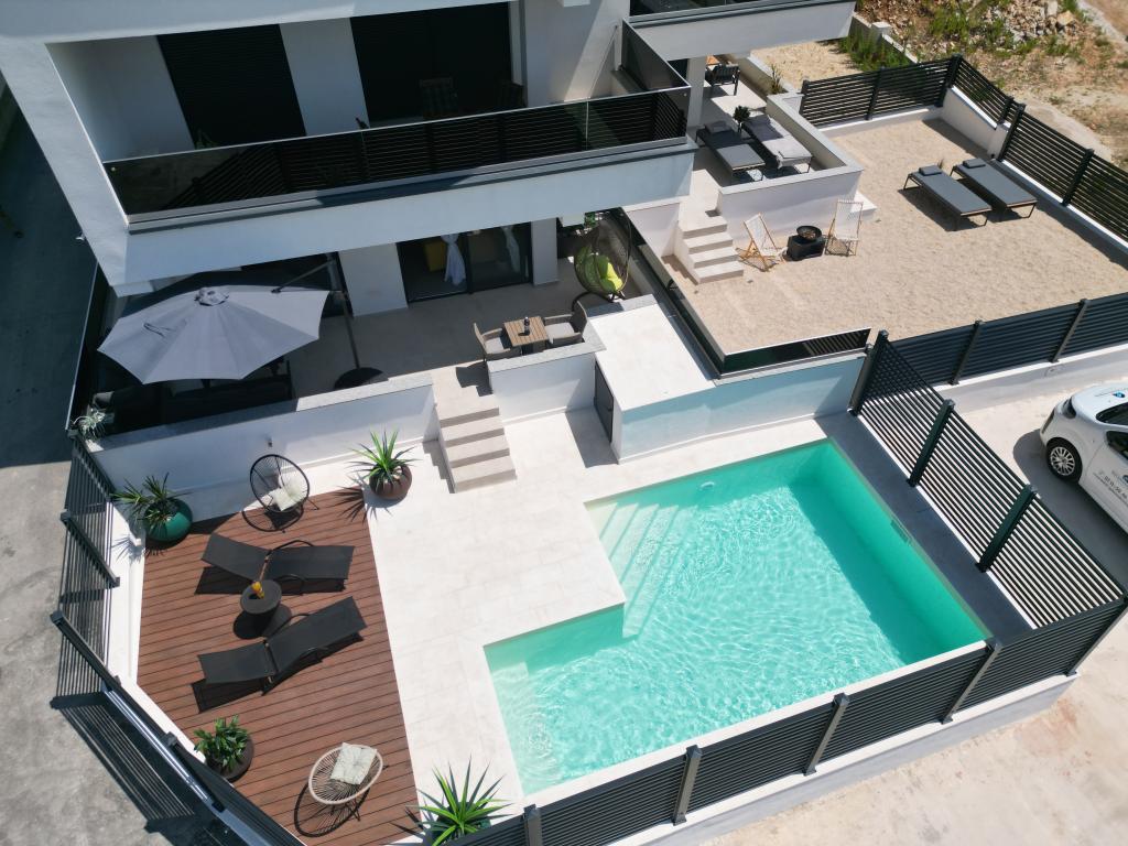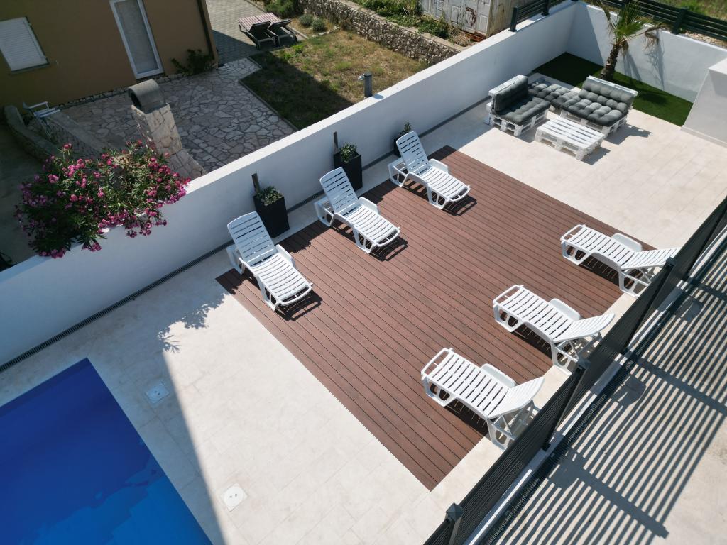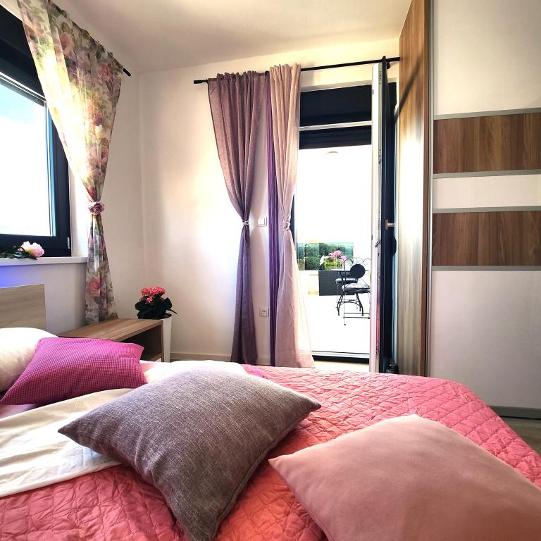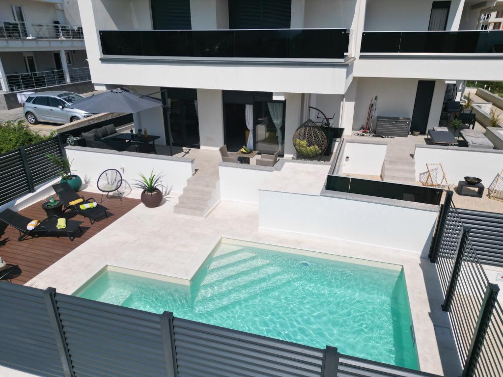 Calma Apartments er beliggende i en rolig beliggenhed i Novalja, og hver lejlighed har sin egen private pool. De ligger kun 900 m fra centrum, så du kan nyde stilheden og være tæt på alle de faciliteter denne by har at byde på. Mindre end 10 minutters kørsel til festivalen - 2,4 km fra spillestedet. Der er en shuttlebus ved busstationen, der går direkte til Zrće-stranden. Lejlighederne er beliggende i en ny moderne bygning (med 8 lejligheder). Vi tilbyder 2 lejligheder, hvoraf den ene er A4+2 og den anden A6+4, hver af disse lejligheder har sin egen private pool. Hver lejlighed har aircondition og har gratis Wi-Fi, SAT/TV, et veludstyret køkken, stue, soveværelser og et badeværelse. Lejligheder til 6-10 personer - plus en person mere hvis nødvendigt - har også alle de samme betingelser. Lejlighederne har smukke terrasser eller altaner med udsigt over havet og byen, udstyret med siddemøbler.