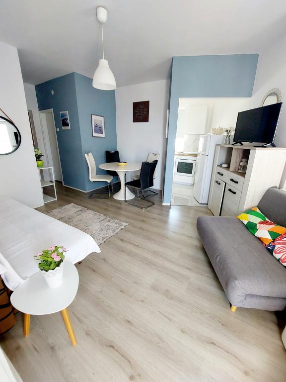 Vi boede i lejligheden i en uge. Meget venlig vært, altid tilgængelig. Lejligheden er luftig, pænt dekoreret, veludstyret, ren og har alt hvad du behøver for at føle dig godt tilpas. Stranden og promenaden er meget tæt på, centrum er ca. 10 minutter til fods. Der er flere caféer og restauranter i nærheden. Alle anbefalinger