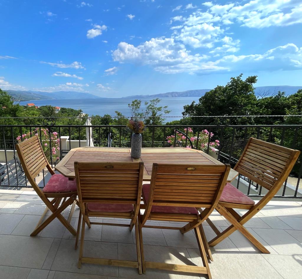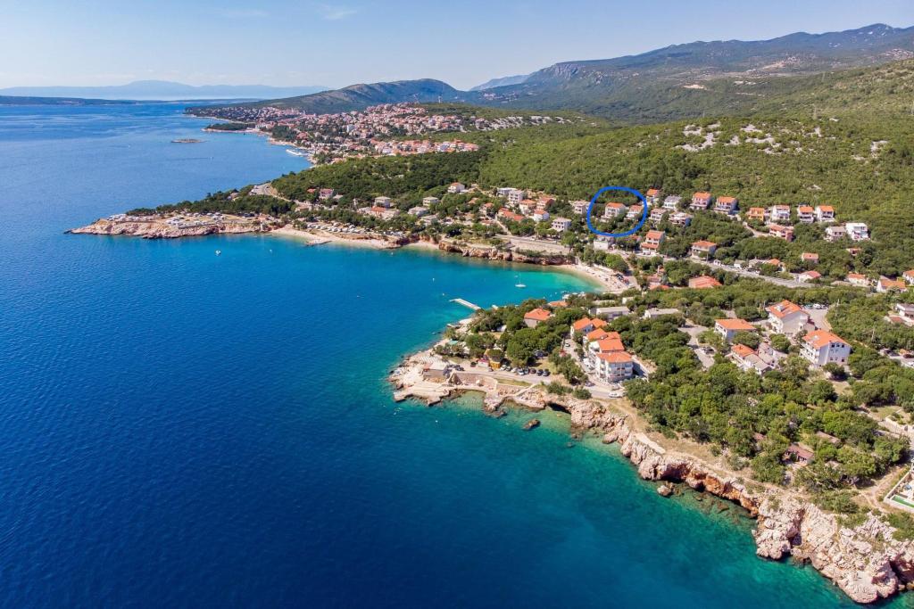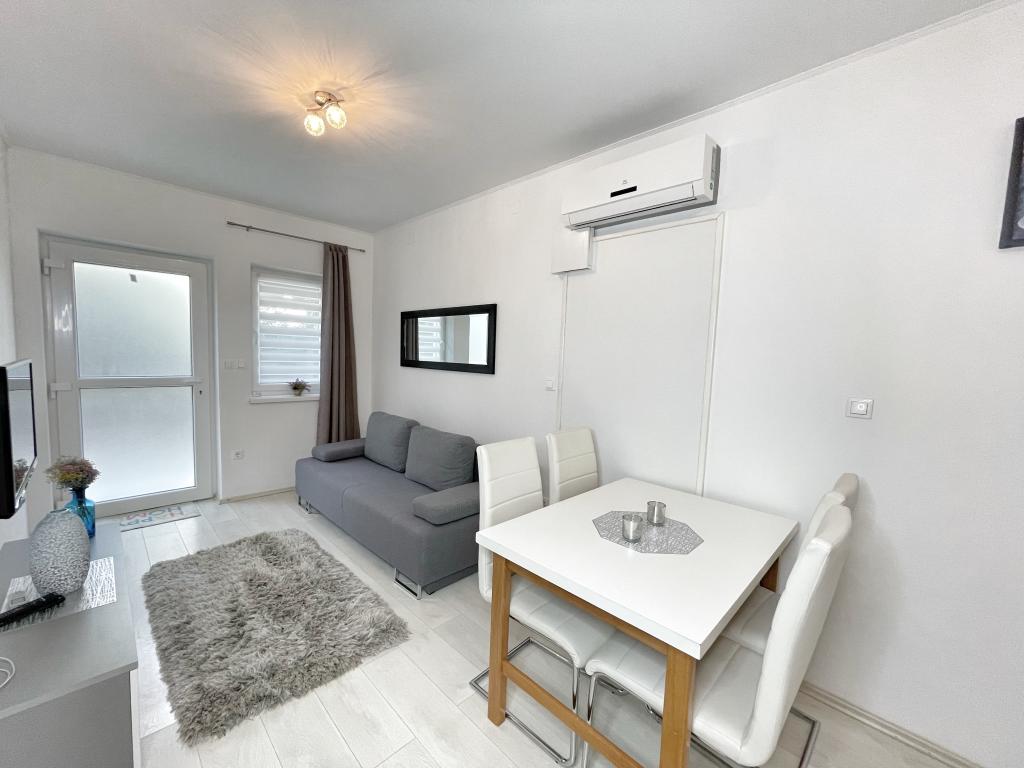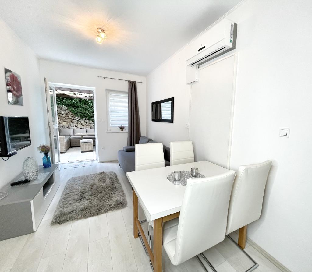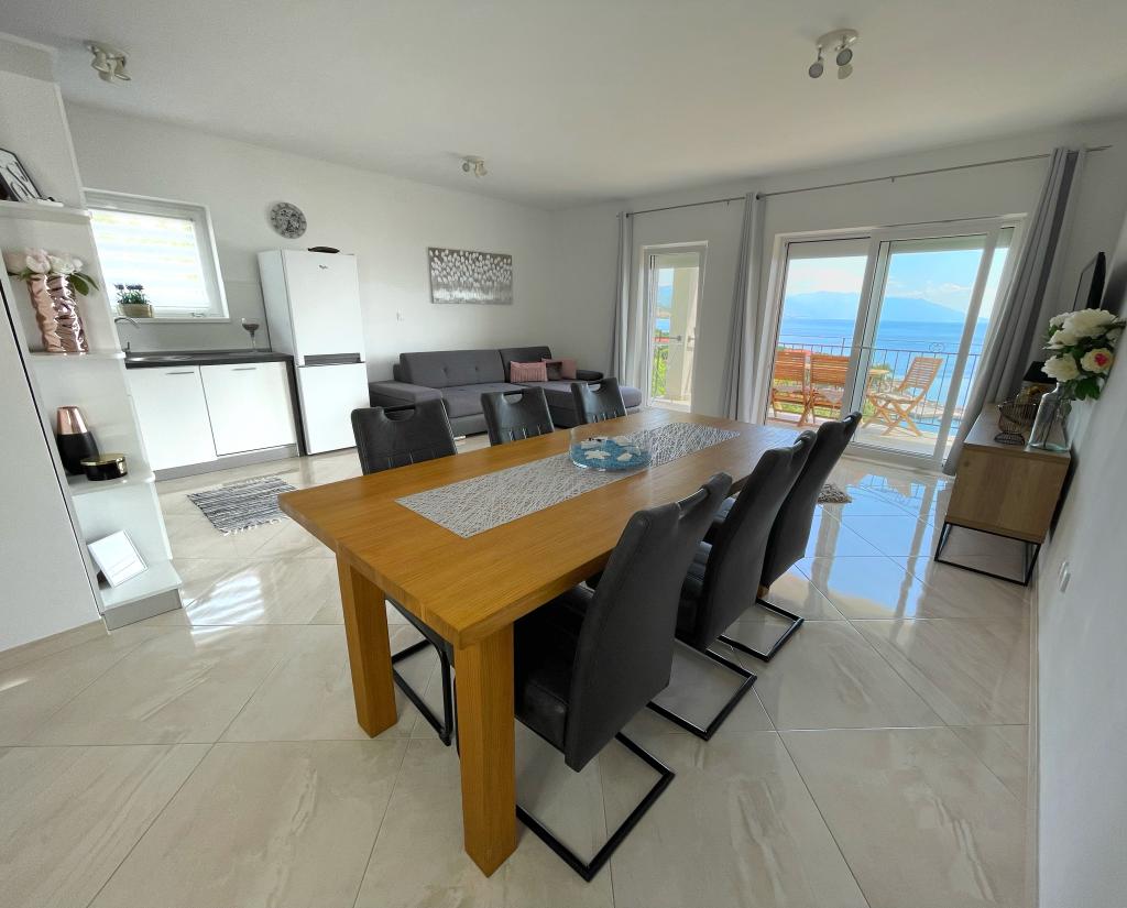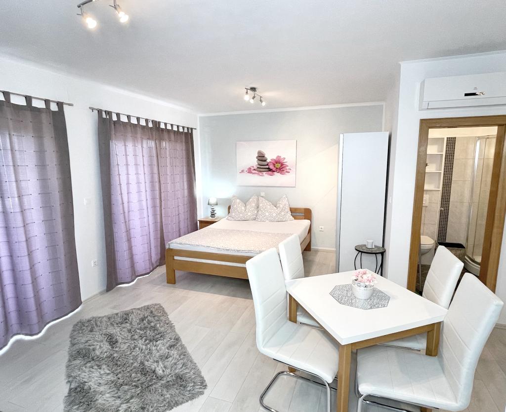 Beliggende i en rolig del af Novi Vinodolski - Povila, kun 60 m fra stranden, vil fuldt udstyrede familielejligheder med aircondition og sikker parkeringsplads i gården give dig en uforglemmelig ferie. Selvfølgelig - internettet er hurtigt og ubegrænset. Slap af på en af de to grillterrasser eller nyd solnedgangen på terrassen med liggestole. Du drikker din morgenkaffe med udsigt over havet.