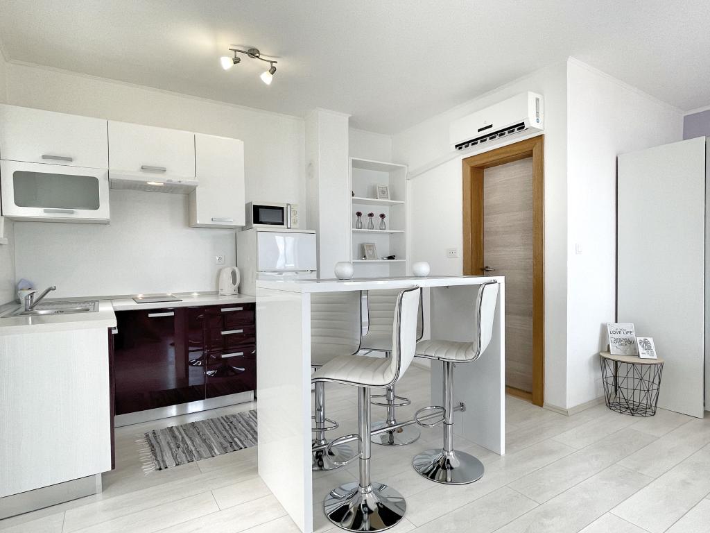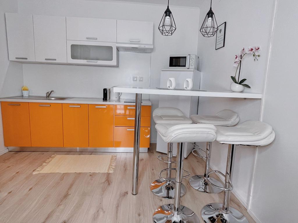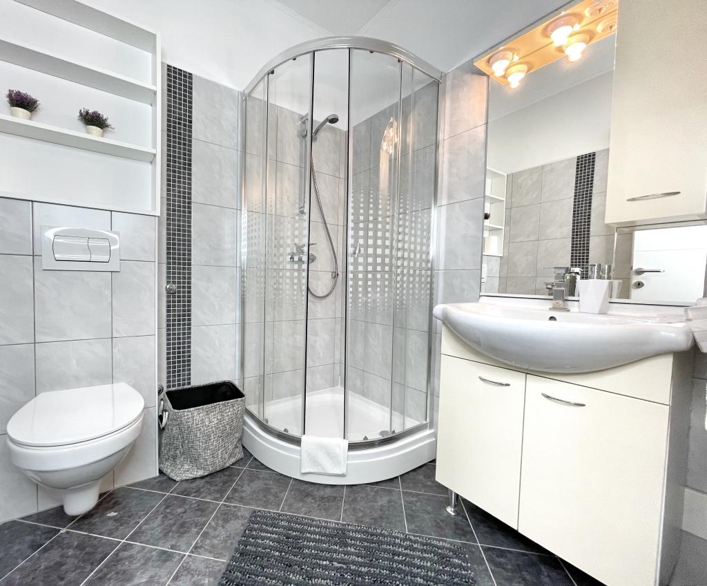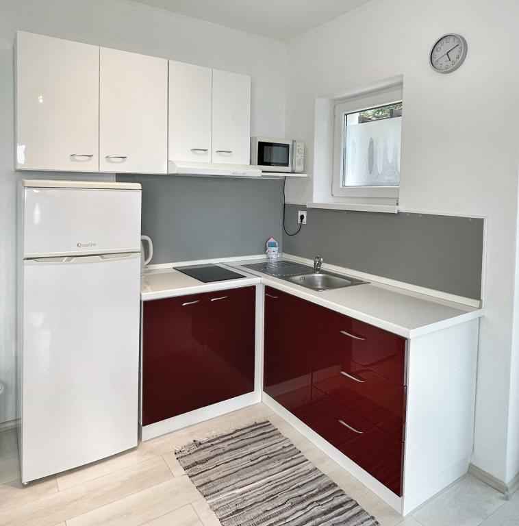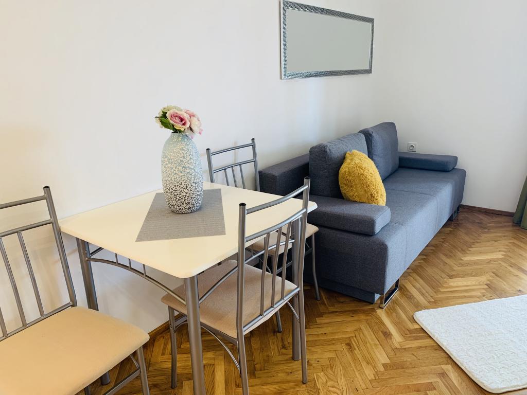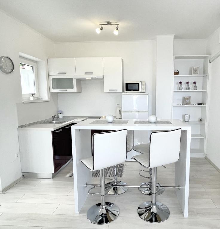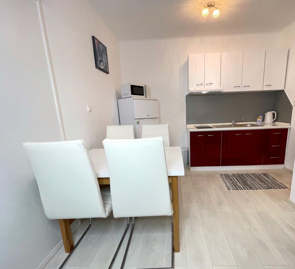Beliggende i en rolig del af Novi Vinodolski - Povila, kun 60 m fra stranden, vil fuldt udstyrede familielejligheder med aircondition og sikker parkeringsplads i gården give dig en uforglemmelig ferie. Selvfølgelig - internettet er hurtigt og ubegrænset. Slap af på en af de to grillterrasser eller nyd solnedgangen på terrassen med liggestole. Du drikker din morgenkaffe med udsigt over havet.
