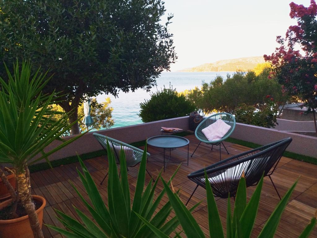 Enebolig med to separate lejligheder, der kan lejes separat eller sammen. Lejlighederne er placeret på stranden (1. række), og de udvendige trapper fører direkte til stranden. Det er mindre end 30 m væk fra havet med store balkoner med en smuk udsigt over havet og øerne. En butik, en restaurant og en café ligger 15 minutters gang væk, så stedet giver fuldstændig privatliv og fred.