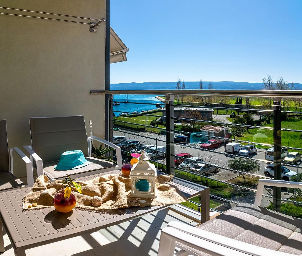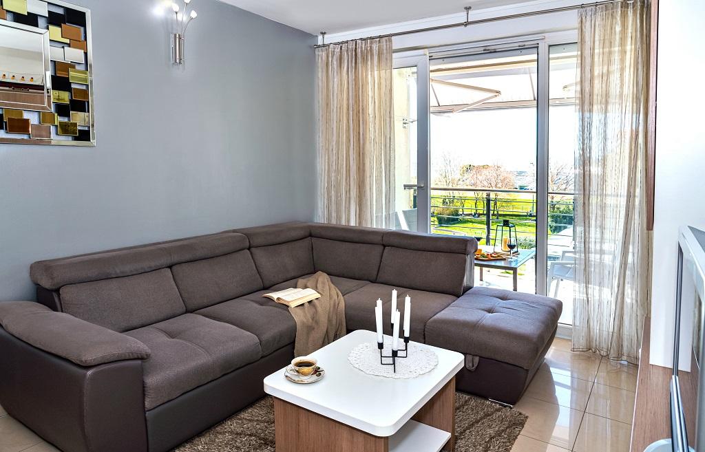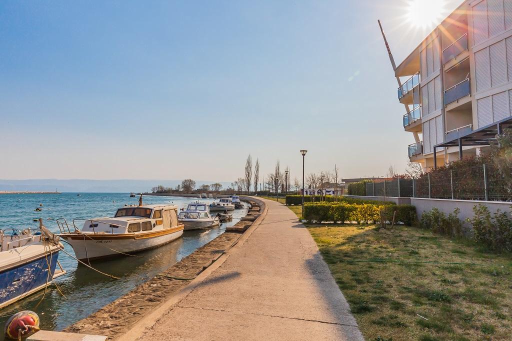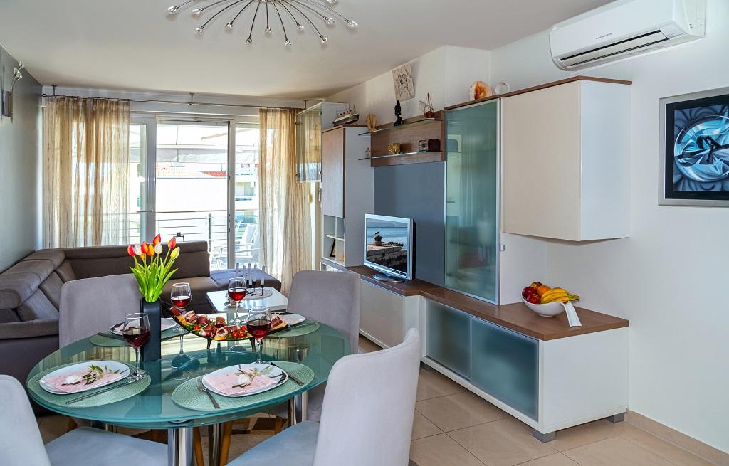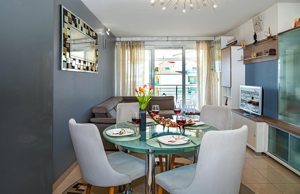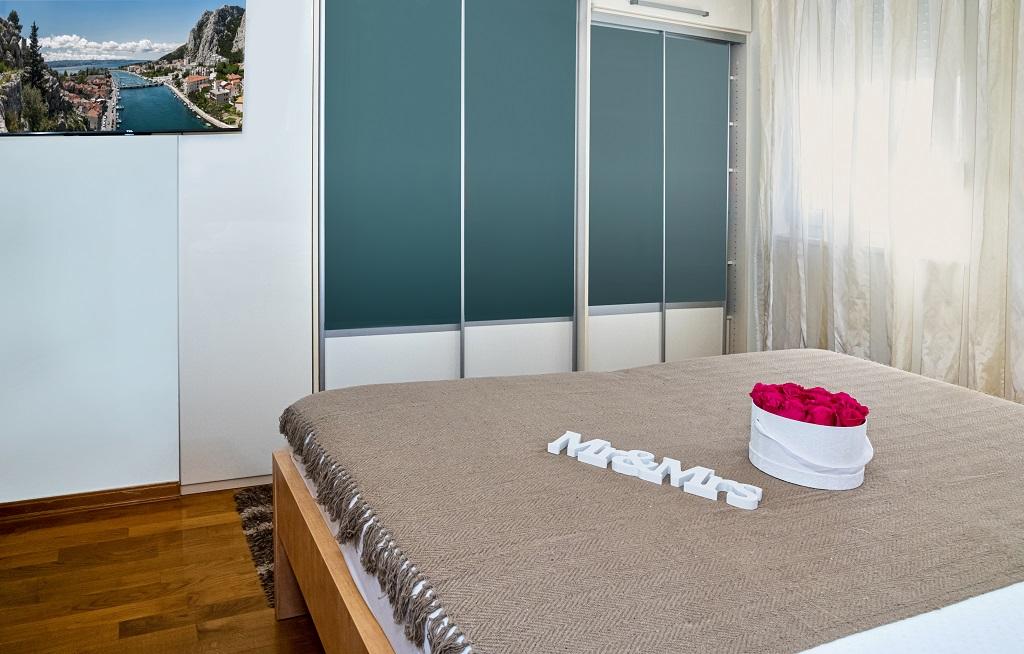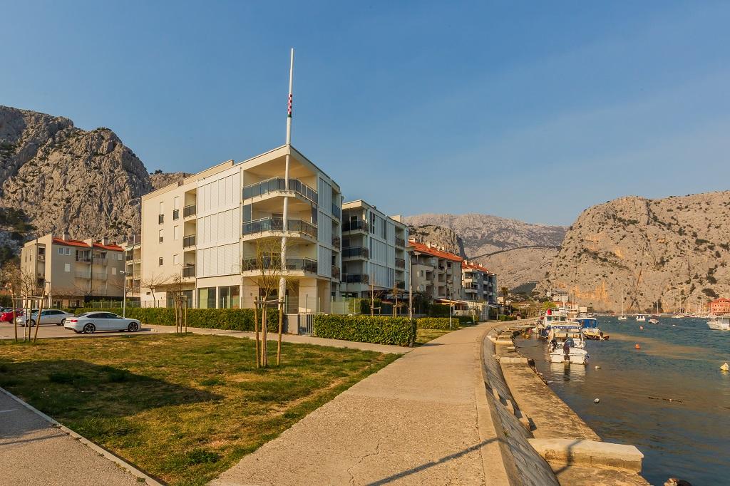 En ny, moderne lejlighed i umiddelbar nærhed af Cetina-floden og Adriaterhavet. Med 65 m2 boligareal kan den komfortabelt rumme op til 4+1 personer, og altanen byder på udsigt over floden og Cetina-mundingen. Lejligheden ligger på tredje sal. Bygningen har elevator. Lejligheden består af to soveværelser, et badeværelse, et veludstyret køkken med spiseplads, en stue og en overdækket balkon med udsigt over floden. Det første soveværelse har en stor seng (180 x 200) til 2 personer, natborde og opbevaringsplads til dit tøj og bagage. Det andet soveværelse har to senge (90 x 200) til 2 personer, natborde og opbevaringsplads til dit tøj og bagage. Begge soveværelser er lyse og har masser af naturligt lys gennem ovenlysvinduet. Soveværelserne har aircondition. Den består af en stue og en spisestue i ét rum, og et meget moderne, åbent køkken. Der er også et nyt køkken med de nyeste hvidevarer, herunder en 4-brænder elektrisk kogeplade, elektrisk ovn, køleskab, fryser, elkedel og alt det service, der er nødvendigt til selvforplejning. Lige ved siden af køkkenet er en spisestue med bord til 4 personer. Der er også opholdsstue med tv, elegant sovesofa og sofabord. Det har tv og Wi-Fi. Køling og varme i stue og køkken med aircondition. Glasskydedøre i stuen åbner direkte ud til altanen. Balkonen har panoramaudsigt over floden og havet. Kommer du i bil, er der en offentlig byparkering omkring bygningen. Vores lejlighed ligger 500 meter fra byen Omiš, som faktisk kun ligger 5 minutters gang fra vores sted. Sandstranden (500 meter væk) er et par minutters gang væk.