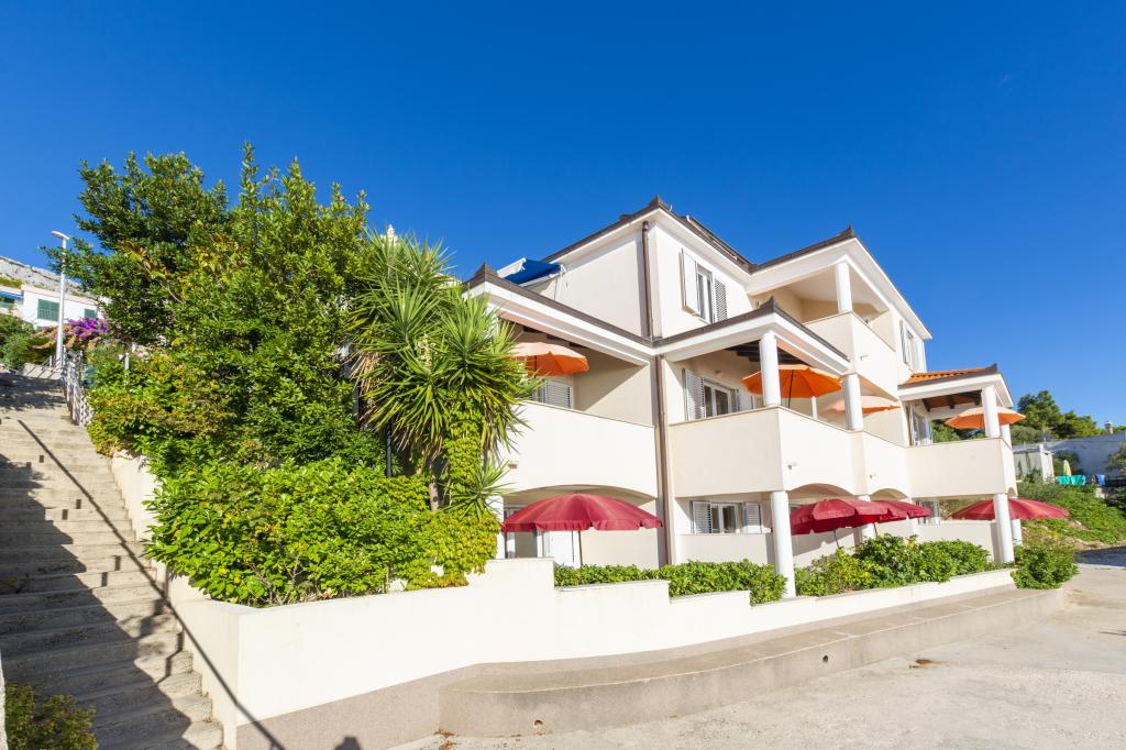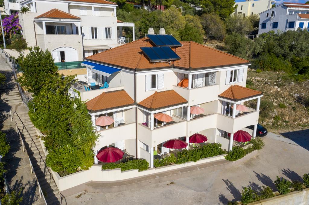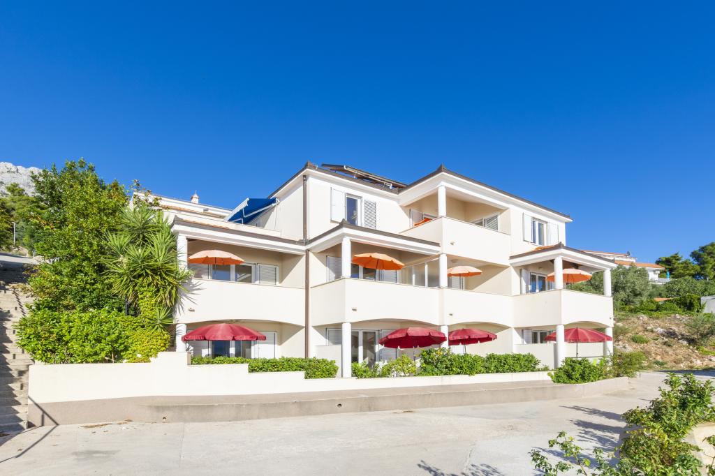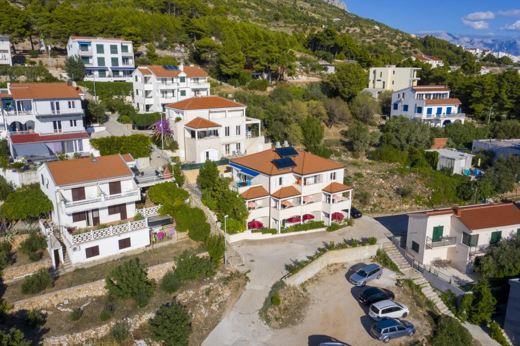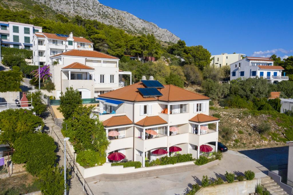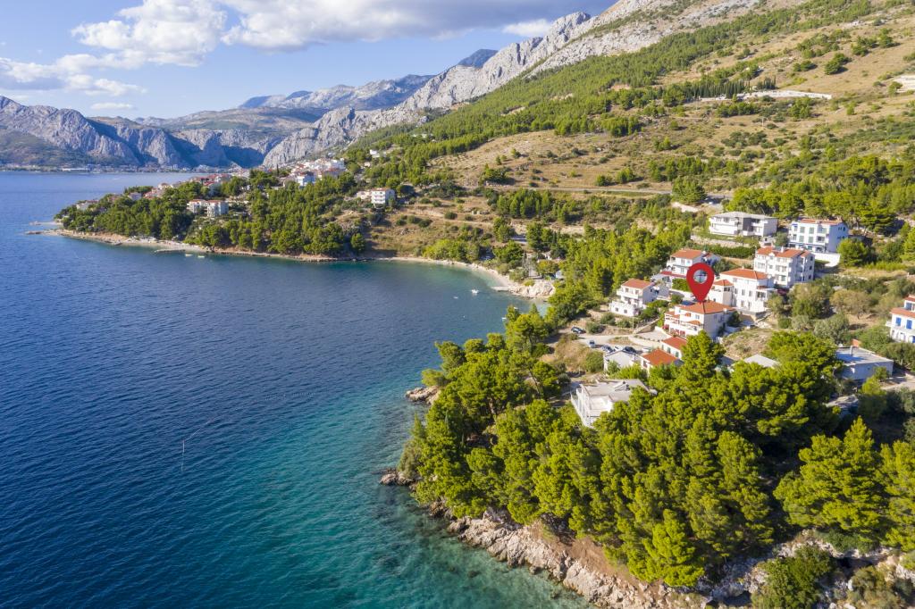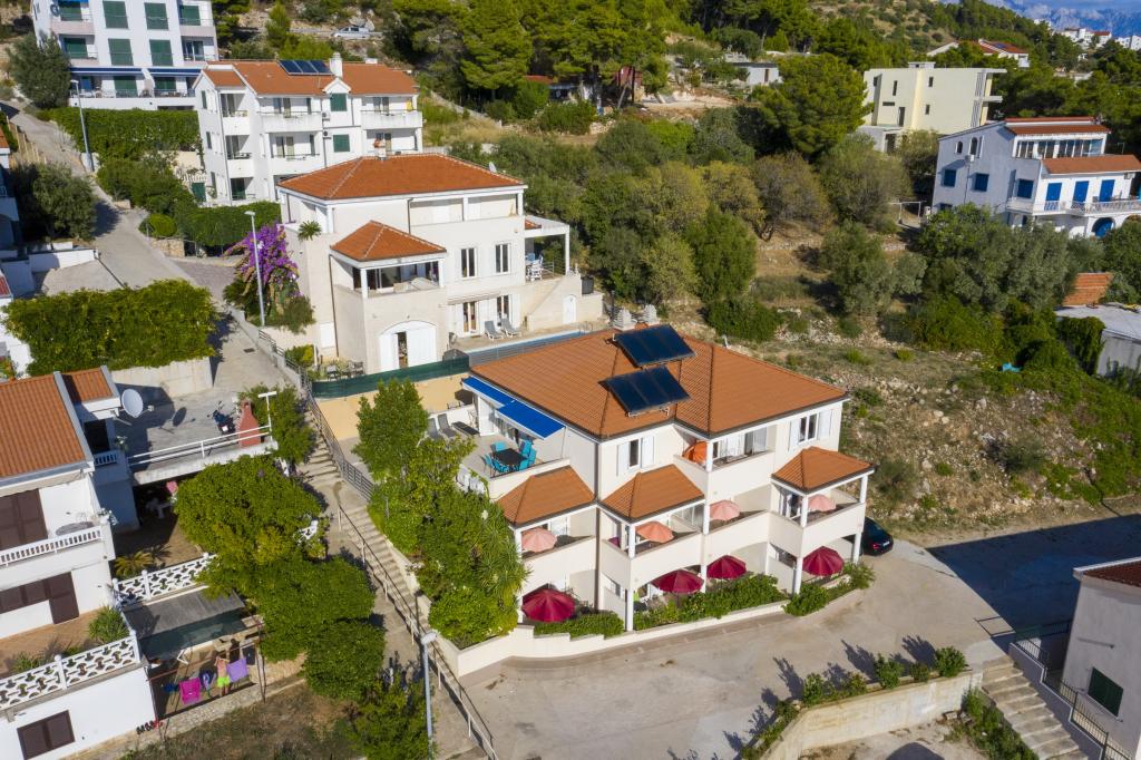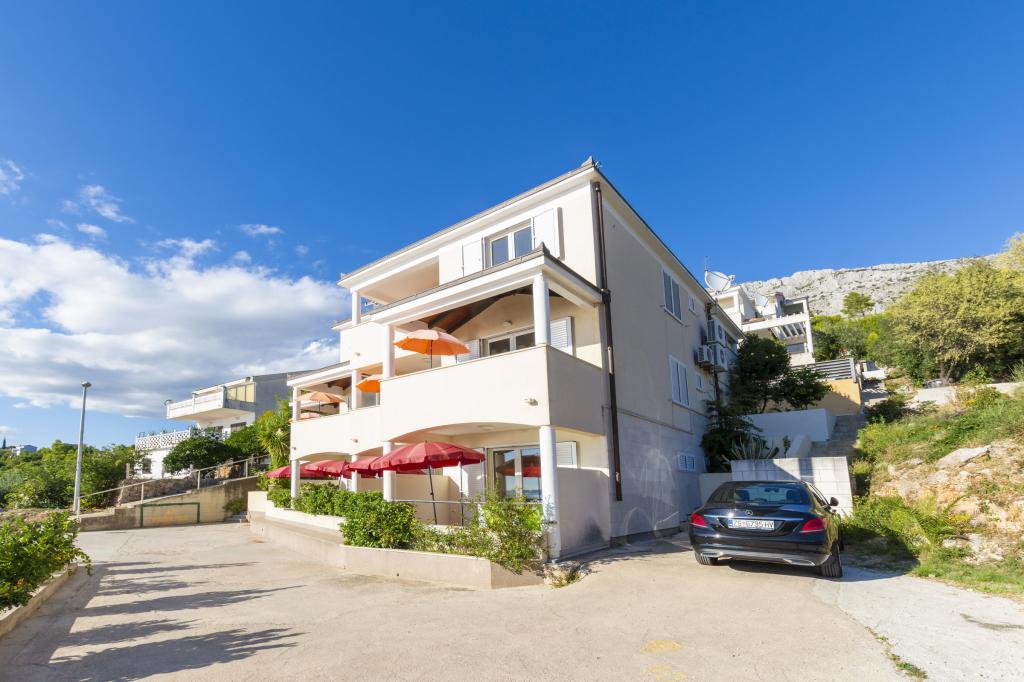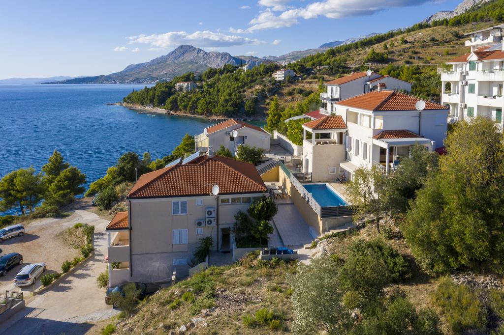 Indkvartering i nybyggede, yderst komfortable og veludstyrede lejligheder. Anlægget ligger 3 km fra Omiš centrum. I alt otte lejligheder, beliggende i første række til havet. Alle lejligheder har store terrasser med udsigt over havet og øen Brač. Parkeringspladser lige ved siden af villaen. Lejlighederne ligger nedenfor hovedvejen (300 meter), lige ved siden af havet og en stor stenstrand. Der er fire typer lejligheder, -- type 2+2 med et separat soveværelse med dobbeltseng og en stue med to senge, -- derefter lejligheder type 2+2 stort studio, -- store luksuslejligheder, type 4+2, med to dobbeltværelser og en stor stue med to udtrækssenge og -- stor de lux. lejlighed, type 14+2, i virkeligheden en villa i tre etager, 300m2 i areal, med en 9x4 meter swimmingpool med opvarmet vand, med syv dobbeltværelser, to store stuer med balkoner og terrasser, fire badeværelser, separat toilet, udendørs grill, sauna og fitnesscenter osv. Poolen bruges udelukkende af lejlighed A 14+2. De andre lejligheder gør ikke.