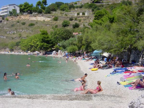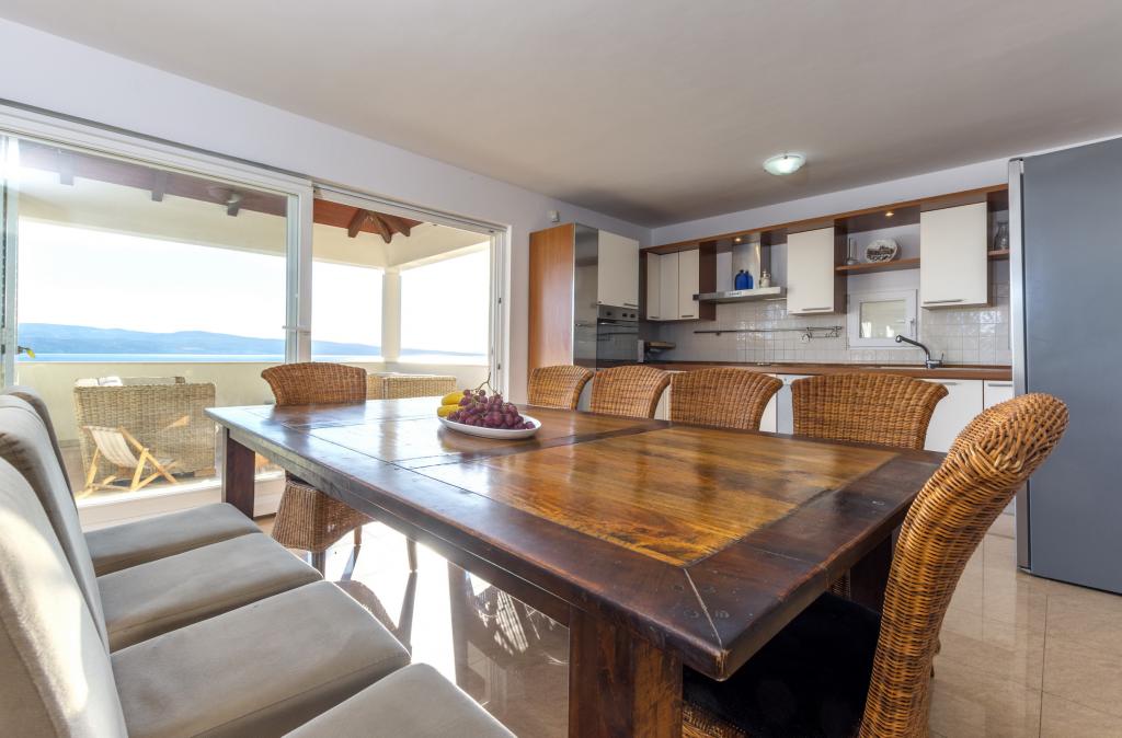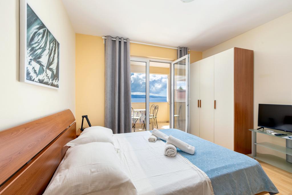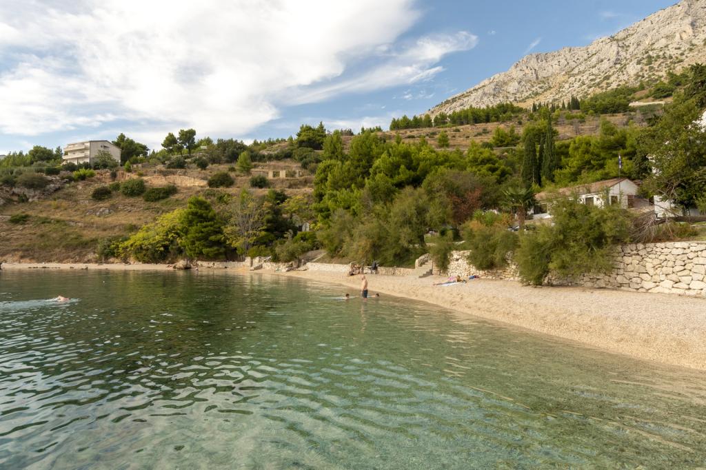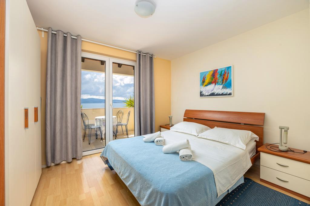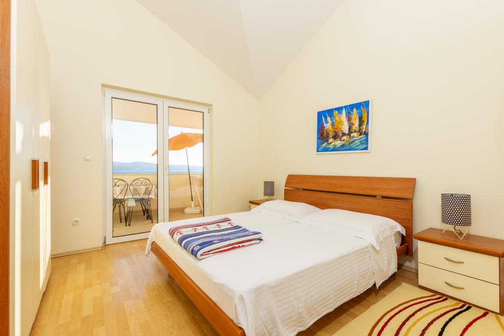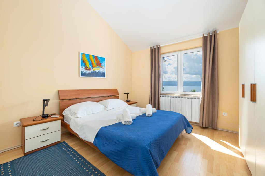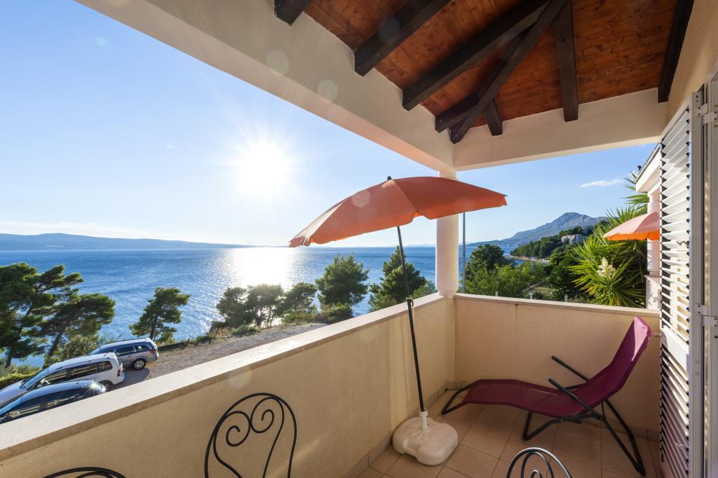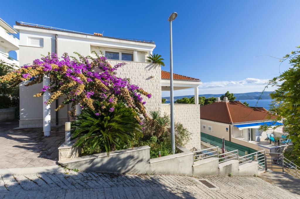Indkvartering i nybyggede, yderst komfortable og veludstyrede lejligheder. Anlægget ligger 3 km fra Omiš centrum. I alt otte lejligheder, beliggende i første række til havet. Alle lejligheder har store terrasser med udsigt over havet og øen Brač. Parkeringspladser lige ved siden af villaen. Lejlighederne ligger nedenfor hovedvejen (300 meter), lige ved siden af havet og en stor stenstrand. Der er fire typer lejligheder, -- type 2+2 med et separat soveværelse med dobbeltseng og en stue med to senge, -- derefter lejligheder type 2+2 stort studio, -- store luksuslejligheder, type 4+2, med to dobbeltværelser og en stor stue med to udtrækssenge og -- stor de lux. lejlighed, type 14+2, i virkeligheden en villa i tre etager, 300m2 i areal, med en 9x4 meter swimmingpool med opvarmet vand, med syv dobbeltværelser, to store stuer med balkoner og terrasser, fire badeværelser, separat toilet, udendørs grill, sauna og fitnesscenter osv. Poolen bruges udelukkende af lejlighed A 14+2. De andre lejligheder gør ikke.