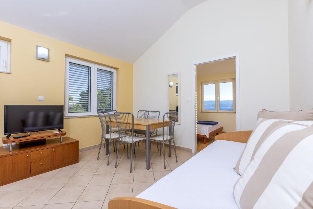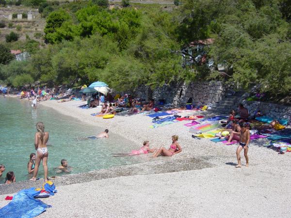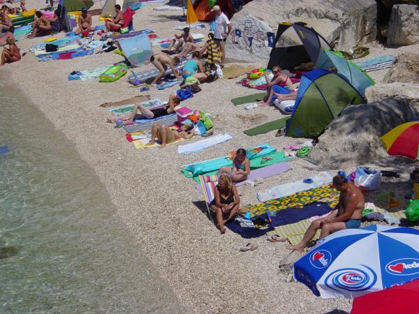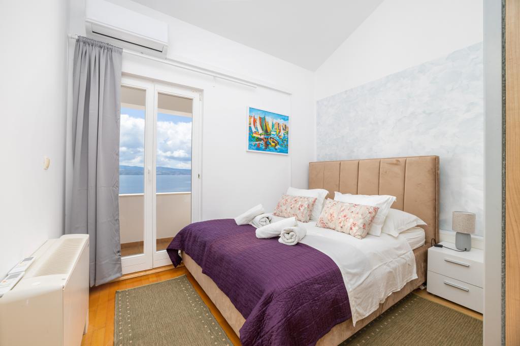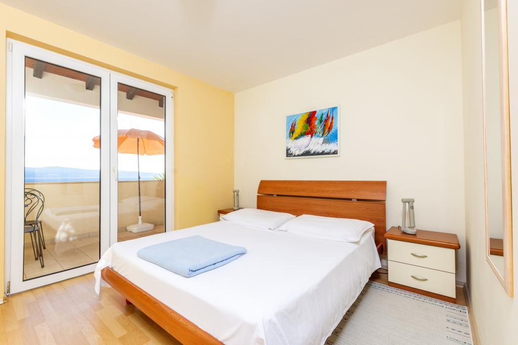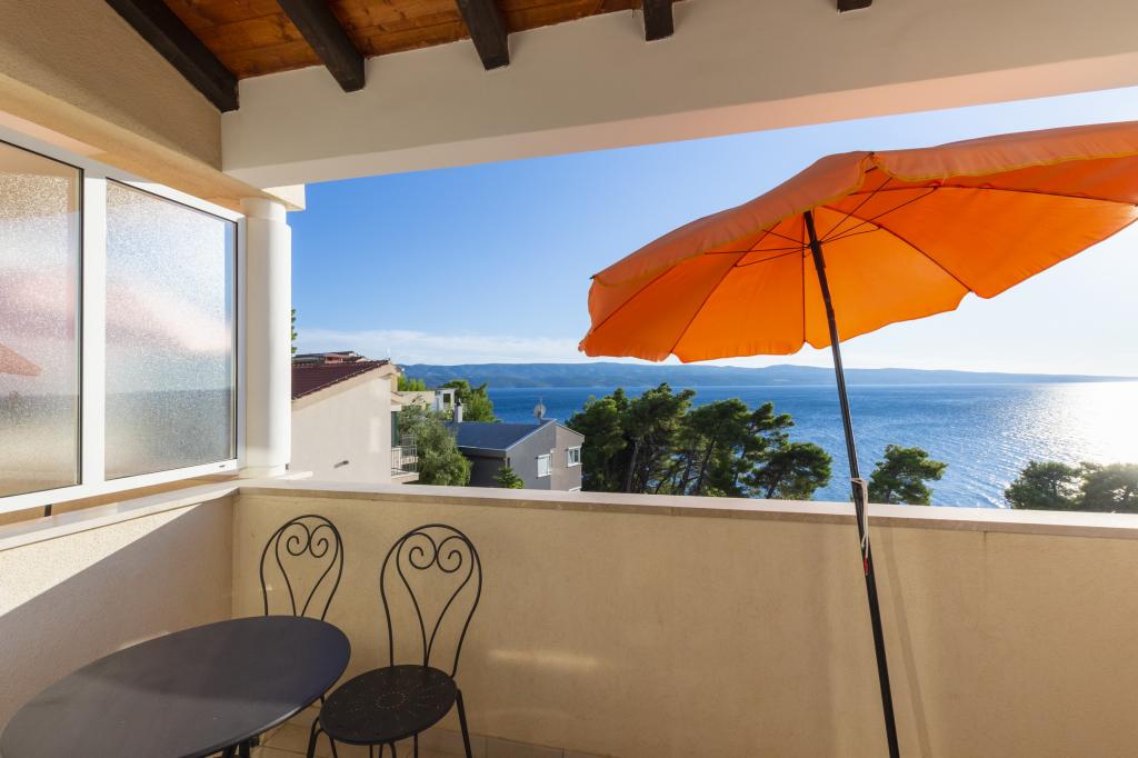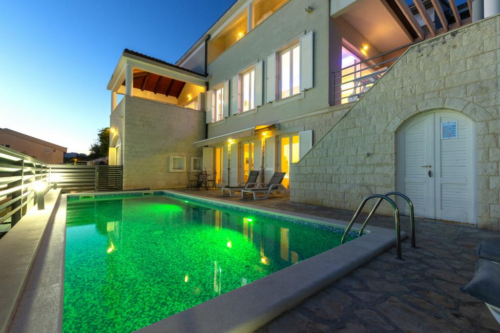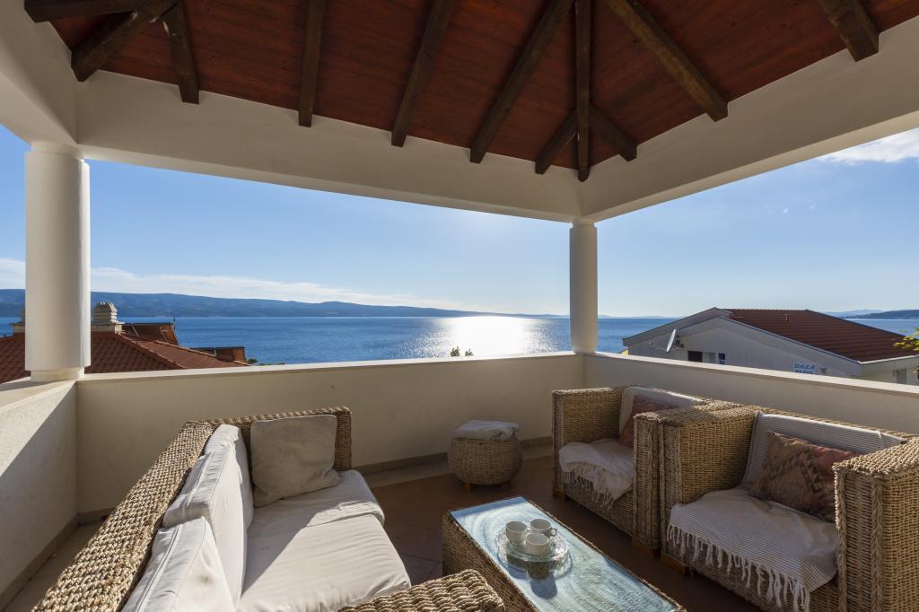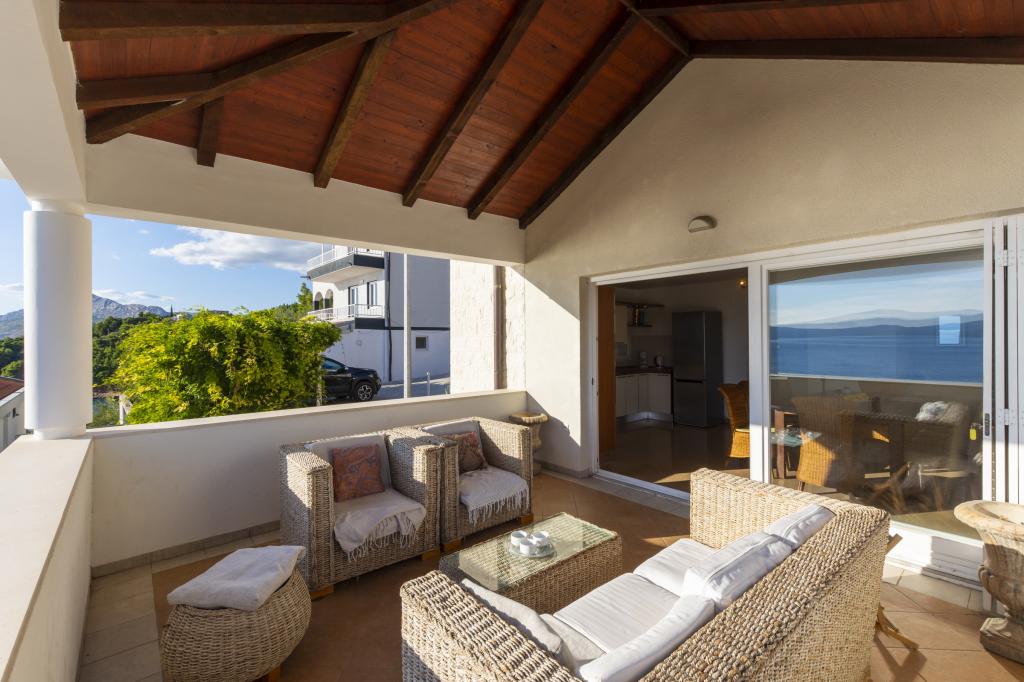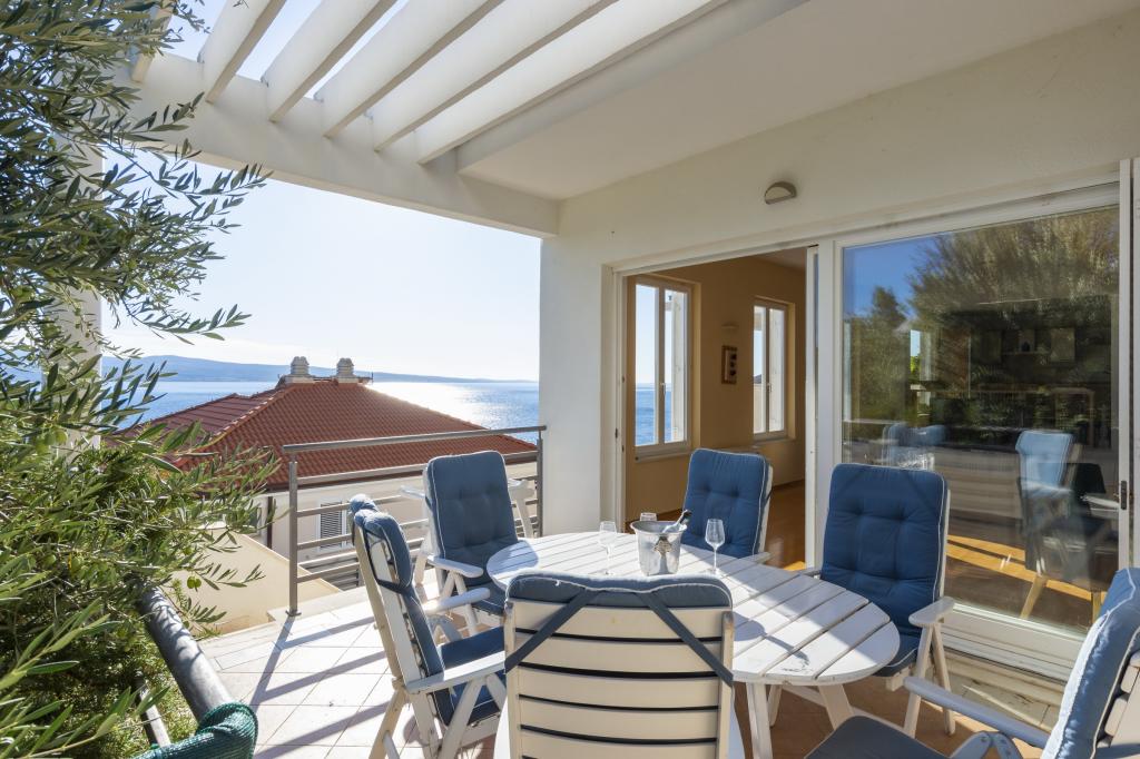Indkvartering i nybyggede, yderst komfortable og veludstyrede lejligheder. Anlægget ligger 3 km fra Omiš centrum. I alt otte lejligheder, beliggende i første række til havet. Alle lejligheder har store terrasser med udsigt over havet og øen Brač. Parkeringspladser lige ved siden af villaen. Lejlighederne ligger nedenfor hovedvejen (300 meter), lige ved siden af havet og en stor stenstrand. Der er fire typer lejligheder, -- type 2+2 med et separat soveværelse med dobbeltseng og en stue med to senge, -- derefter lejligheder type 2+2 stort studio, -- store luksuslejligheder, type 4+2, med to dobbeltværelser og en stor stue med to udtrækssenge og -- stor de lux. lejlighed, type 14+2, i virkeligheden en villa i tre etager, 300m2 i areal, med en 9x4 meter swimmingpool med opvarmet vand, med syv dobbeltværelser, to store stuer med balkoner og terrasser, fire badeværelser, separat toilet, udendørs grill, sauna og fitnesscenter osv. Poolen bruges udelukkende af lejlighed A 14+2. De andre lejligheder gør ikke.