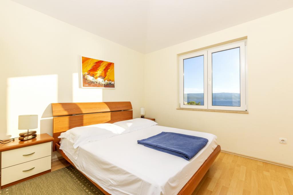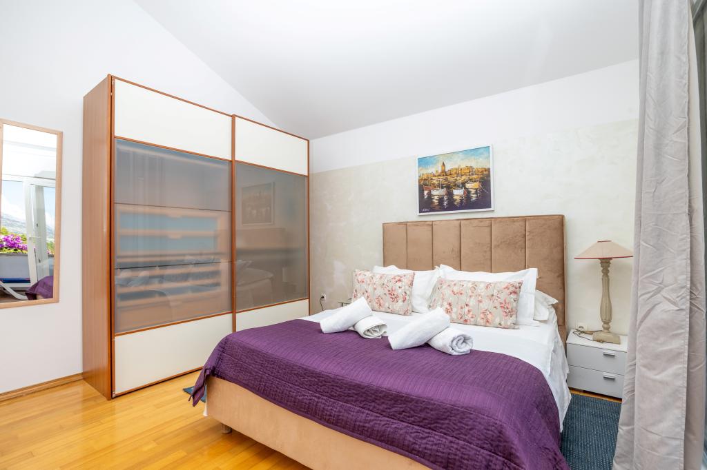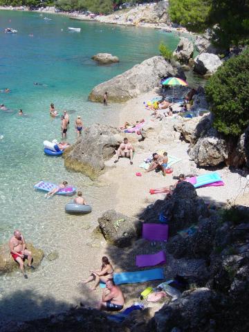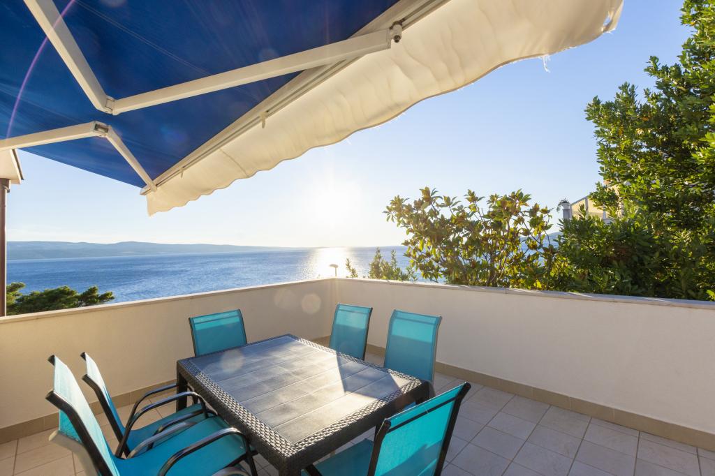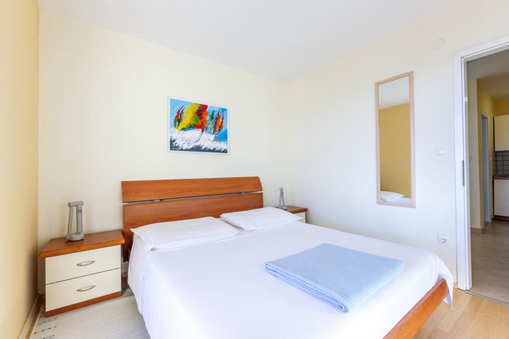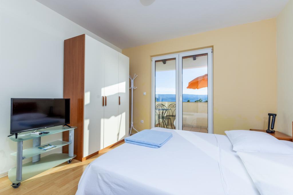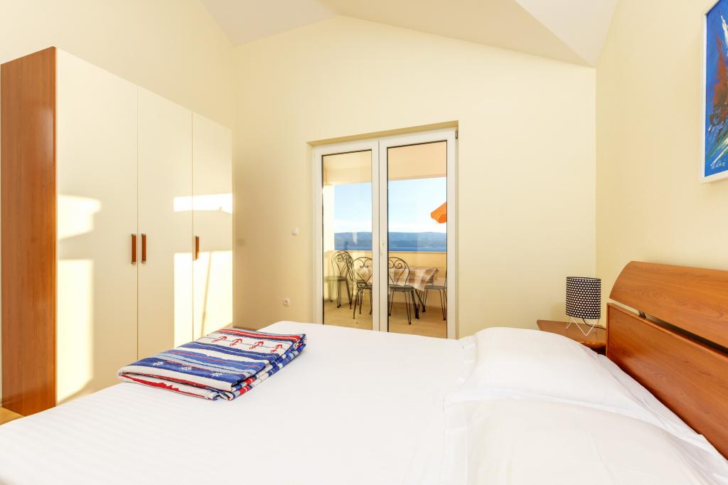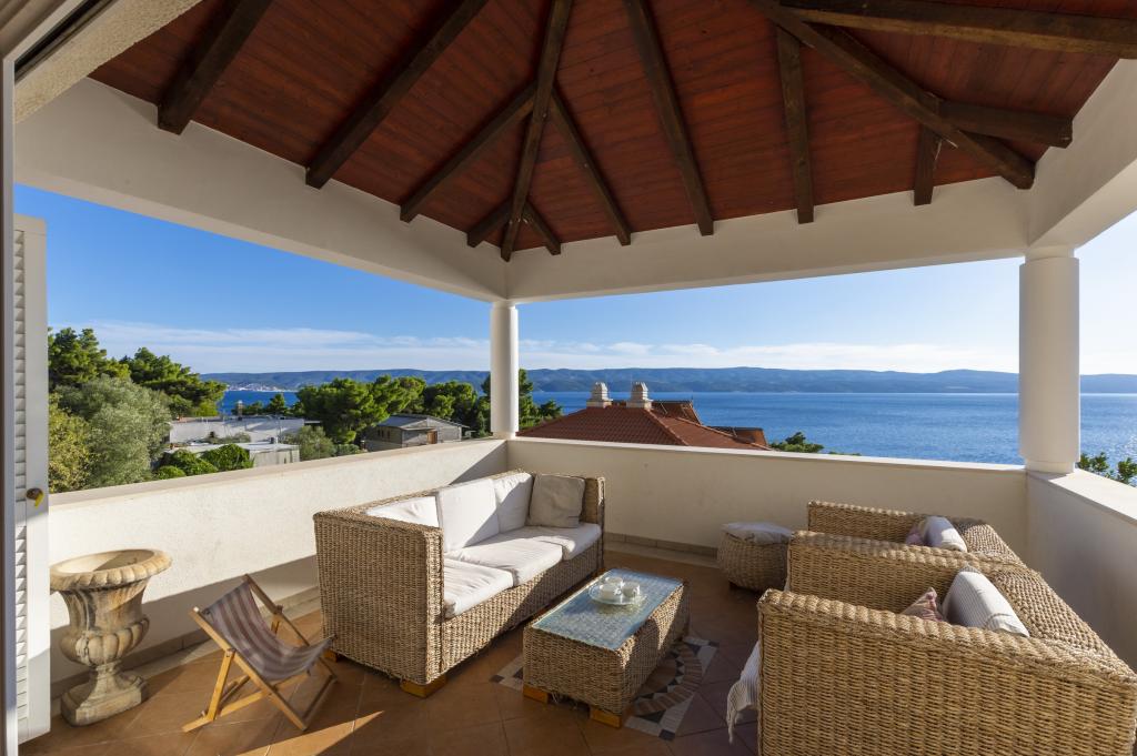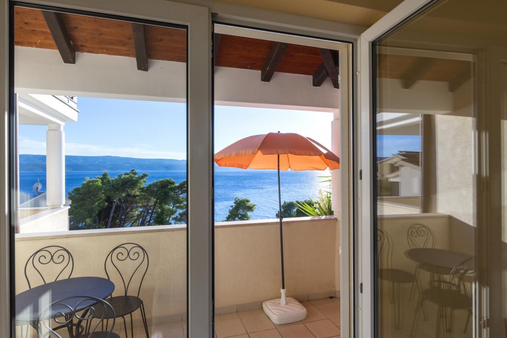 Indkvartering i nybyggede, yderst komfortable og veludstyrede lejligheder. Anlægget ligger 3 km fra Omiš centrum. I alt otte lejligheder, beliggende i første række til havet. Alle lejligheder har store terrasser med udsigt over havet og øen Brač. Parkeringspladser lige ved siden af villaen. Lejlighederne ligger nedenfor hovedvejen (300 meter), lige ved siden af havet og en stor stenstrand. Der er fire typer lejligheder, -- type 2+2 med et separat soveværelse med dobbeltseng og en stue med to senge, -- derefter lejligheder type 2+2 stort studio, -- store luksuslejligheder, type 4+2, med to dobbeltværelser og en stor stue med to udtrækssenge og -- stor de lux. lejlighed, type 14+2, i virkeligheden en villa i tre etager, 300m2 i areal, med en 9x4 meter swimmingpool med opvarmet vand, med syv dobbeltværelser, to store stuer med balkoner og terrasser, fire badeværelser, separat toilet, udendørs grill, sauna og fitnesscenter osv. Poolen bruges udelukkende af lejlighed A 14+2. De andre lejligheder gør ikke.
