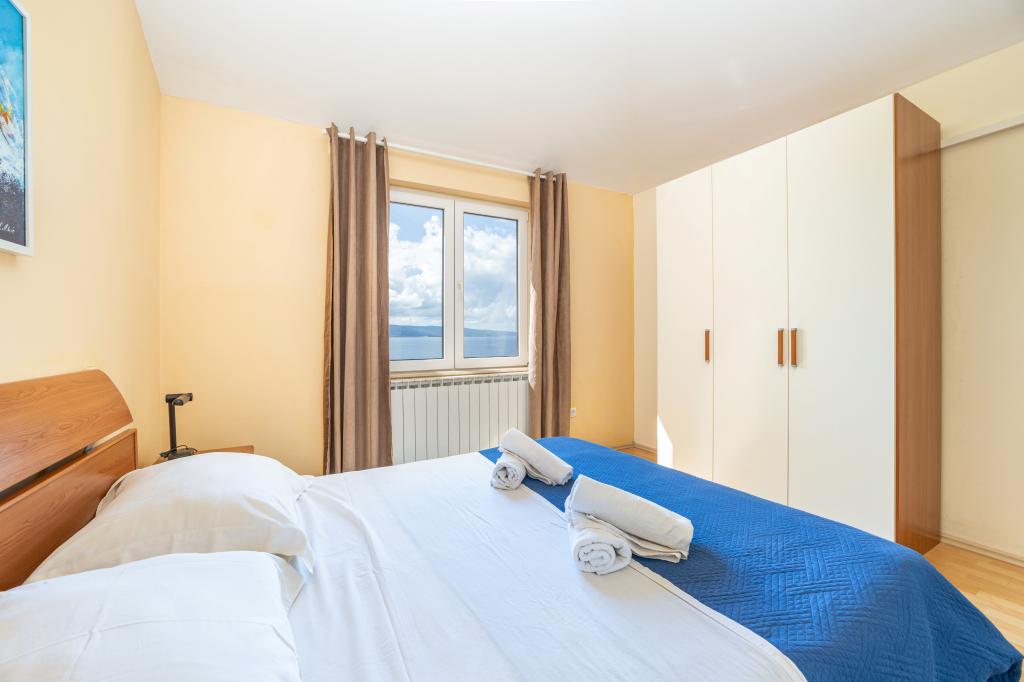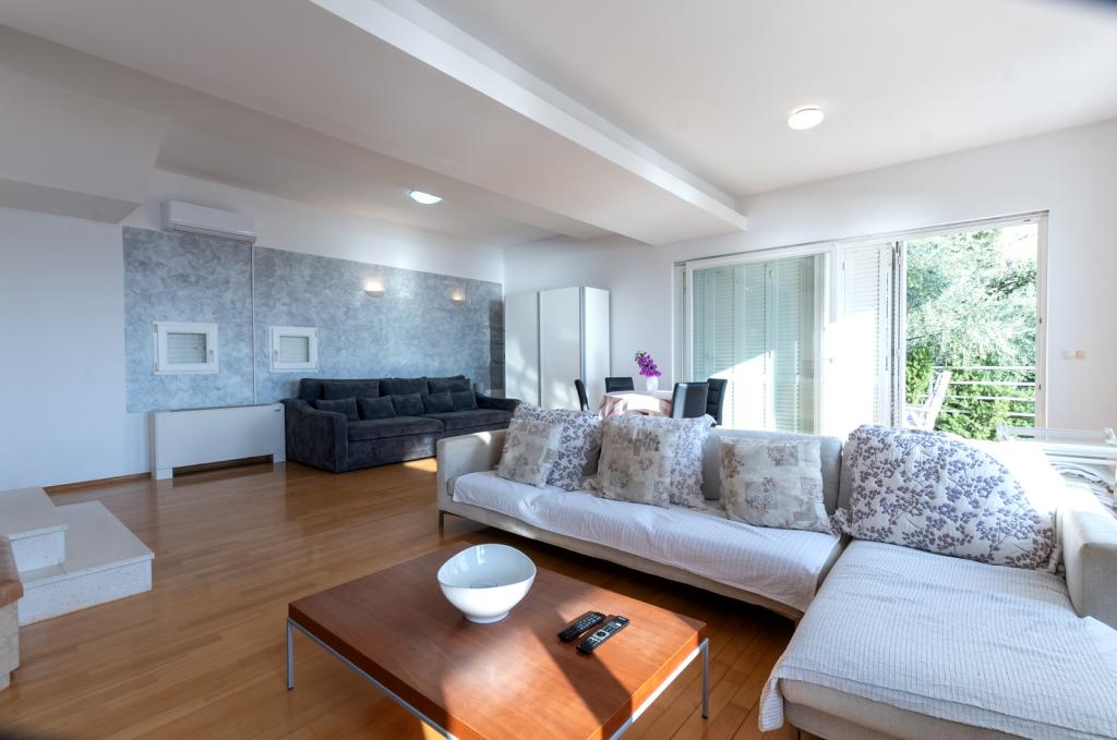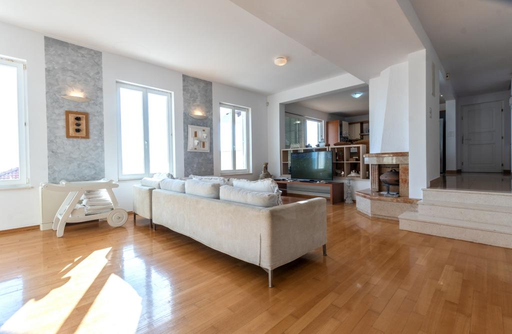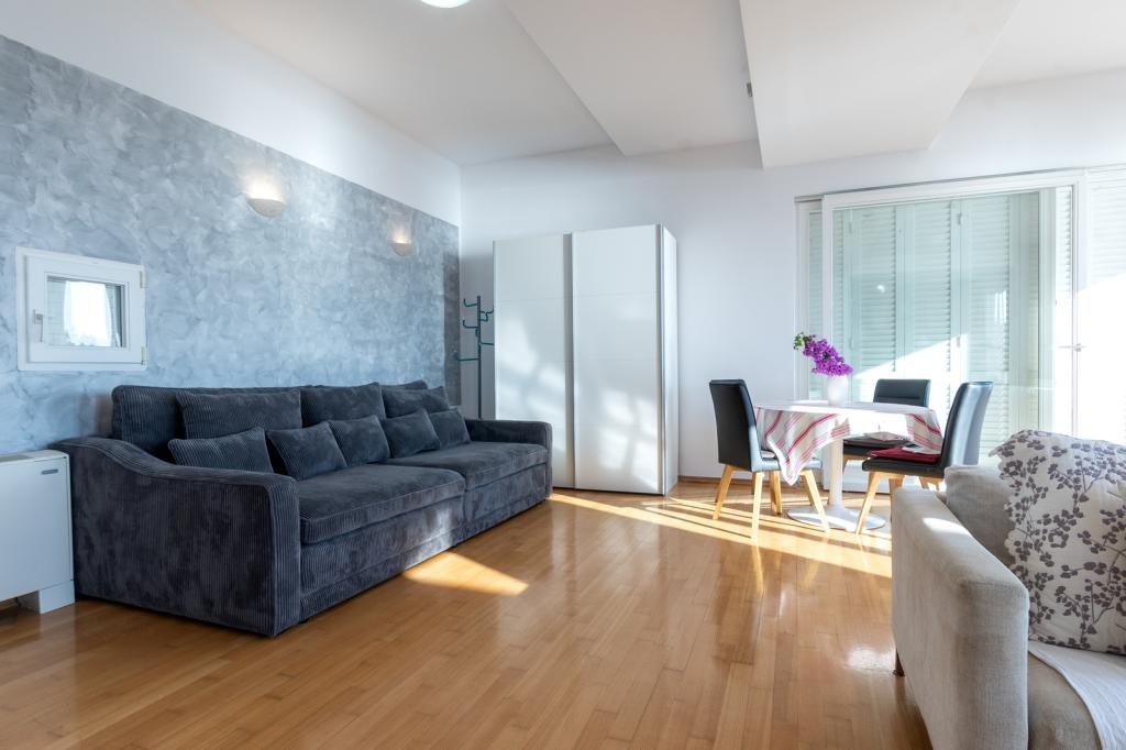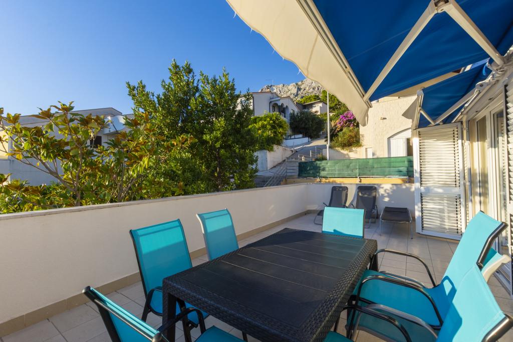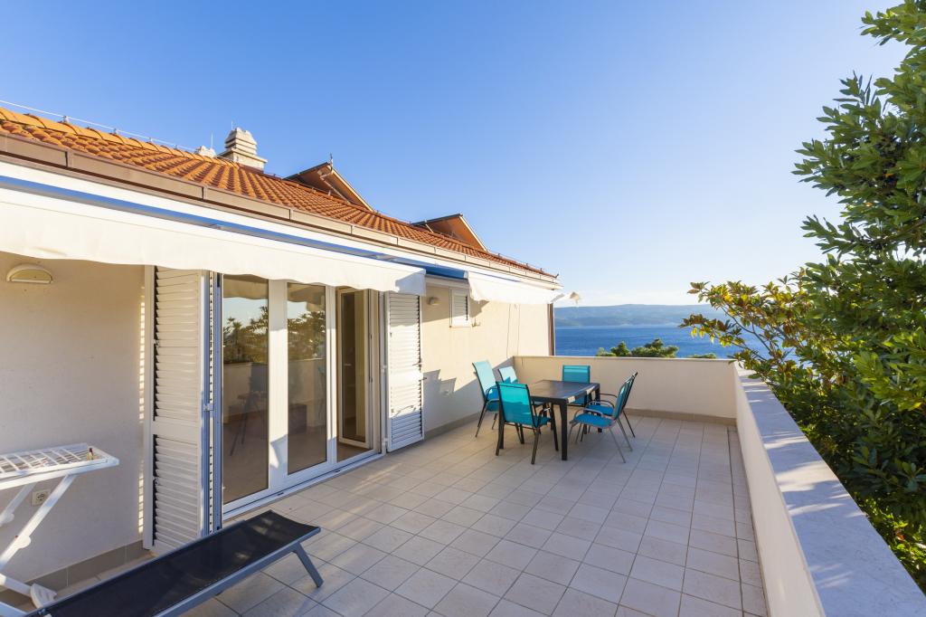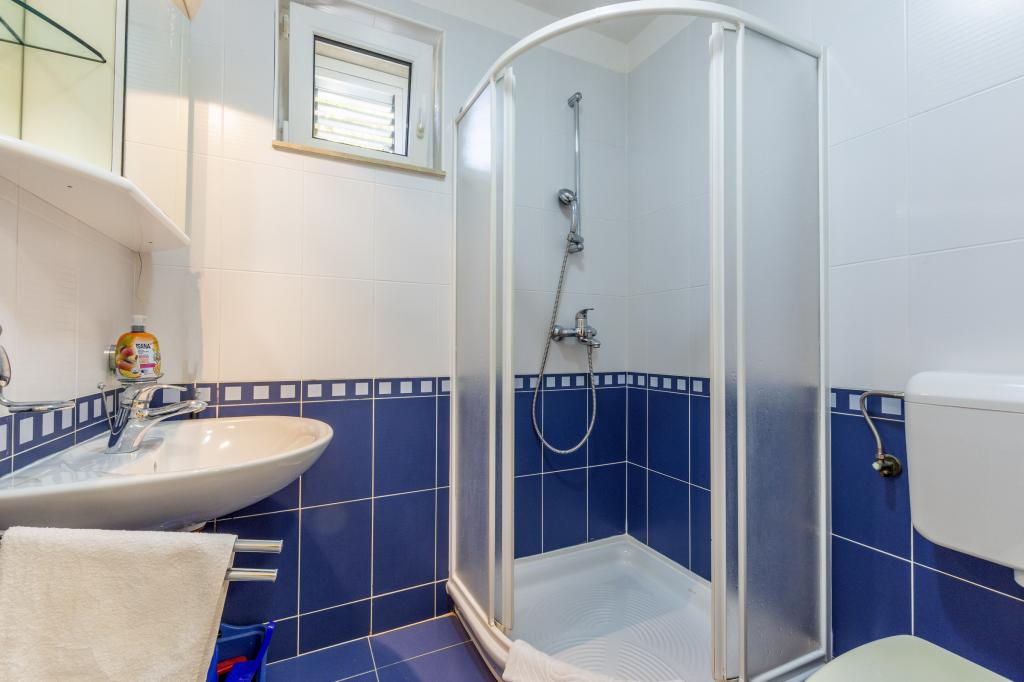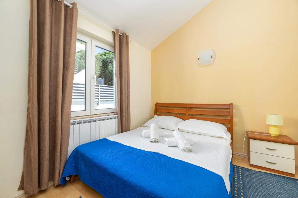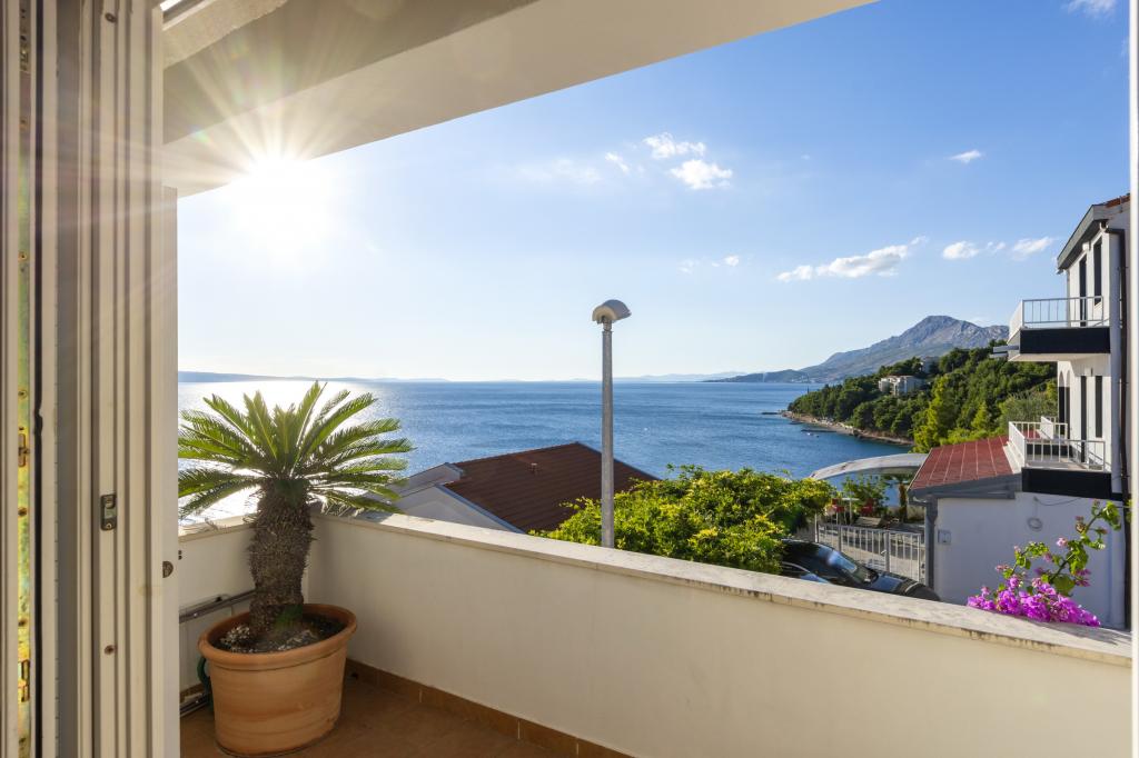 Indkvartering i nybyggede, yderst komfortable og veludstyrede lejligheder. Anlægget ligger 3 km fra Omiš centrum. I alt otte lejligheder, beliggende i første række til havet. Alle lejligheder har store terrasser med udsigt over havet og øen Brač. Parkeringspladser lige ved siden af villaen. Lejlighederne ligger nedenfor hovedvejen (300 meter), lige ved siden af havet og en stor stenstrand. Der er fire typer lejligheder, -- type 2+2 med et separat soveværelse med dobbeltseng og en stue med to senge, -- derefter lejligheder type 2+2 stort studio, -- store luksuslejligheder, type 4+2, med to dobbeltværelser og en stor stue med to udtrækssenge og -- stor de lux. lejlighed, type 14+2, i virkeligheden en villa i tre etager, 300m2 i areal, med en 9x4 meter swimmingpool med opvarmet vand, med syv dobbeltværelser, to store stuer med balkoner og terrasser, fire badeværelser, separat toilet, udendørs grill, sauna og fitnesscenter osv. Poolen bruges udelukkende af lejlighed A 14+2. De andre lejligheder gør ikke.