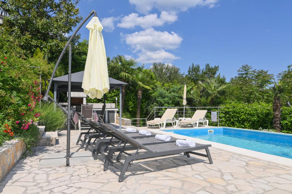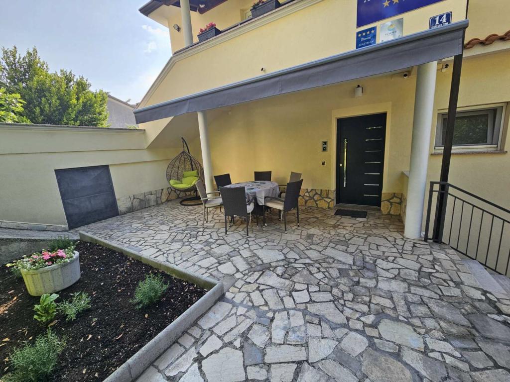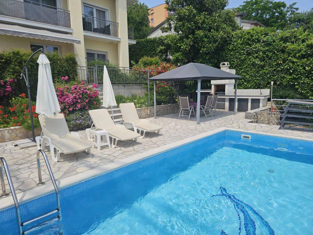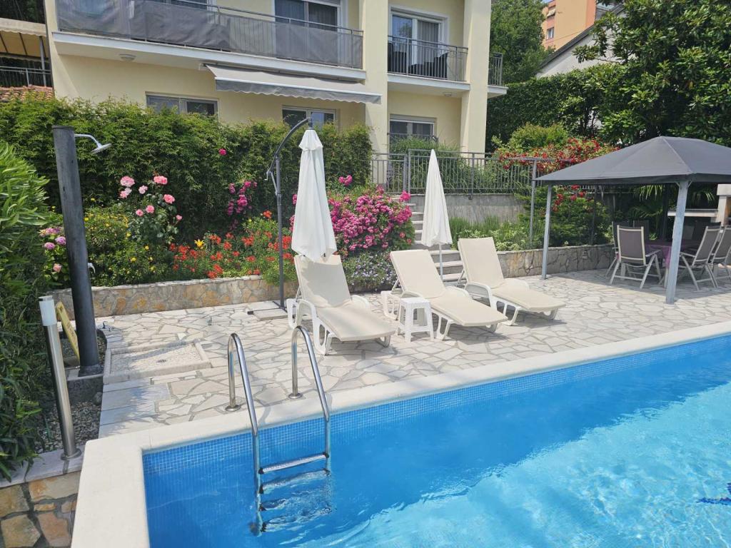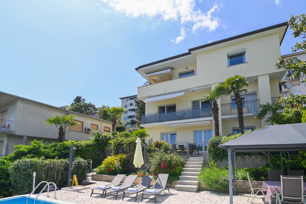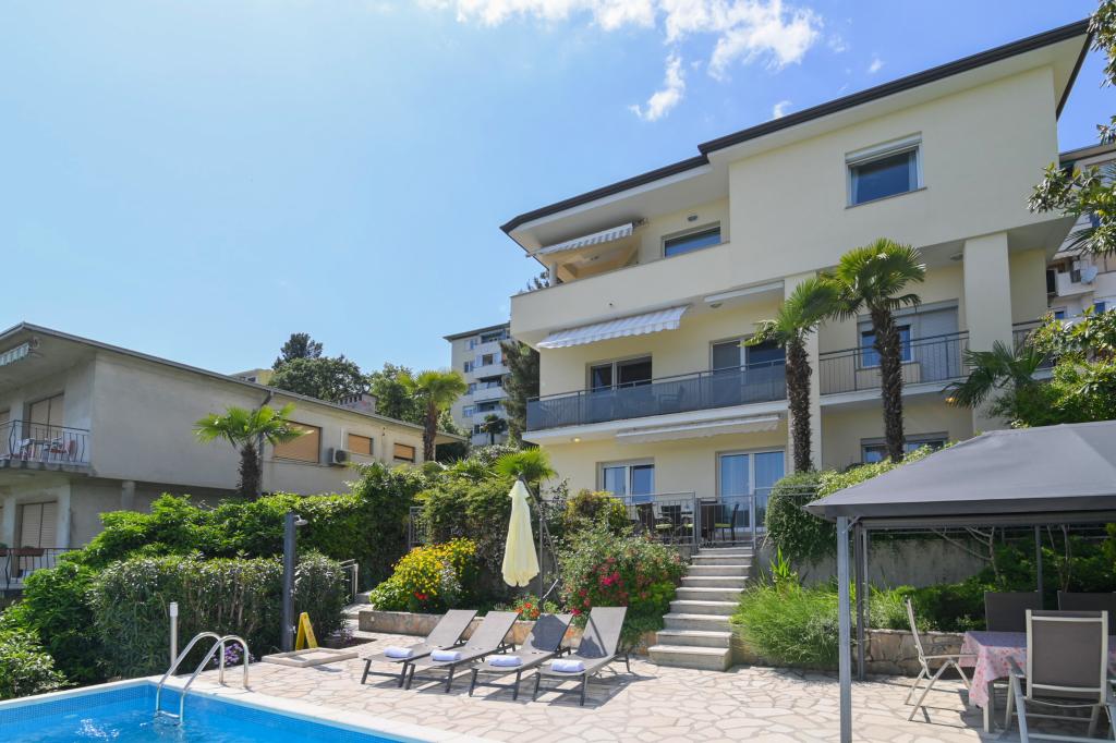 Lejlighederne Grozić ligger i et familiehus i en rolig del af Opatija, omgivet af terrasser, en smukt anlagt have med palmer og middelhavsplanter, en swimmingpool 7,0 x 3,5 m, dybde 1,5 m. Huset tilbyder indkvartering i to nyindrettede og komfortable lejligheder. Lejlighederne har en separat indgang, som yderligere giver den nødvendige privatliv for gæsterne. Lejlighed A2 (4-6 personer), 85 m2, ligger i stueetagen. Lejlighed A1 (4-6 personer), 90 m2, ligger på 1. sal. Der er parkeringspladser (overdækket). I den rummelige og smukt anlagte have er der en swimmingpool med solterrasser, som gæsterne kan benytte: en muret grill, overdækkede havemøbler (bord, stole), parasoller, liggestole... Nyd poolens privatliv og eksklusivitet. Velkommen!