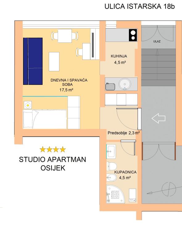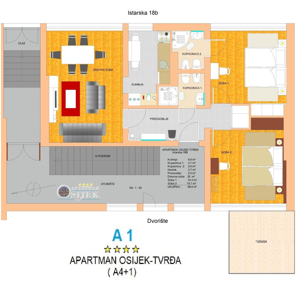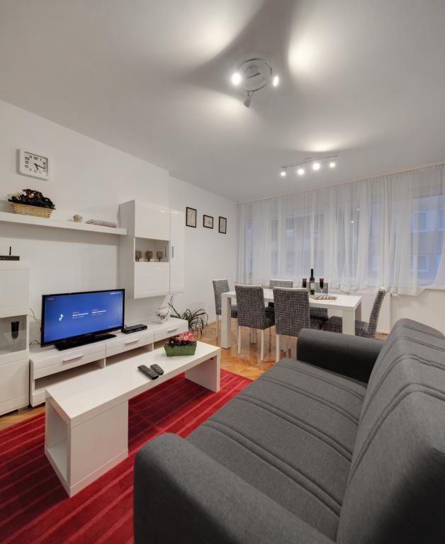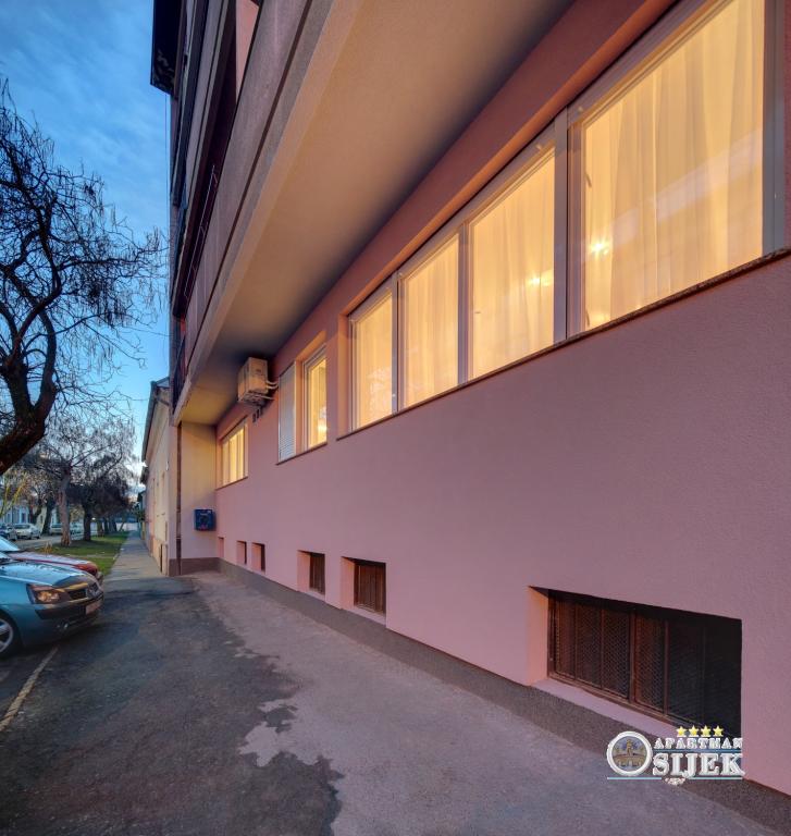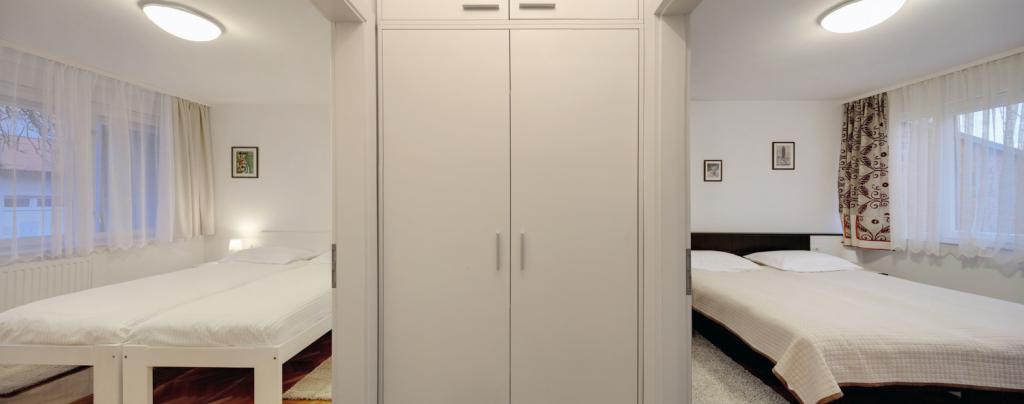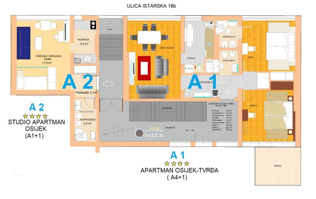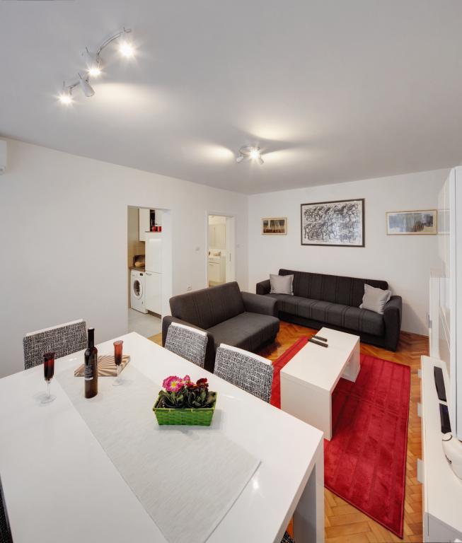 Apartment Tvrđa og Studio lejlighed Osijek er placeret i den høje stueetage af bygningen i Istarska gaden, nær Eurodom, hvor der er parkeringspladser. Lejlighederne ligger tæt på hovedgaderne og veje, der forbinder Osijek med de omkringliggende byer og motorvej A5. I umiddelbar nærhed af lejligheden er der fodboldstadion og sportshal "City Garden", "City Pools", restauranter og det historiske centrum af Osijek - den barokke fæstning. Apartment Tvrđa er en treværelses lejlighed med et areal på 68 m². Du har til din rådighed to soveværelser med dobbeltsenge og en stue med sovesofa, to badeværelser, et køkken og en terrasse. Osijek studiolejligheden er 30 m² stor. Den består af entré, stue, soveværelse, køkken og badeværelse. Soveværelset, hvori der er en seng, er adskilt fra stuen med en skydedør dækket med spejle. Der er en sovesofa i stuen. Der er en parkeringsplads i Eurodoms underjordiske garage i umiddelbar nærhed af bygningen.