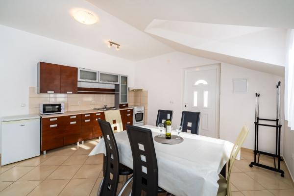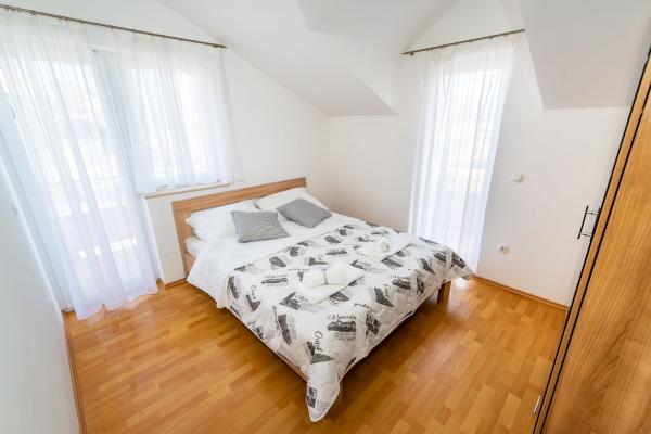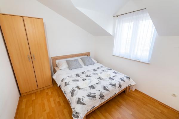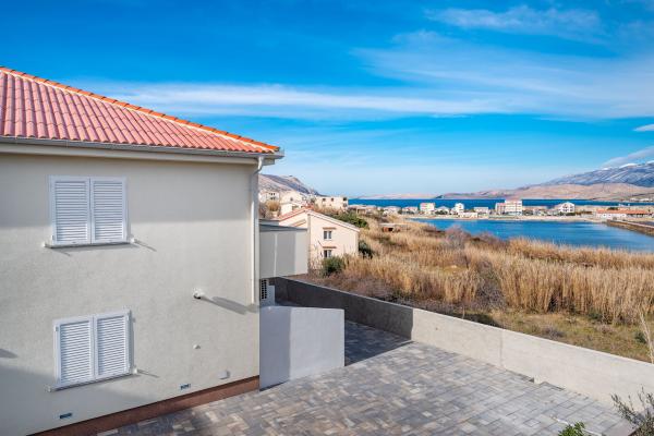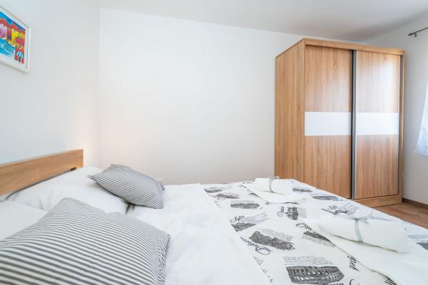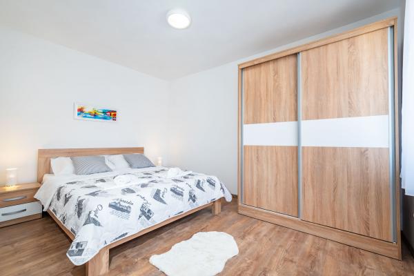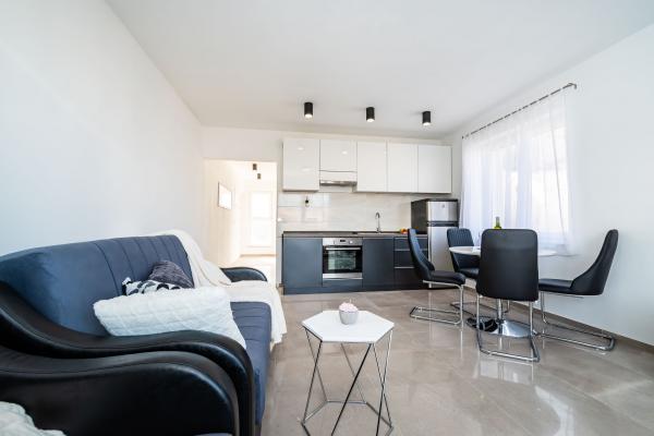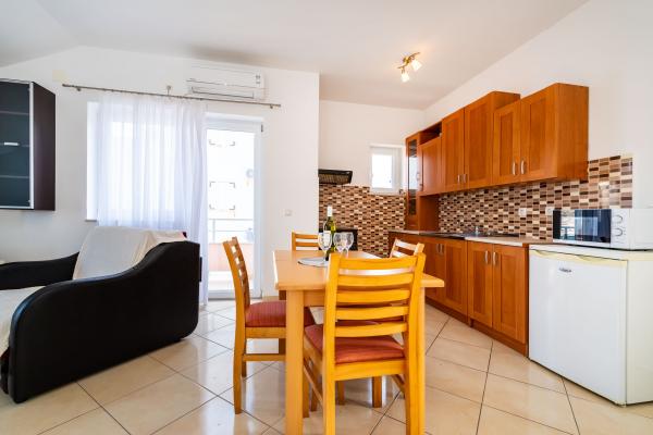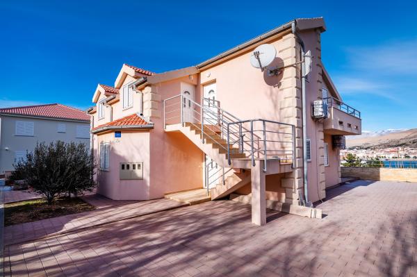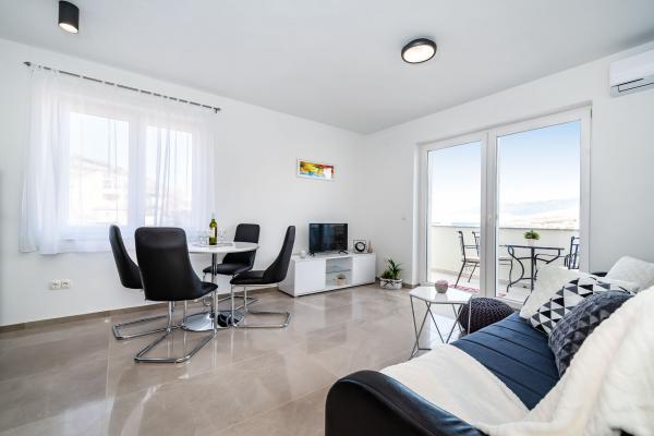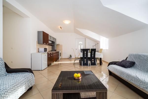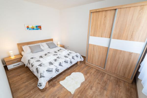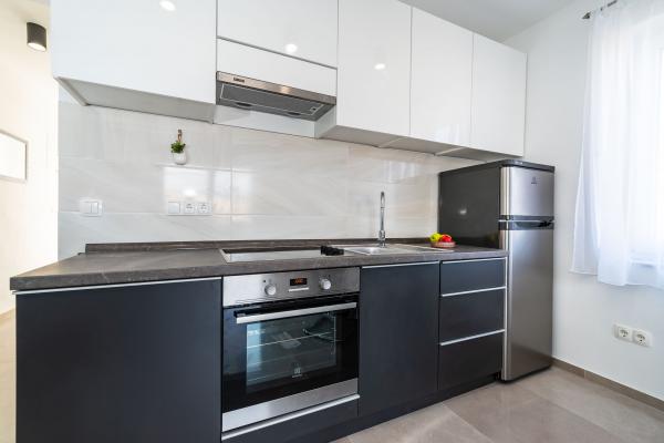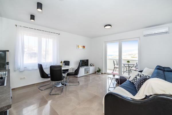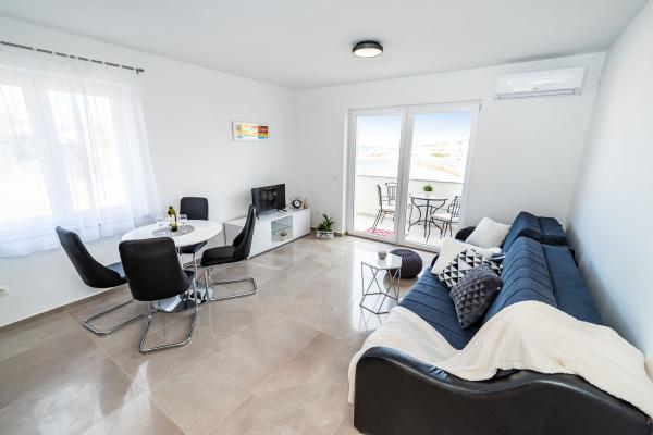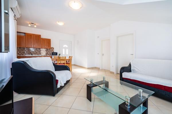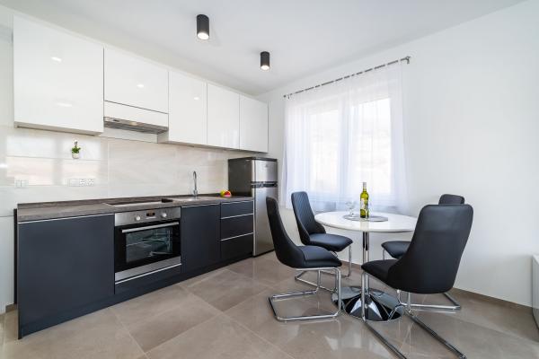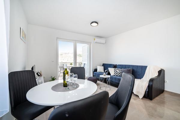 Fremragende lejligheder i en smuk beliggenhed med udsigt over havet og byen. Fuldt udstyret med alt det nødvendige indhold, parkering til biler, wi-fi, alt hvad du behøver til din behagelige ferie. 7 minutter til stranden, 10 minutter til centrum og restauranter. Den nærmeste butik ligger 5 minutters gang væk, alt er tilgængeligt på 10 minutter til fods. Lejlighederne 1 - 6 ligger i én bygning og er fuldstændig identiske. Tre lejligheder er i stueetagen (1 til 3) med store terrasser. Tre lejligheder ligger på første sal. Alle har udsigt over havet. Lejlighed 7 og 8 ligger på 1. sal i anden bygning, som ligger lige ved siden af første bygning. Alle lejligheder er moderne indrettede, og gæsterne har alt, hvad de har brug for til deres rådighed, herunder en mikrobølgeovn, køleskab, wi-fi, kedel, køkkenredskaber, håndklæder... Der er en grill med bord og stole til socialt samvær.