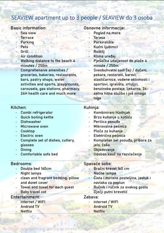 Vaskemaskine tilgængelig i teknikrummet – brug 2 gange på 7 dage inkluderet, hver ekstra vask €5 Tidlig ankomst til lejligheden (6:00-12:00) – €20* Sen afrejse fra lejligheden (11:00-19:00) – €20* Små kæledyr er velkomne – €5 pr. nat Andre tjenester efter aftale * Afhængig af tilgængelighed.