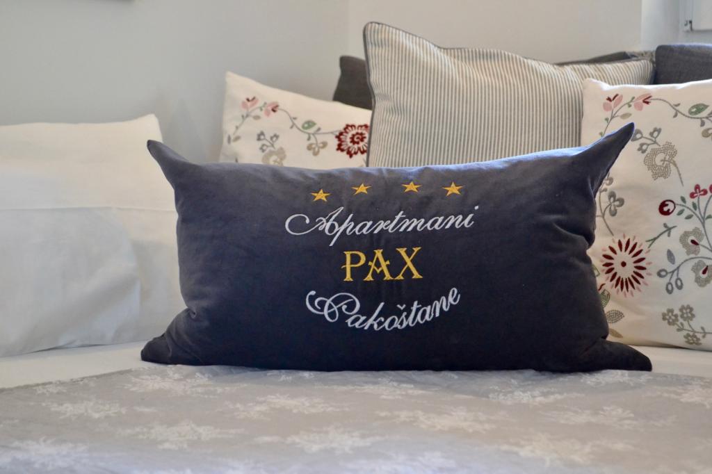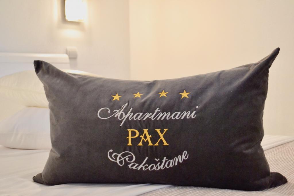 PAX lejligheder er beliggende i en rolig del af Pakoštan. De moderne indrettede 4-stjernede lejligheder ligger på første sal og er 68m² (med balkon) og 48m² (med terrasse) med separat indgang. De indeholder et soveværelse med en stor dobbeltseng, et fuldt udstyret køkken, en stue med en ekstra seng og et badeværelse med bruser. De har alt, hvad en moderne lejlighed kræver for at give gæsten det mest behagelige ophold i den. De er udstyret med sengelinned, håndklæder, aircondition og værdiboks. Lejlighederne har gratis trådløst internet, LCD-tv og satellit-programmer. Parkering er placeret i husets gård. En grill er også tilgængelig. Center, butik, bank, restauranter og andre catering- og turistfaciliteter samt stranden ligger 5-10 minutters gang fra bygningen. Naturparken Vrana Lake, den største naturlige sø i Kroatien, ligger 10 minutter væk. Værterne taler kroatisk og tysk.