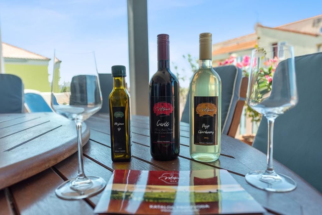 Vores tilbud inkluderer vores hjemmelavede olivenolie, rød- og hvidvin samt vores hjemmelavede urtemedicin.
