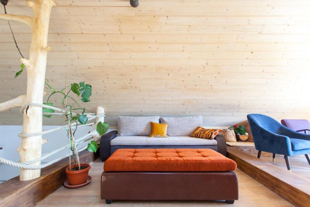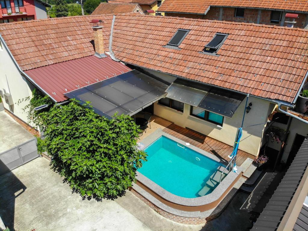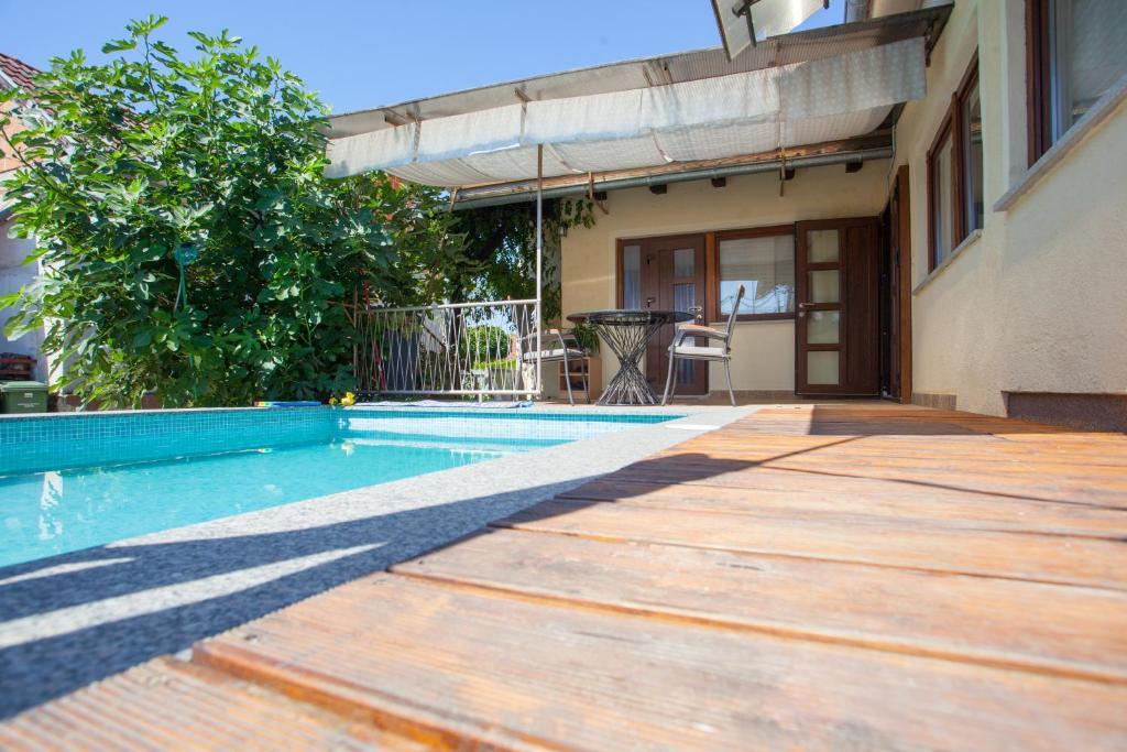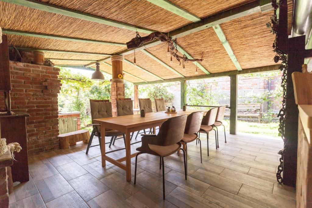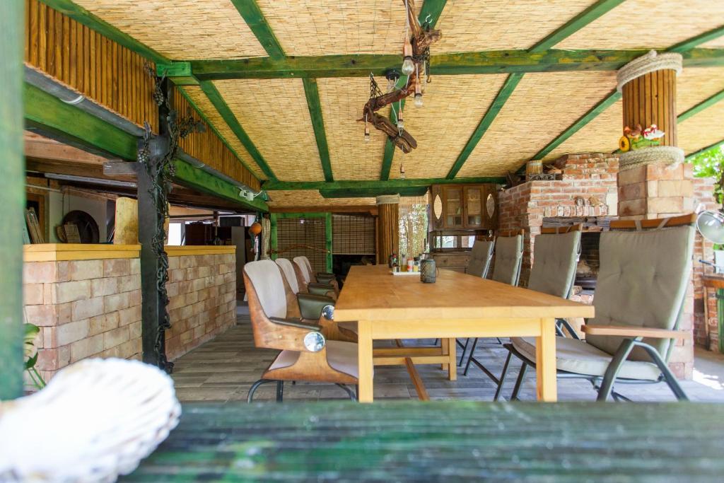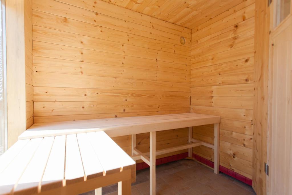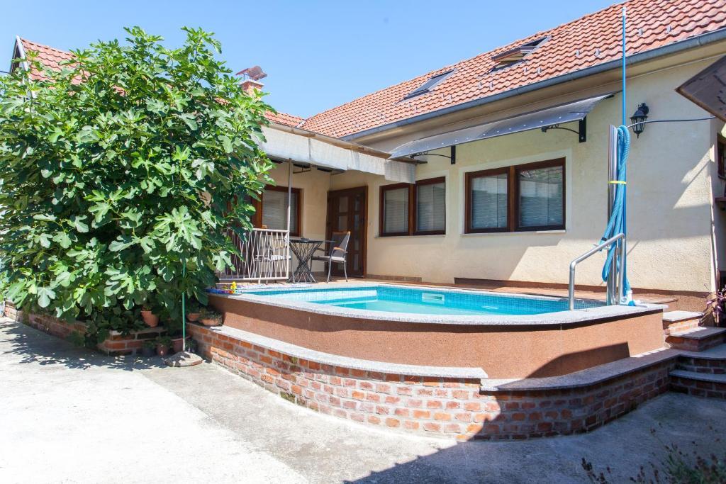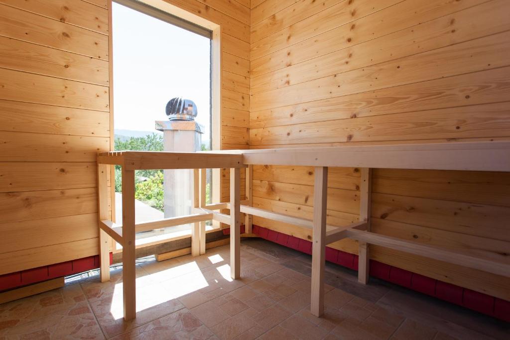 Feriehuset indeholder to værelser og et galleri med dobbeltseng, et dobbeltværelse med to separate senge og en ekstra seng til to. Det har to badeværelser, et køkken og en rummelig stue. Mulighed for at benytte udendørs pool, sauna og jacuzzi, wi-fi, max-tv, parkering. Omgivet af grønne områder er der en overdækket udendørs terrasse med grill, ovn, elkedel, spyd. Brætspil, kort, mand bliver ikke sur, badminton med net, bue og pil, dart, trampolin og gynger til børn er tilgængelige.