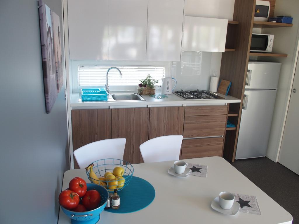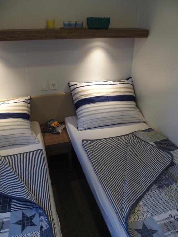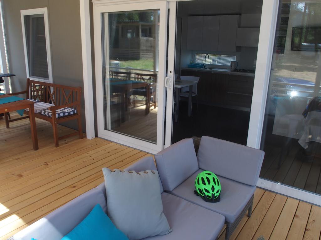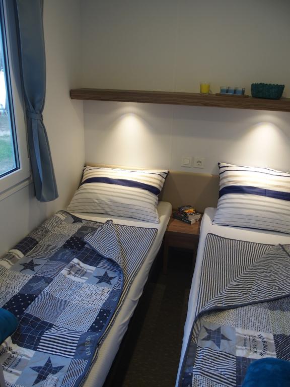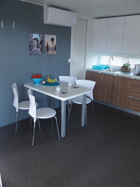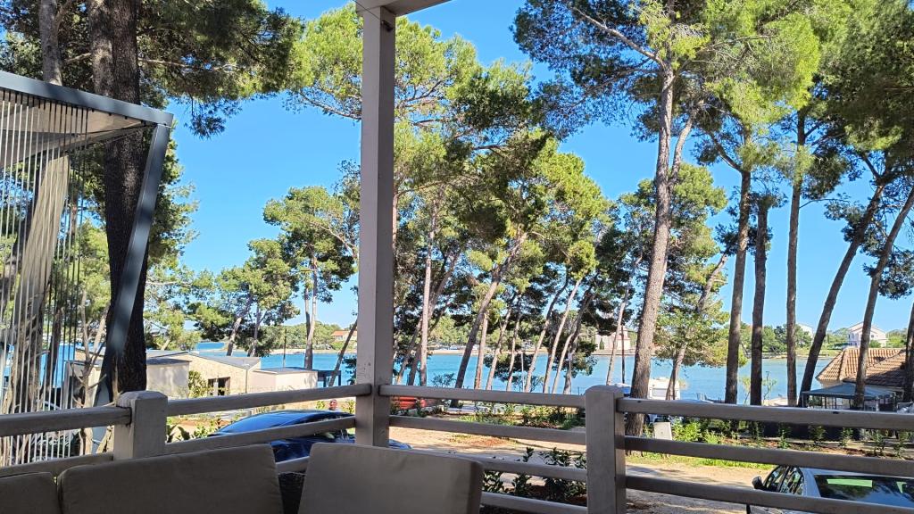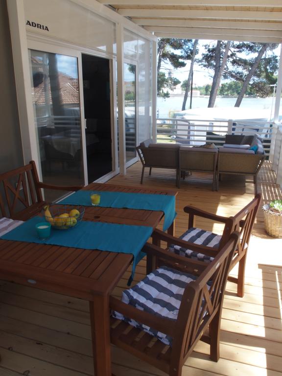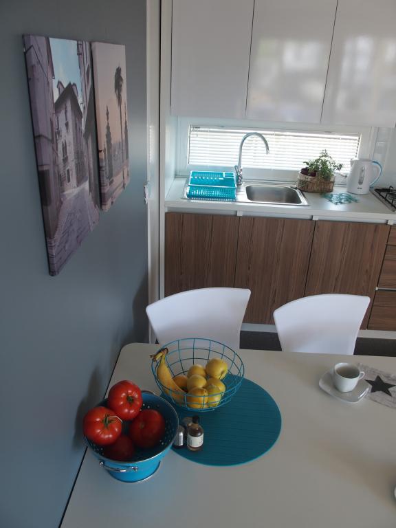 Det luksuriøse mobilehome ligger i den naturlige "dybe skygge" af en fyrreskov, kun 20 m fra sandstranden. Med en stor åben terrasse med udsigt over havet, 2 soveværelser, et fuldt udstyret køkken og badeværelse samt en stor stue med en ekstra sovesofa er dette feriehus det perfekte valg til en afslappende familieferie. Det tilbyder komfortabel indkvartering til 4 personer, mens den maksimale kapacitet er 4 + 1 person. Terrassen har et siddeområde til afslapning, et spisebord til op til 6 personer samt en gasgrill. Kun 20 m væk ligger en smuk og sikker strand med en sandbund, der strækker sig fra den ene ende af bugten til den anden. Langs kysten, et par kilometer i begge retninger, er der andre strande af forskellig type, som du kan udforske. Inde i campingpladsen har gæsterne adgang til en swimmingpool med et møbleret solbadningsområde med gratis liggestole samt en café-bar, og husets terrasse er placeret således, at du har en åben udsigt over hele bugten og poolen.