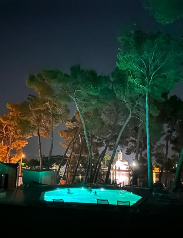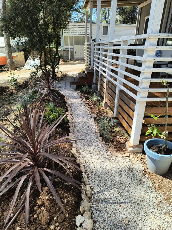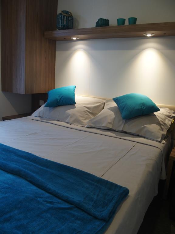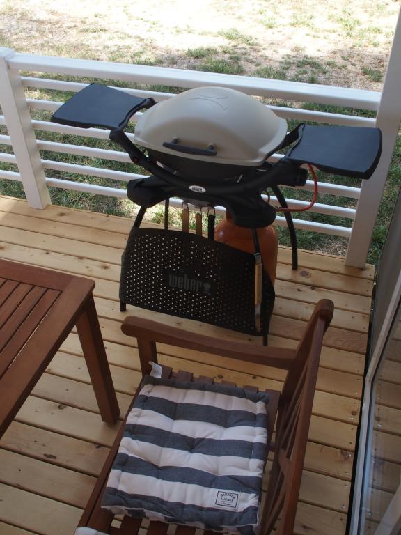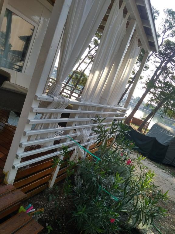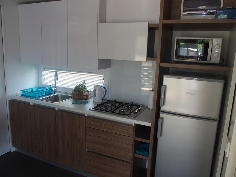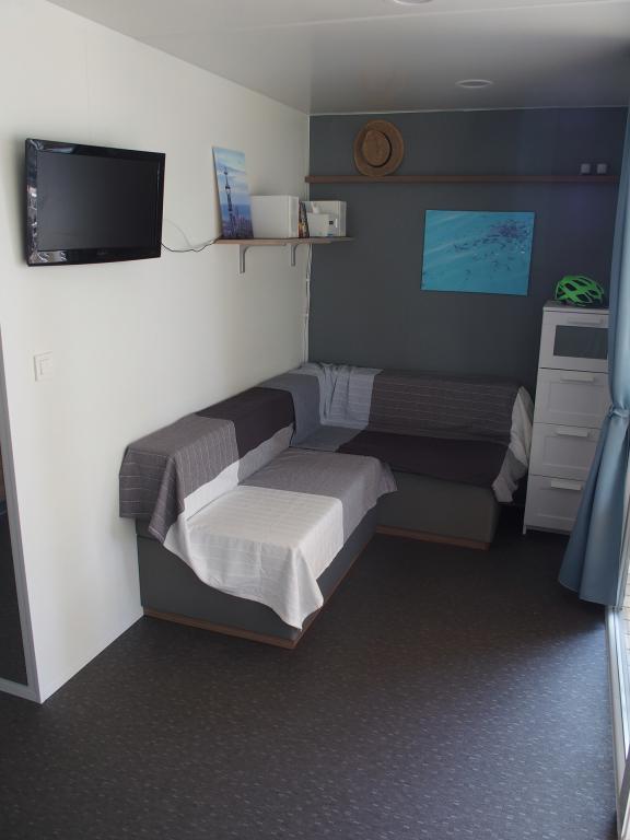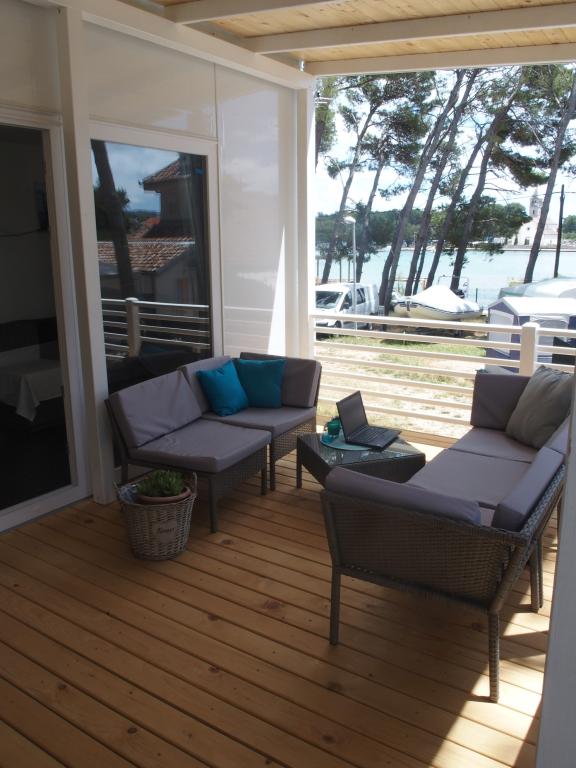 Det luksuriøse mobilehome ligger i den naturlige "dybe skygge" af en fyrreskov, kun 20 m fra sandstranden. Med en stor åben terrasse med udsigt over havet, 2 soveværelser, et fuldt udstyret køkken og badeværelse samt en stor stue med en ekstra sovesofa er dette feriehus det perfekte valg til en afslappende familieferie. Det tilbyder komfortabel indkvartering til 4 personer, mens den maksimale kapacitet er 4 + 1 person. Terrassen har et siddeområde til afslapning, et spisebord til op til 6 personer samt en gasgrill. Kun 20 m væk ligger en smuk og sikker strand med en sandbund, der strækker sig fra den ene ende af bugten til den anden. Langs kysten, et par kilometer i begge retninger, er der andre strande af forskellig type, som du kan udforske. Inde i campingpladsen har gæsterne adgang til en swimmingpool med et møbleret solbadningsområde med gratis liggestole samt en café-bar, og husets terrasse er placeret således, at du har en åben udsigt over hele bugten og poolen.