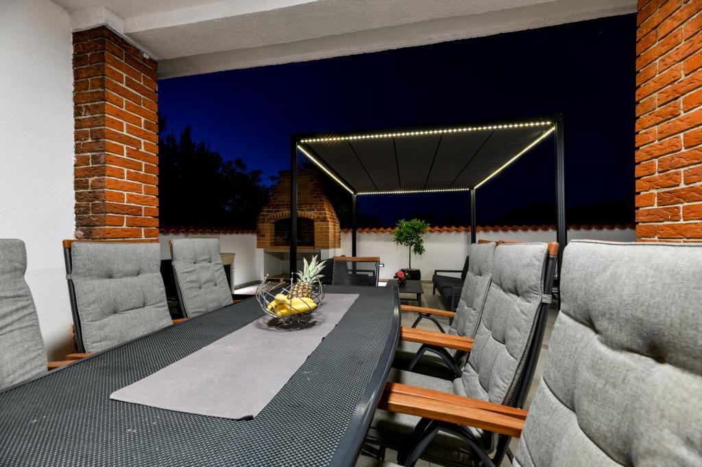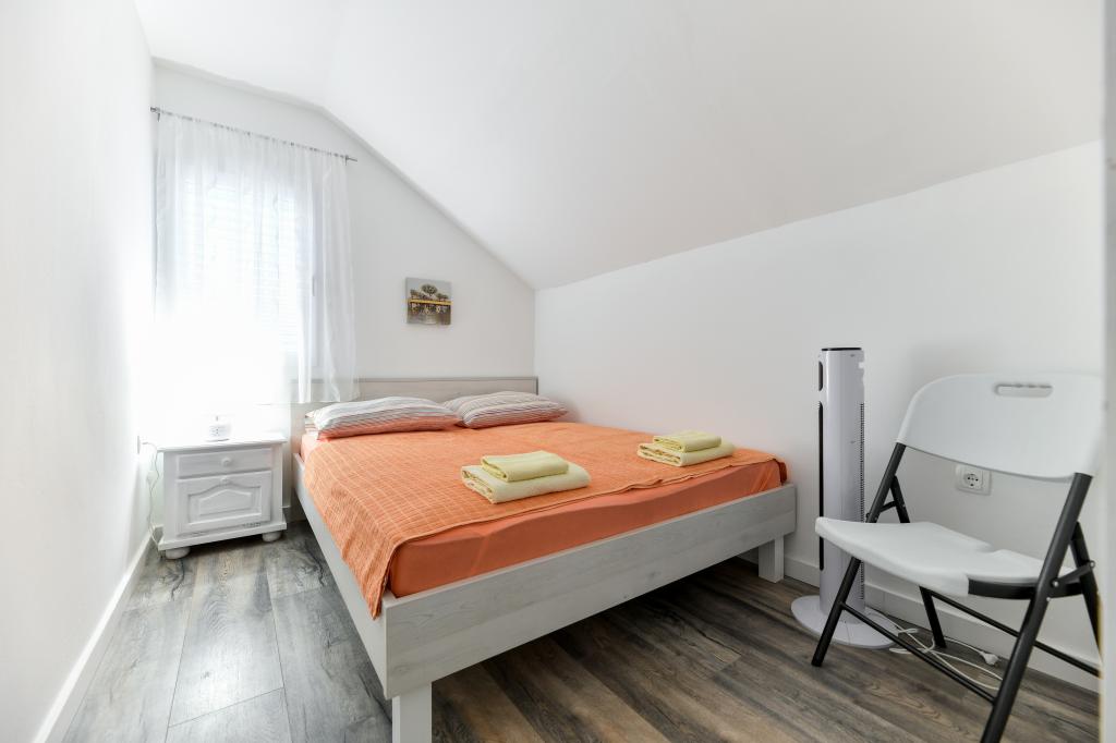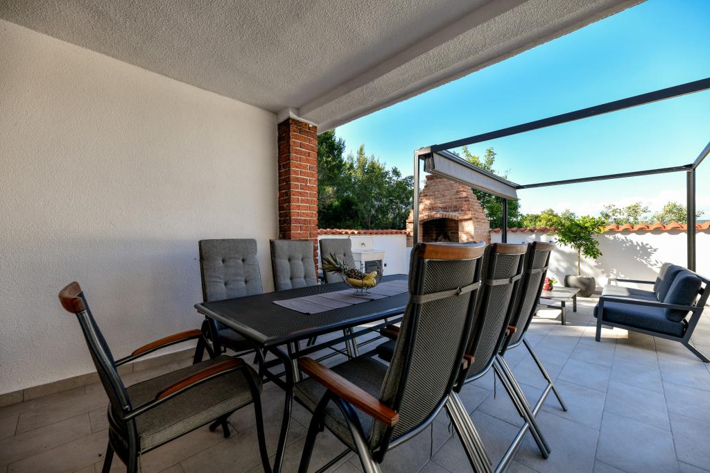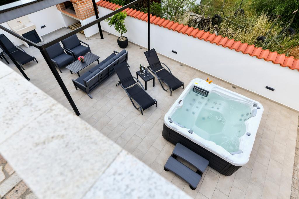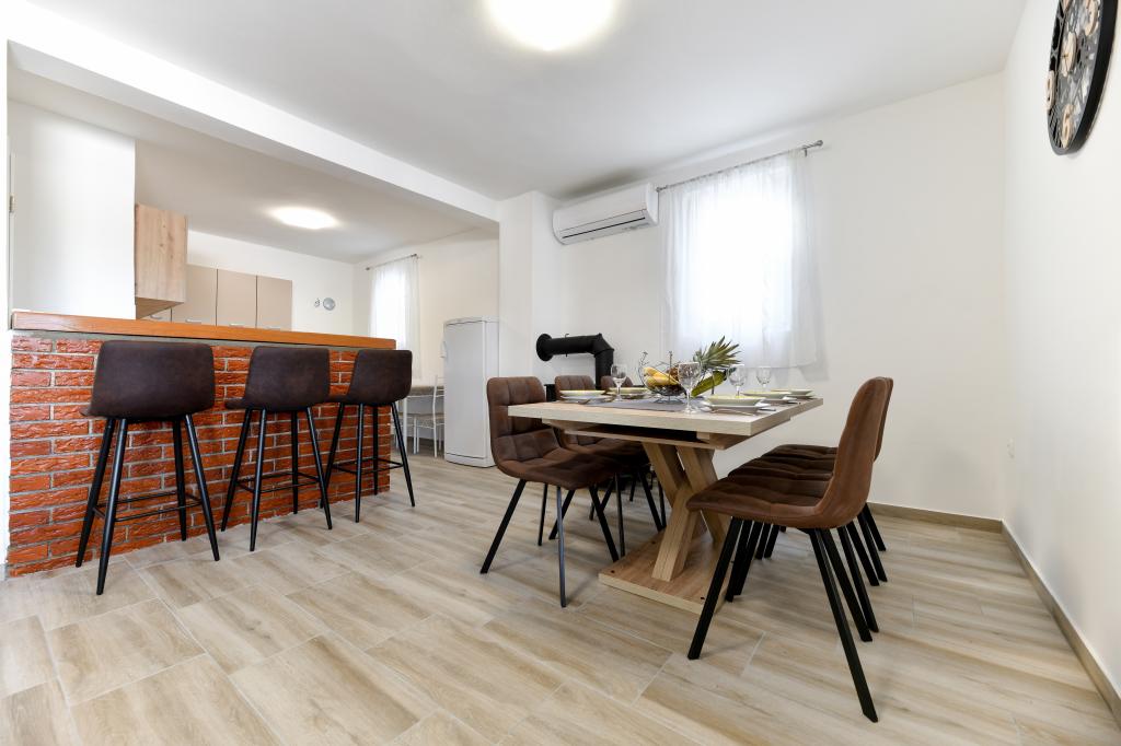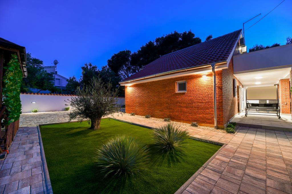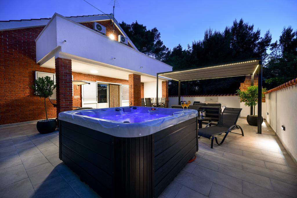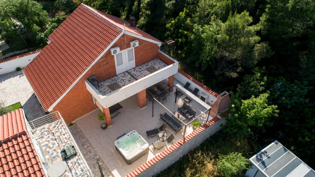 Huset ligger på øen Pašman, i en oase af fred, stilhed og skønhed i en typisk lille dalmatisk by. Tre minutters gang til stranden, fem minutter til butikken. Anlægget har en stor udendørs terrasse, grill, liggestole, en gynge til hvile og et hydromassagekar. I stueetagen er der stor stue med køkken, to badeværelser og tre toiletter samt vaskemaskine. Der er 4 soveværelser på første sal, to værelser har udgang til stor terrasse med udsigt over havet, en dobbeltseng størrelse 180x200, og de to andre værelser har en dobbeltseng 160x200, og udsigt til skoven. Der er også et toilet på første sal. En barneseng er tilgængelig efter anmodning. Der er tre parkeringspladser i gården, samt mulighed for at benytte udendørs bruser. Huset blev totalrenoveret i maj 2023. Et ophold på 10 personer er også muligt, i hvilket tilfælde der tilbydes indkvartering for to personer i en studielejlighed på samme grund mod et ekstra gebyr. Studielejligheden har et køkken med alle hårde hvidevarer, et badeværelse med bruser, tv, aircondition og en terrasse med udsigt over havet.