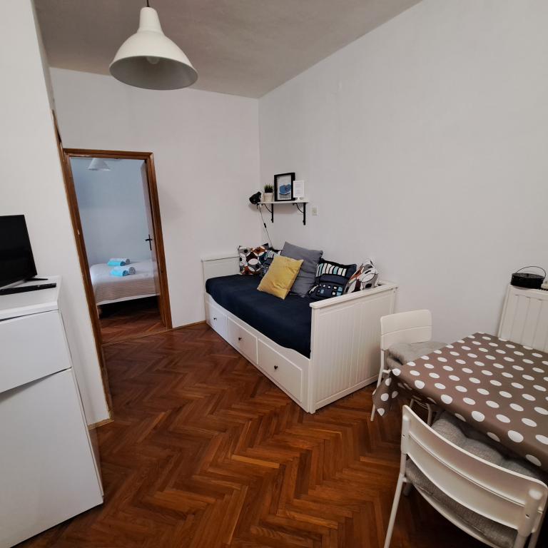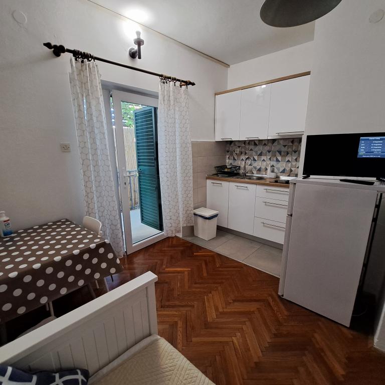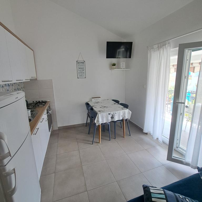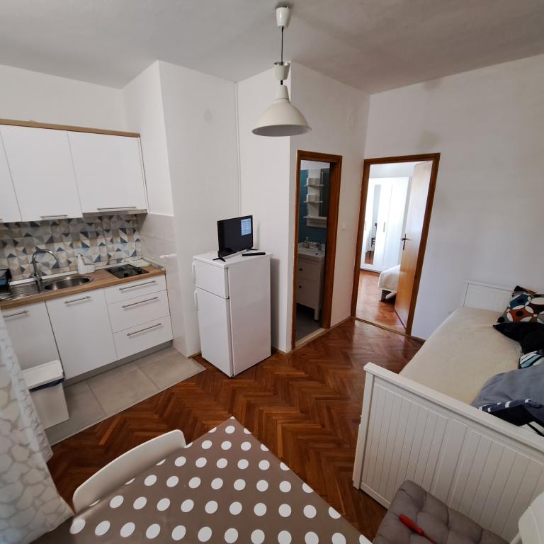 Studiet er pænt dekoreret, rent. Ejeren er meget venlig. Alt sammen giver en behagelig følelse af hjem. Lejlighederne har en fantastisk beliggenhed, alt er meget tæt på. Stranden ligger kun få meter væk. Strandene er smukke og for enhver smag. Havet er super rent. Det, jeg kunne lide mest, er, at der kort efter at være kommet ind i havet er sand, hvilket giver en fantastisk følelse at svømme. Min søn nød at dykke. De legede også i vandet. Det er fantastisk til unge familier, såvel som til lidt større børn, og også for os, der kan lide en mere afslappet ferie. Perčans tilfredsstiller enhver smag. Der er to barer på stranden, is, pandekager, .... Alt i alt var denne placering den bedste for mig hidtil. Med Mr. Jeg har allerede lavet aftaler med Boris for næste år.