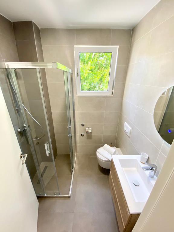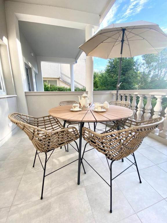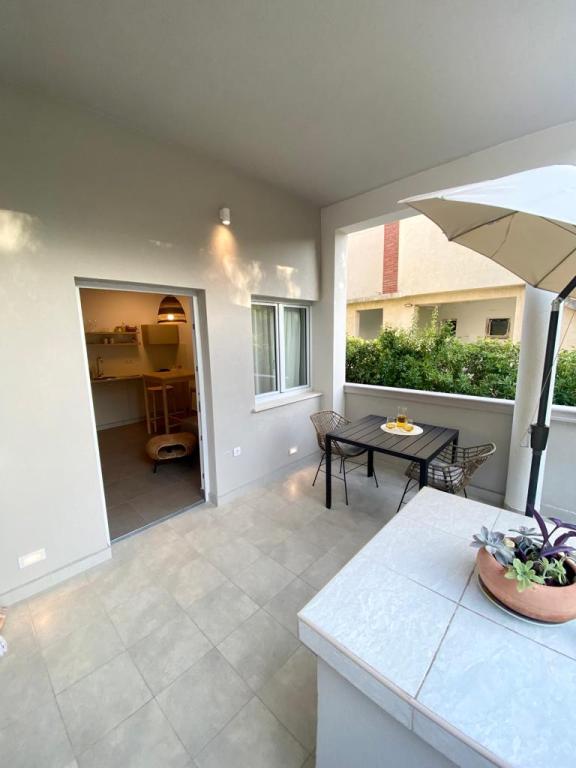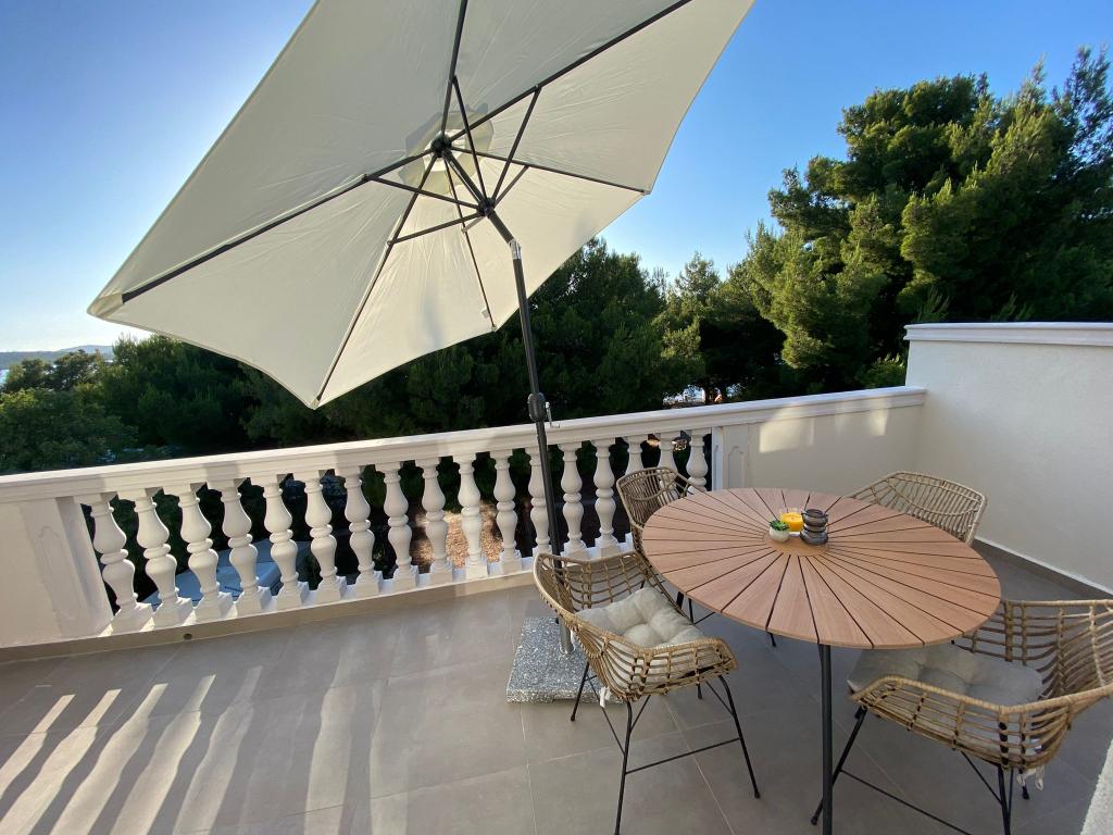 Lejlighed ren, moderne, stor terrasse med direkte udsigt over havet. Egentlig kun en kort gåtur til havet, ca 2-3 minutter, til byen indenfor max 10 minutter. Vi var to familier, så 2 lejligheder ved siden af hinanden på 2. sal var ideelle. Hvis det var nødvendigt, var ejerne tilgængelige, og alt blev løst med det samme. Jeg kan kun anbefale, en behageligt brugt ferie