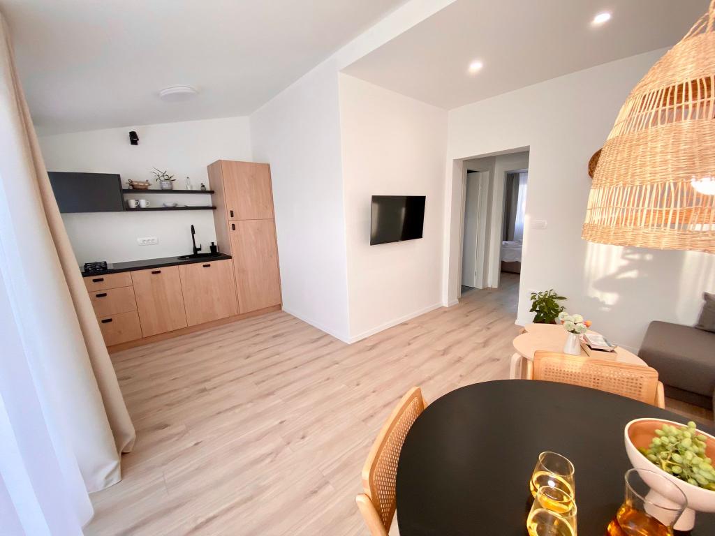 De nyrenoverede lejligheder, selvom de ligger kun få minutters gang fra stranden og byens centrum, giver fyrreskoven foran de store terrasser fred, duften af hav og lyden af græshopper. Naturlige og luftige materialer, der er til stede i hele interiøret, bidrager til en beroligende atmosfære. Rummets enkelhed, træ og strik gør rummet behageligt. Samtidig er lejlighederne moderne udstyret, hvilket gør det muligt for gæsten at slappe helt af og få en ægte følelse af hvile.