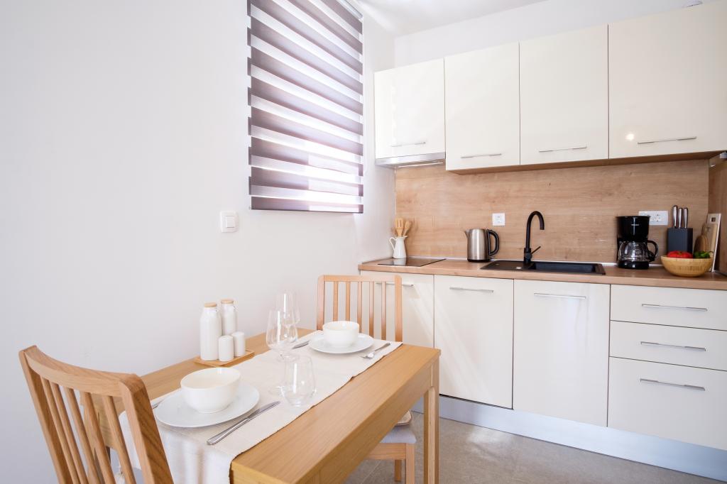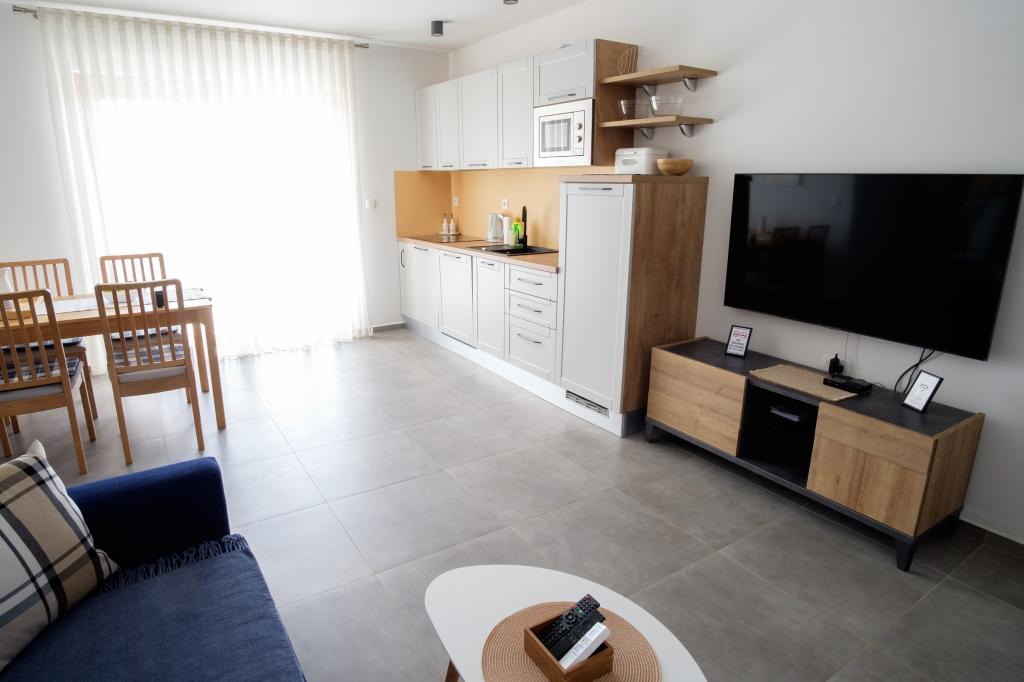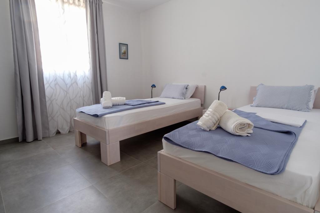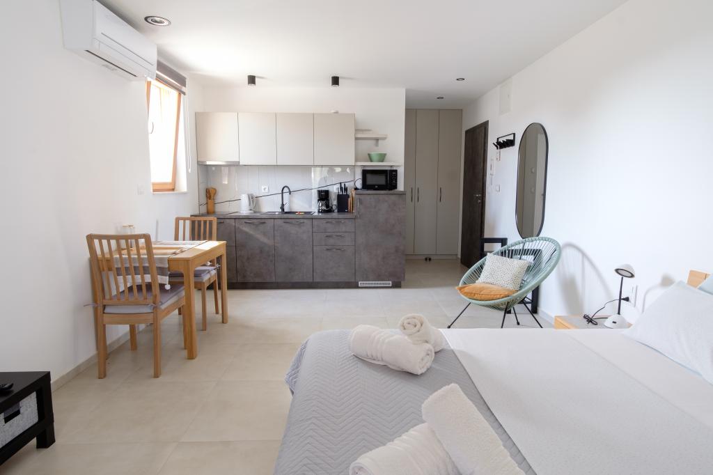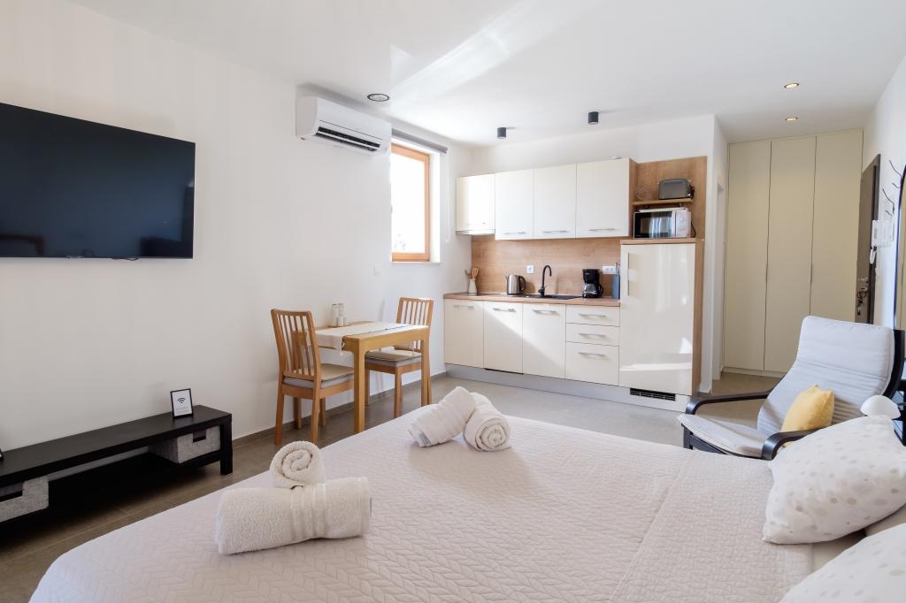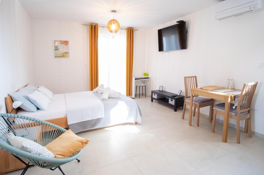 Et helt nyt hus med fremragende udstyrede lejligheder lige ved siden af den gamle bymidte, beliggende for enden af en stille gade. Den nærmeste strand ligger kun 2 minutters gang væk, og centrum ligger omkring 200 meter væk. Huset har 3 lejligheder, helt nye og moderne udstyrede. Lejlighederne har terrasse med udsigt over haven og havet. Alle lejligheder er udstyret med køkken, aircondition, et stort tv med streamingtjenester (Netflix), opvaskemaskine, kaffemaskine. Hver lejlighed har eget badeværelse og gratis WiFi, den store lejlighed har to badeværelser. Huset har sin egen parkeringsplads, som er gratis for gæster. Stranden med bruser og toilet ligger 50 meter fra lejligheden. Vi tilbyder også gæsterne en gasgrill til brug.