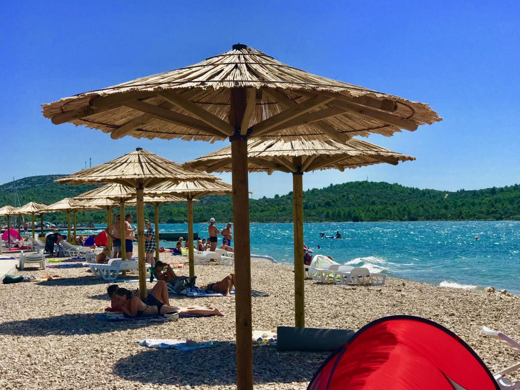 I gården kan du bruge et brusebad med varmt vand, strandstole, grill, kvalitetscykler. Parkering til 1 køretøj pr. lejlighed. Vi har et sted for cykler, som du kan besøge det bredere område, der er talrige cykelstier. I nærheden er der mulighed for at leje en båd, vandcykler osv., organiserede ture til Kornati, Du kan besøge større byer, gå til Krka National Park eller Vrana Lake Nature Park (fuglereservat, du kan også fiske) ). Du kan bruge medicinsk mudder (peloider) i bunden af Pirovačka-bugten. Vi har ketchere til tennis, bolde, badminton, . Du vil føle dig hjemme, komfortabel, afslappet. Lejlighederne er mærket med Sikkert ophold i Kroatien