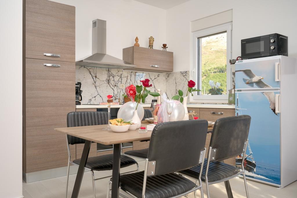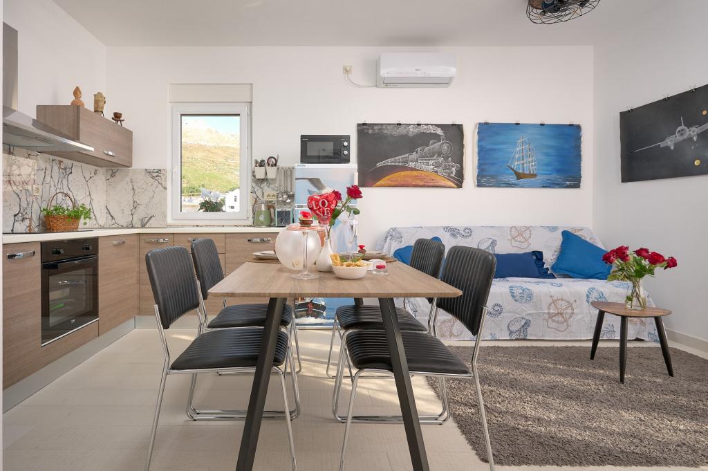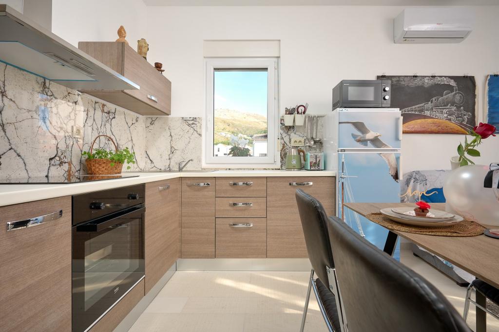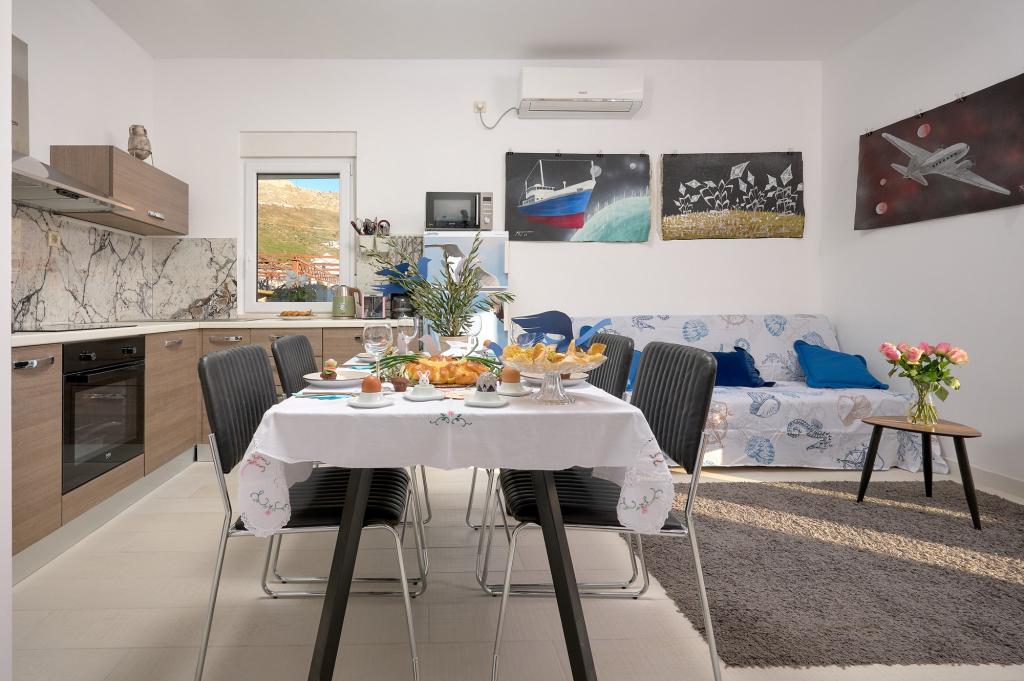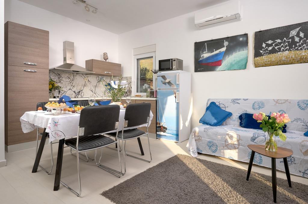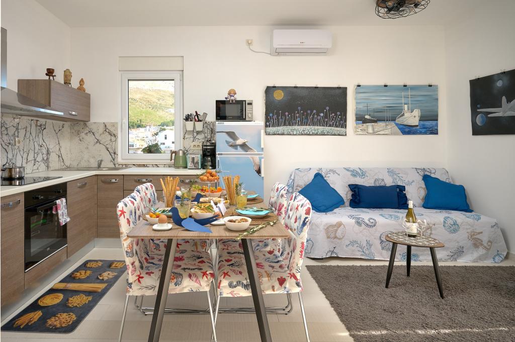 Tre nyrenoverede lejligheder "Sita" ligger i Podstrana, lige ud til havet. Denne kyst-oase, som kan prale af uberørte strande og krystalklart hav, er den perfekte destination for familier og alle dem, der leder efter et fredeligt tilflugtssted i en lille by med spændingen og den kulturelle rigdom i det nærliggende Split. Hver af vores lejligheder emmer af luftighed og komfort, og tilbyder to soveværelser, et moderne badeværelse, et funktionelt køkken med integreret stue og en privat balkon med udsigt over havet. Til din uforstyrrede ferie er hver lejlighed omhyggeligt designet og udstyret med moderne faciliteter: aircondition, WiFi, tv. Parkering er inden for ejendommen, mens nærheden af restauranter, butikker, stenstrande og sportsbaner byder på utallige muligheder for udforskning og aktiviteter.