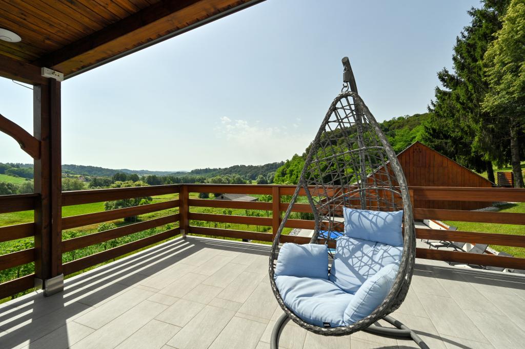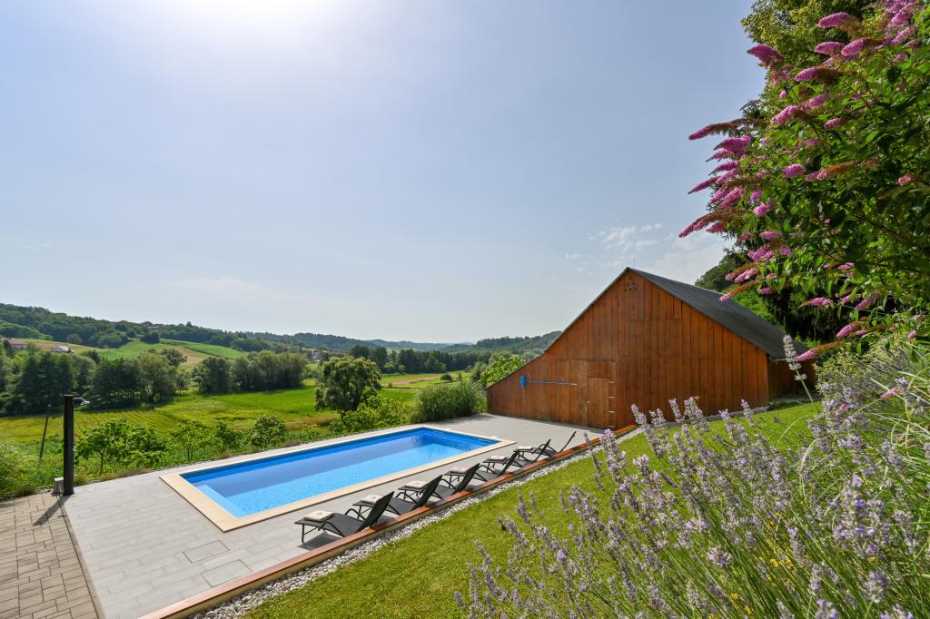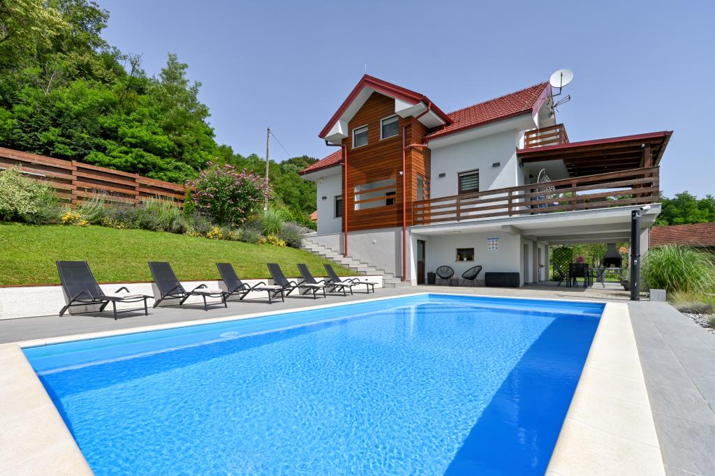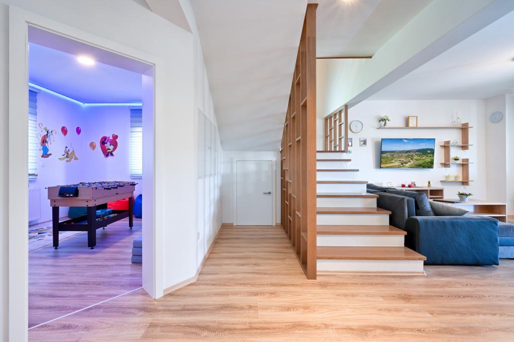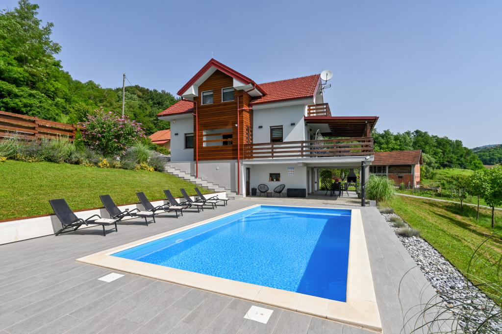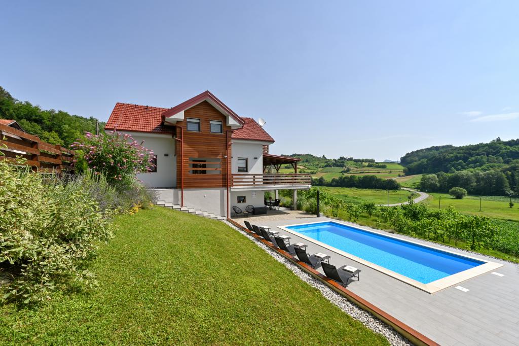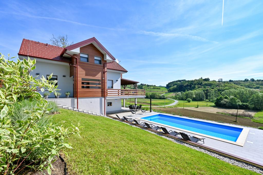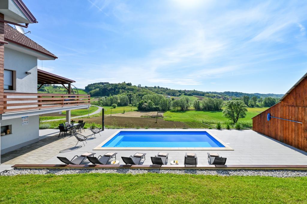 Dette utrolige hus ligger på en af de mange bakker i smukke Zagorje. Omgivet af bakker, vinmarker, frugtplantager og skove, er det et ideelt sted at nyde og hvile i naturen. Den vidunderlige udsigt, der strækker sig, giver mulighed for at nyde smukke solopgange, som huset har fået sit navn af. Sunrise Hill er kategoriseret med 4* og giver komfortabel indkvartering til 8 personer, og er primært orienteret mod familier med børn. Det er perfekt til en rolig ferie eller socialt samvær, men også til rekreation og sport. Udover den anlagte have, som byder på en stor swimmingpool med bruser og en overdækket og åben terrasse, en grill, et legehus, parkering, er huset indrettet med et minutiøst indrettet interiør domineret af træ og lyse og beroligende toner. Huset består af en stueetage med en rummelig stue med køkken og spisestue, et badeværelse, et legerum til børn med bordfodbold, en PS 4 spillekonsol og brætspil samt en rummelig terrasse, der inviterer til hvile og socialt samvær. Der er tre soveværelser på første sal i huset.