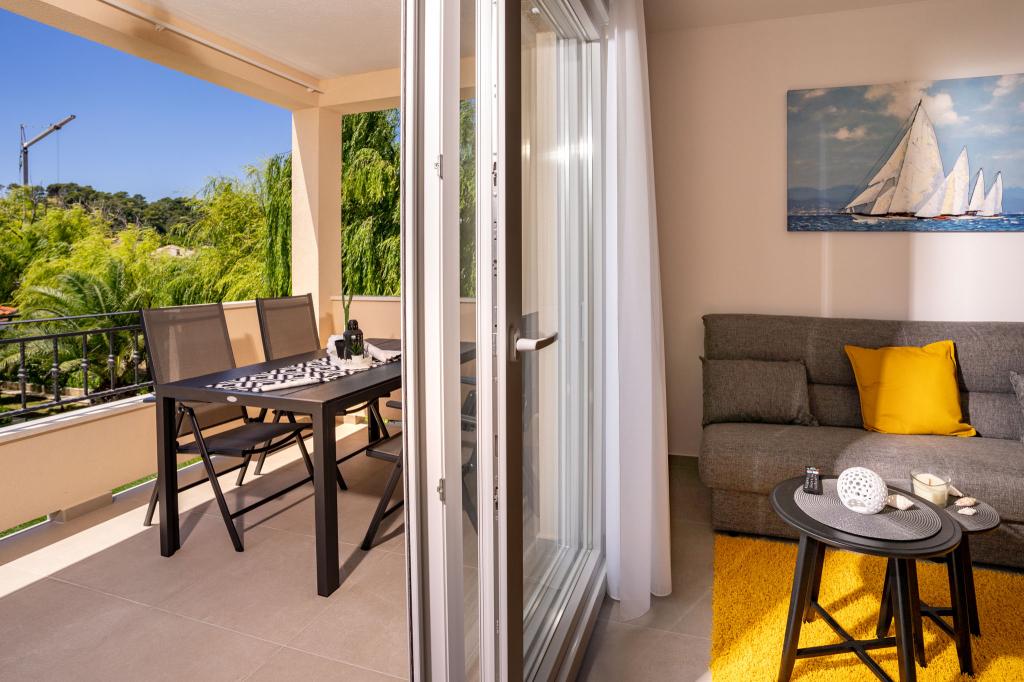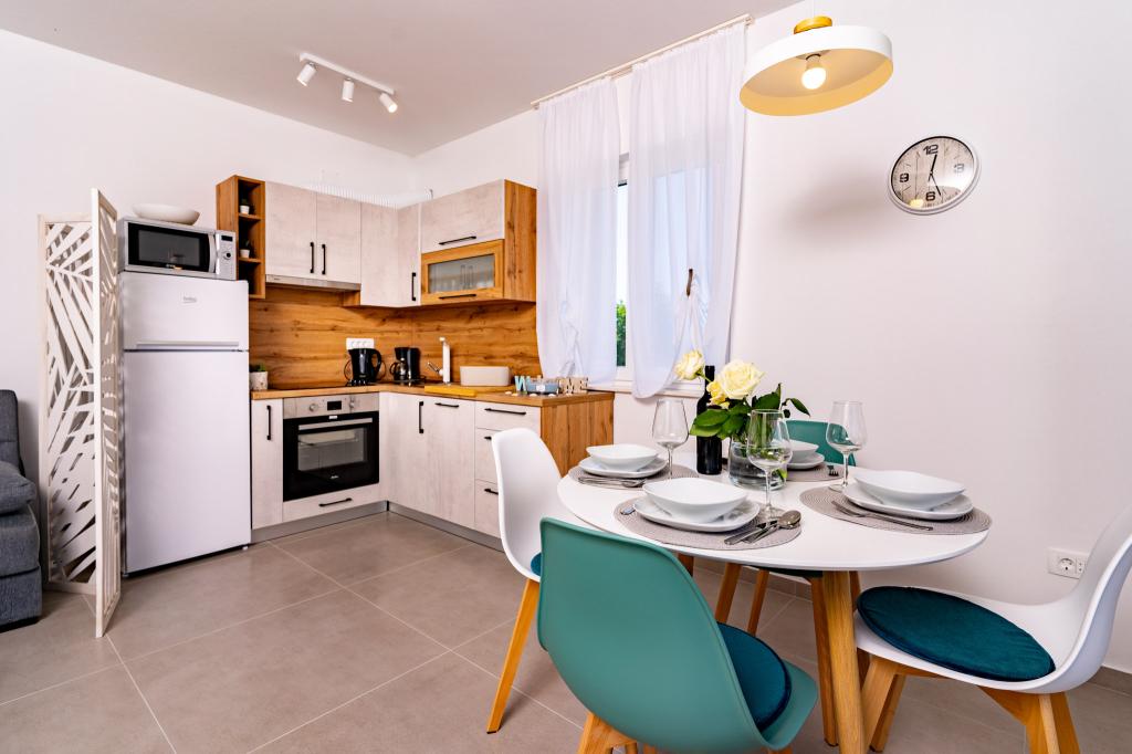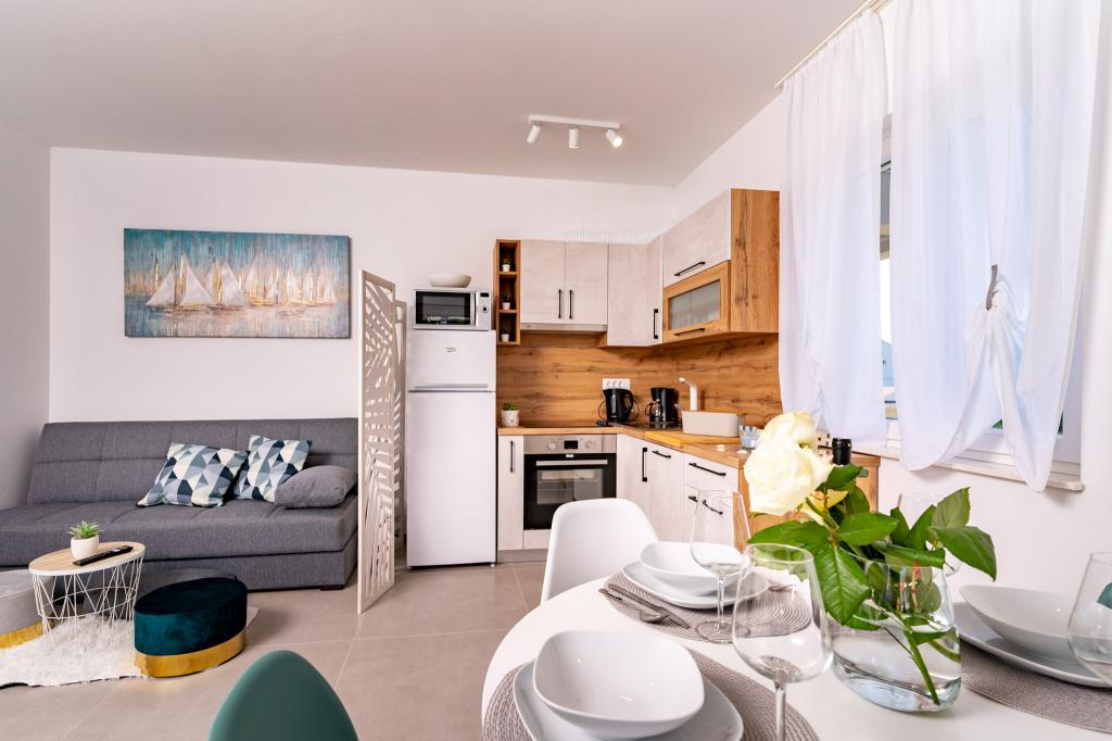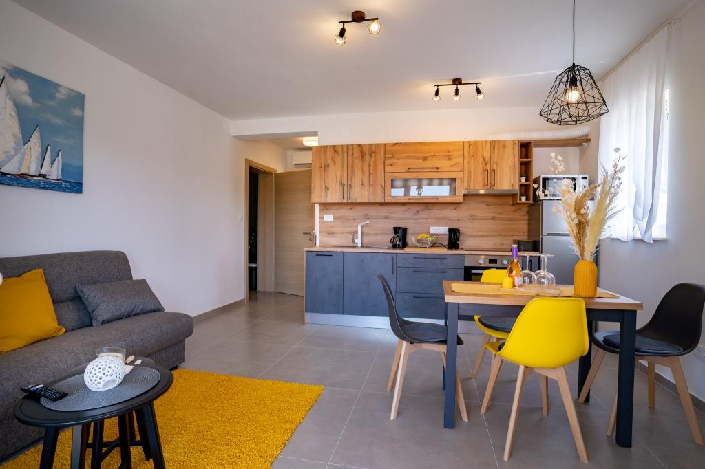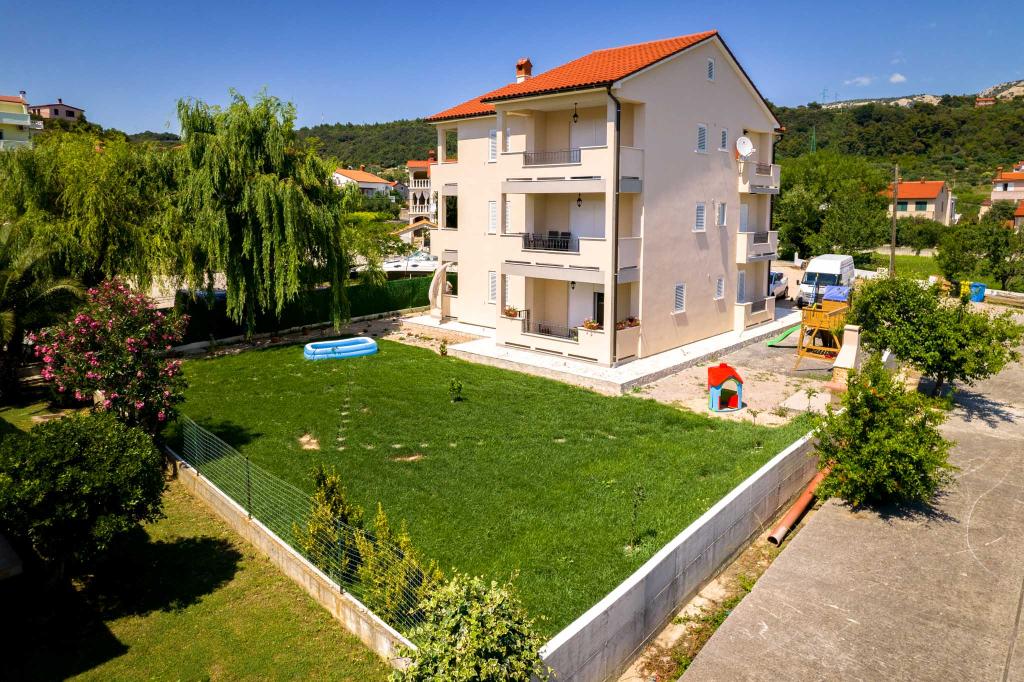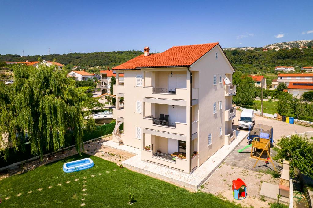 Fuldt og moderne møblerede lejligheder i en rolig del af øen Rab. Lejlighederne ligger 5 minutters gang fra stranden i Grat og 10 minutters gang fra det gamle centrum af Grat, supermarkeder er også 200 meter fra bygningen. Der er en stor gratis parkeringsplads og legeplads foran bygningen.