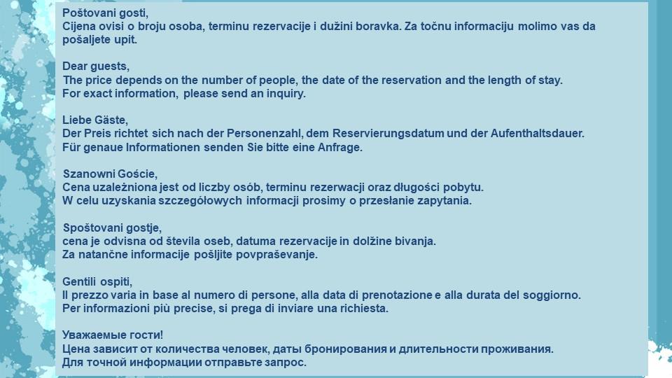 Prisen afhænger af reservationsperioden, antal dage, antal personer og lejlighedstype. Afhængigt af disse faktorer kan prisen stige eller falde. Rengøringsgebyret er 60 euro. For et præcist tilbud og mere detaljerede oplysninger, bedes du sende os en forespørgsel. Check ind kl. 16.00, check ud kl. 10.00