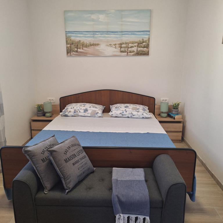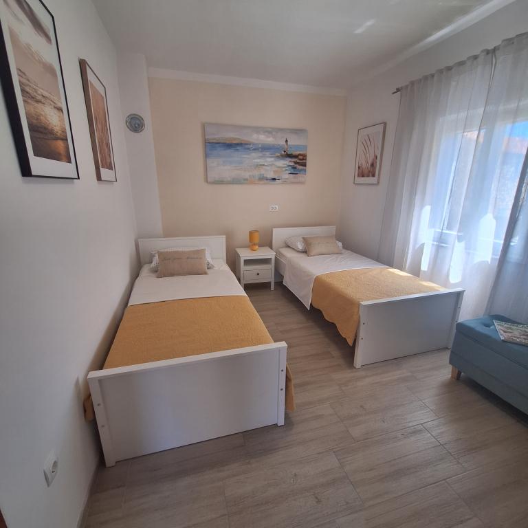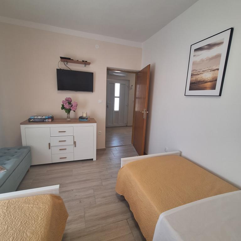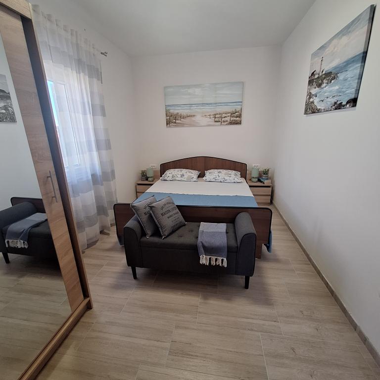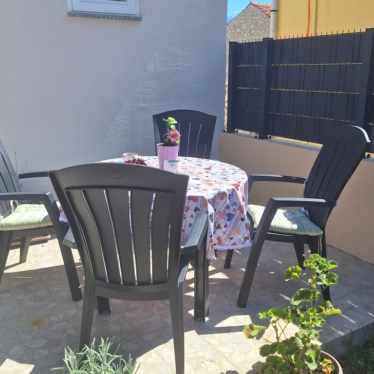 Det fuldt møblerede hus på 45 m2 ligger i Ražanac, en lille by med udsigt over Velebit. Huset ligger få minutters gang fra selve centrum af Ražanac, restauranter, apotek, butikker, posthus, fiskemarked, marked. . Den første butik er et minuts gang væk, Tommy supermarked er omkring 10 minutters gang væk. Der er parkering til en lille bil i huset. Huset består af køkken, badeværelse med toilet og bruser samt to soveværelser. Det har aircondition, opvaskemaskine, vaskemaskine, kaffemaskine, elkedel, ovn, køleskab med lille fryser, hårtørrer, tørretumbler, strygejern, strygebræt, håndklæder, service til 6 personer. Begge soveværelser har tv-apparater med max tv-modtager. Der er også gratis trådløs internetadgang. Foran huset er en terrasse med bord og stole og parasol.