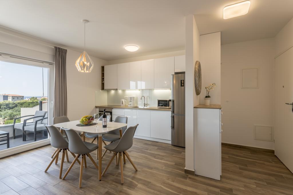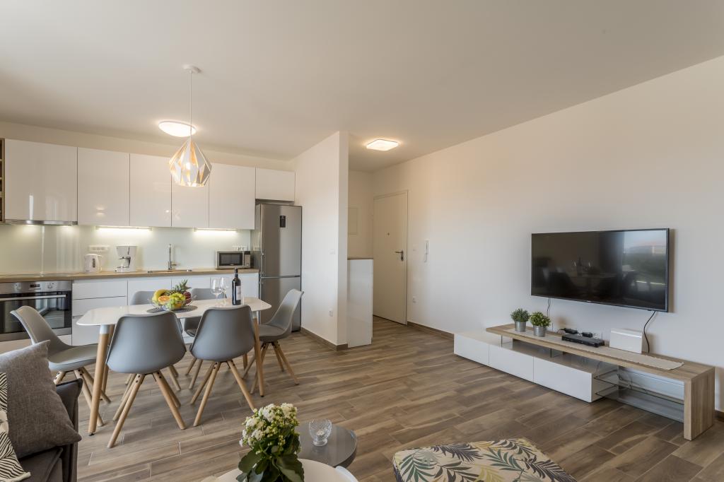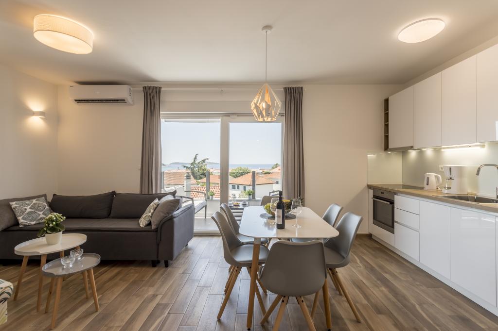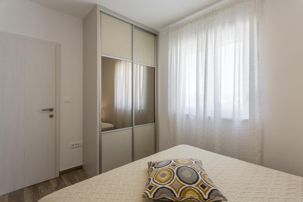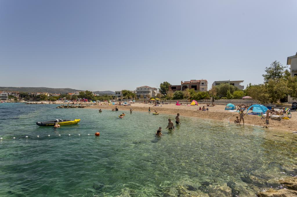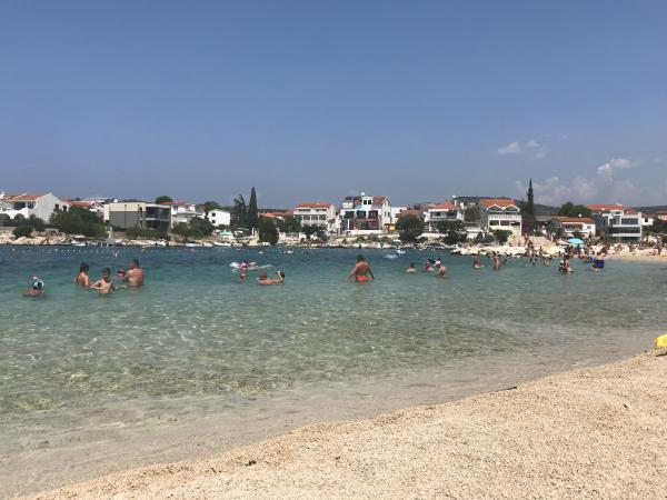 Alt er som i billedet, nyt og klart. Senge er usædvanligt høj kvalitet og komfortabel. Andet inventar og udstyr er kvalitet og smag kombineret. Klimaanlægget er tavst, og det udmattende af udendørs enheder høres ikke, så du kan nyde terrassen og sove i det åbne vindue. Køkkenet er fuldt udstyret, hvis du vil lave mad. Havet og den konkrete strand ligger 1 minuts gang væk, mens stenstranden har en 3-4 minutters gåtur langs havet. Indkvarteringen er ideel til en rolig familieferie. Vi var 4, vi tilbragte 9 dage i lejligheden og vi alle følte i lejligheden og var mere end glade! Mr. Damir og hans kone er meget venlige.