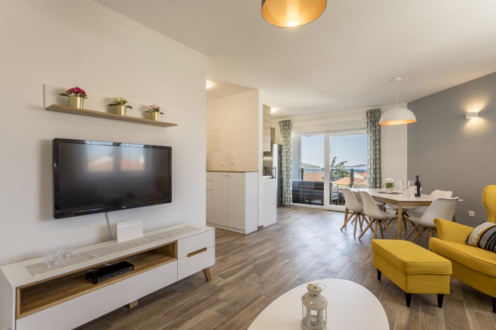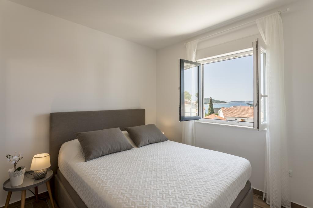 Luksuriøst indrettede og fuldt udstyrede nye lejligheder med udsigt over havet, kun et minuts gang fra den store stenstrand, i den rolige del af Rogoznica, Lozica-området. Lejlighederne er beliggende på anden sal i en ny bygning, hvoraf der er fri parkeringsplads. Den består af to soveværelser med dobbeltsenge med store senge, køkken og spisestue med stue, badeværelse og terrasse med panoramaudsigt over havet.