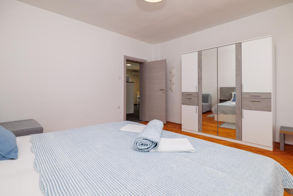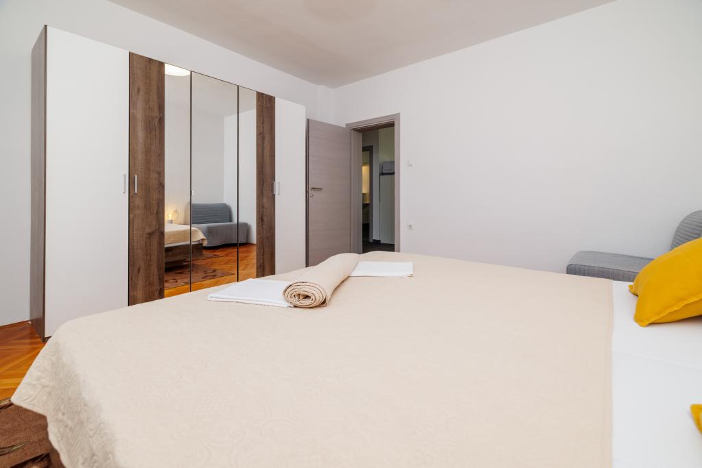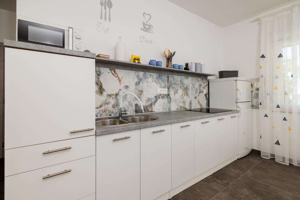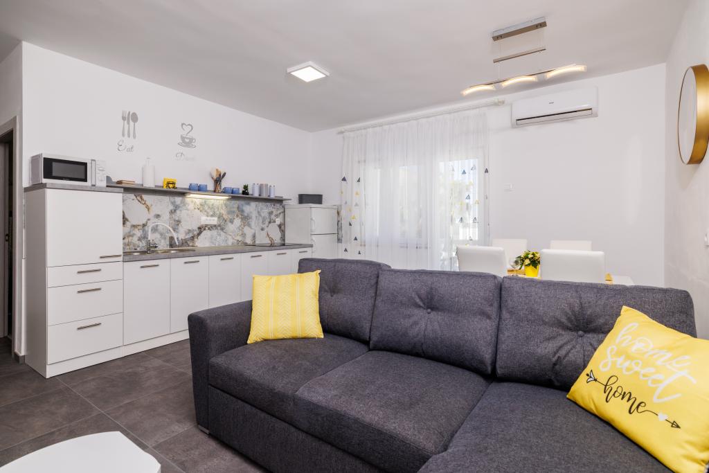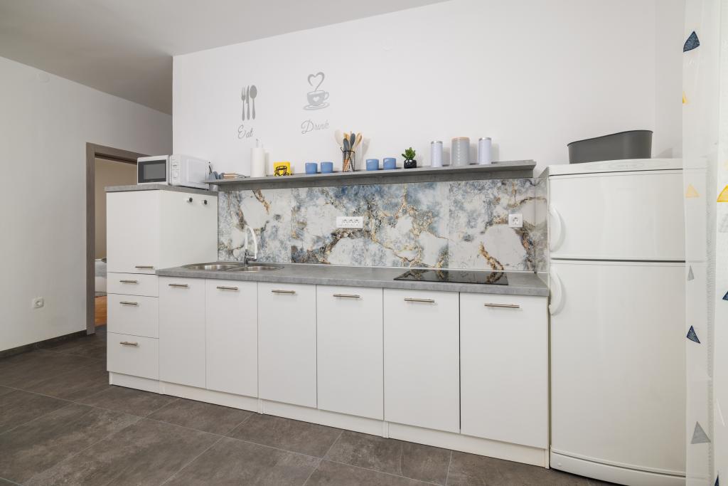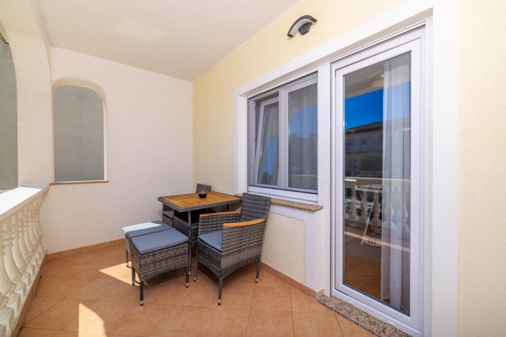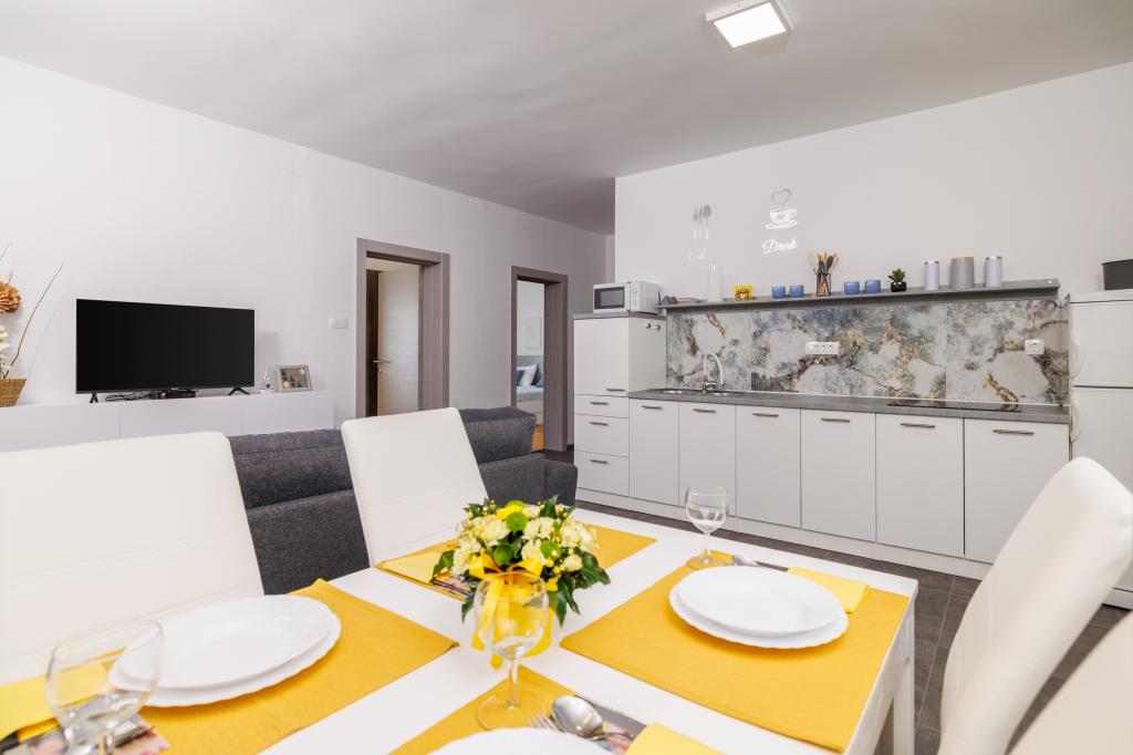 Lejligheden ligger i et familiehus lige ved siden af autocampen, få minutter fra havet og den berømte Rokan strand. På promenaden, der strækker sig gennem hele byen, er der en række restauranter, caféer, sportsfaciliteter og butikker. Lejligheden består af to store dobbeltværelser, hver med mulighed for en ekstra seng/udklappelig/, køkken med spisestue hvor der er hjørnesofa og tv samt rummeligt badeværelse med badekar og bruser. Der er en vaskemaskine på badeværelset. Hvert værelse og køkken åbner ud til en overdækket terrasse.