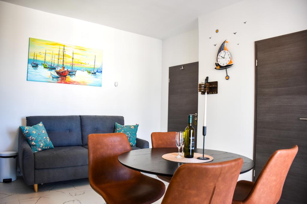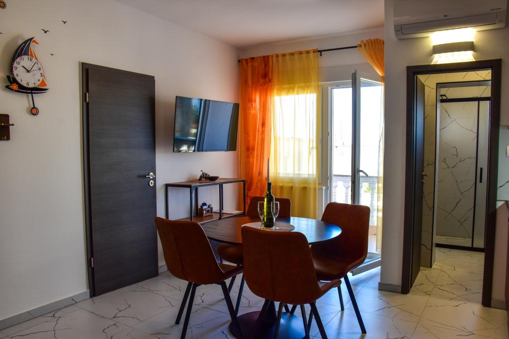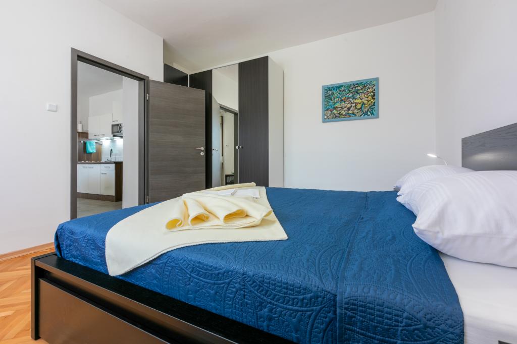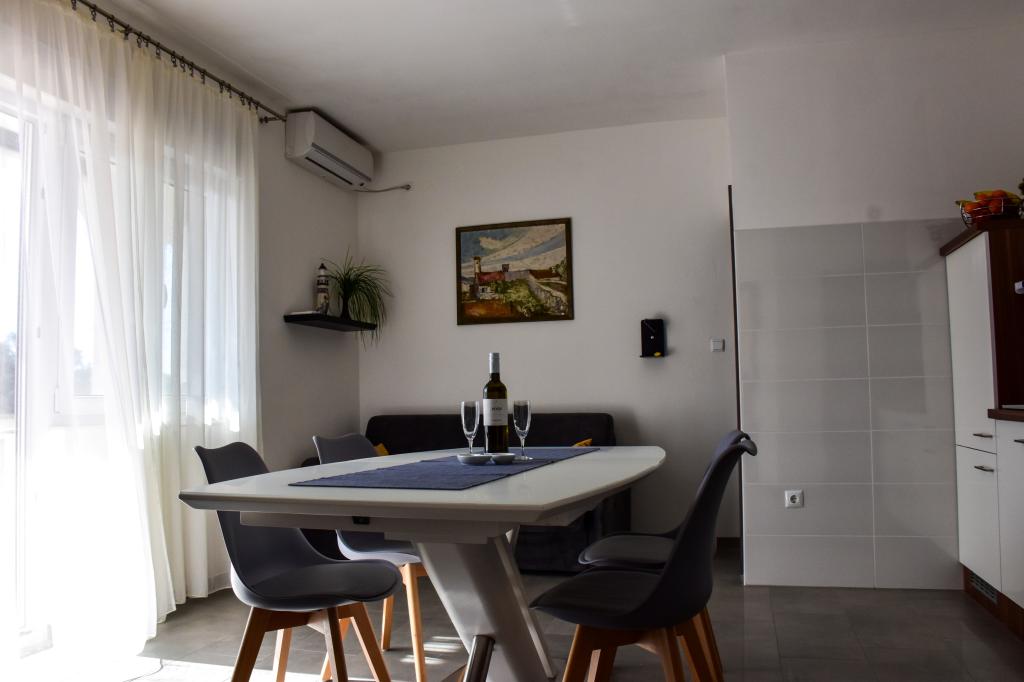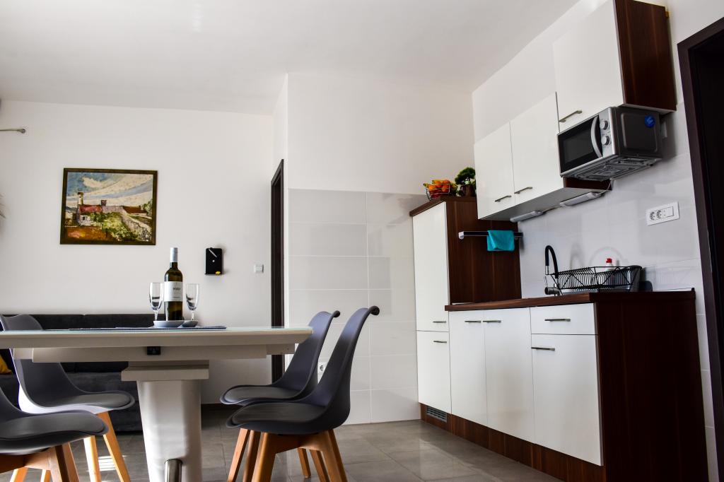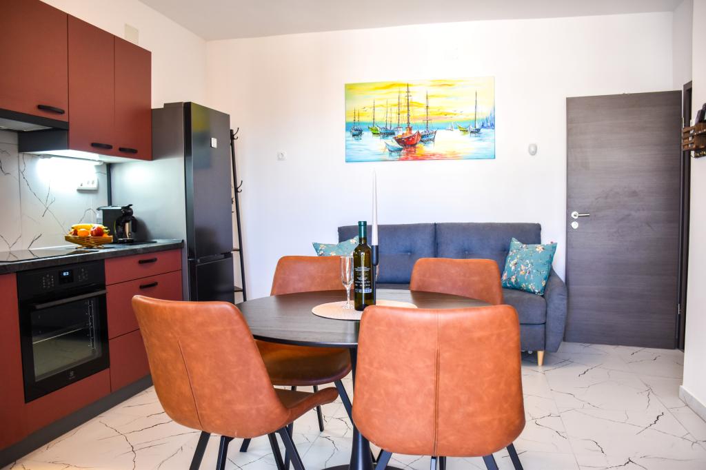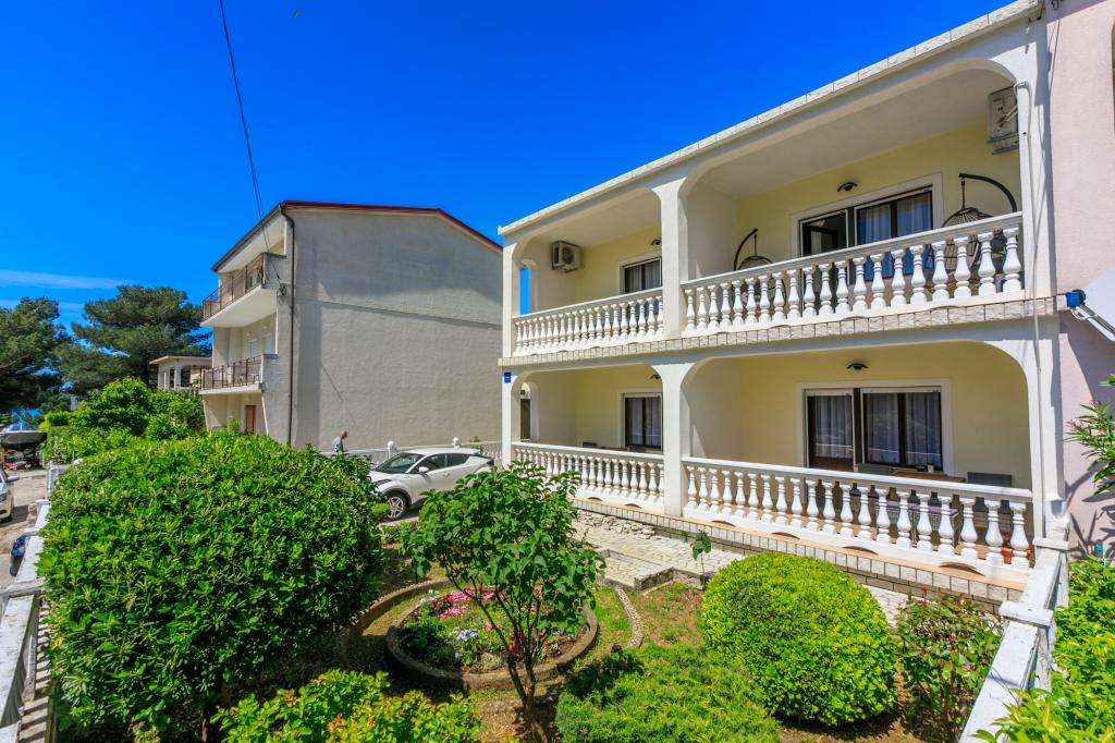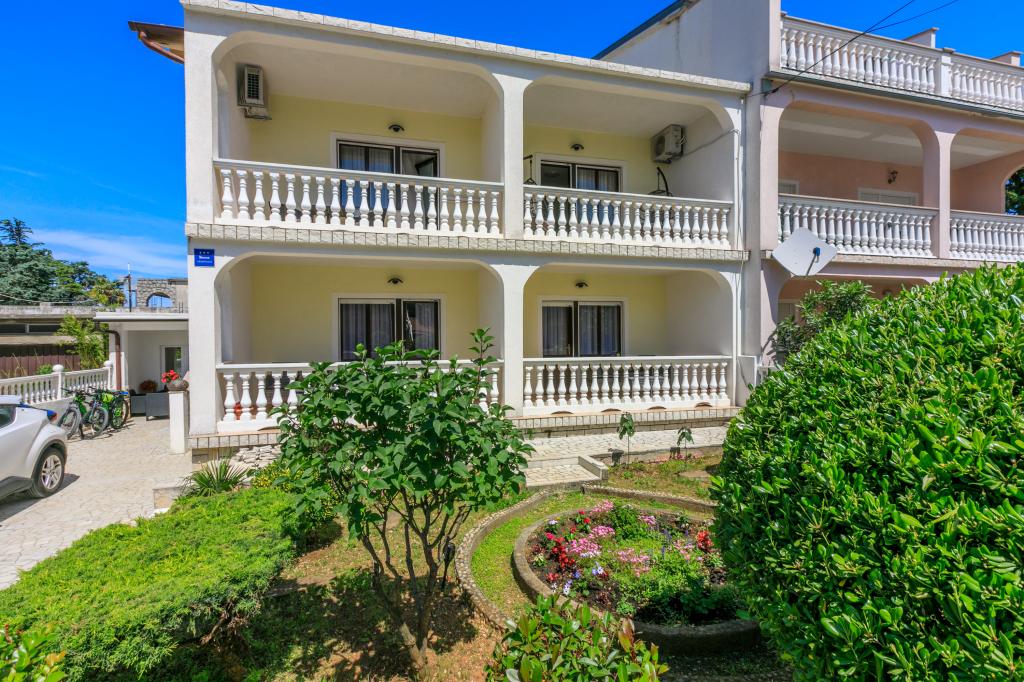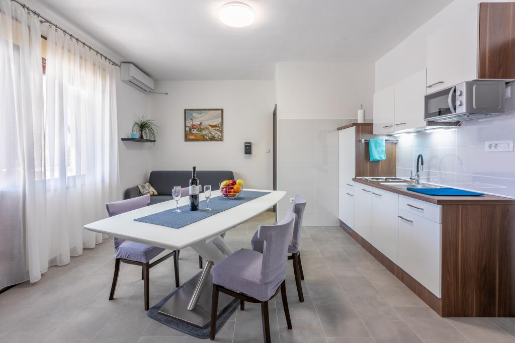 Lejlighederne ligger i et familiehus, få minutters gang fra havet og promenaden med en række restauranter, caféer, sportsfaciliteter og butikker. Lejligheden "Ema" (2+2) består af et dobbeltværelse, et køkken med spisestue hvor der er en dobbelt sovesofa, der kan foldes ud til en dobbeltseng, et badeværelse og en rummelig terrasse med grill. Den anden lejlighed "Gita" (2+1) har et soveværelse med dobbeltseng, et rummeligt køkken med en spisestue med en sovesofa, et badeværelse og en rummelig terrasse.