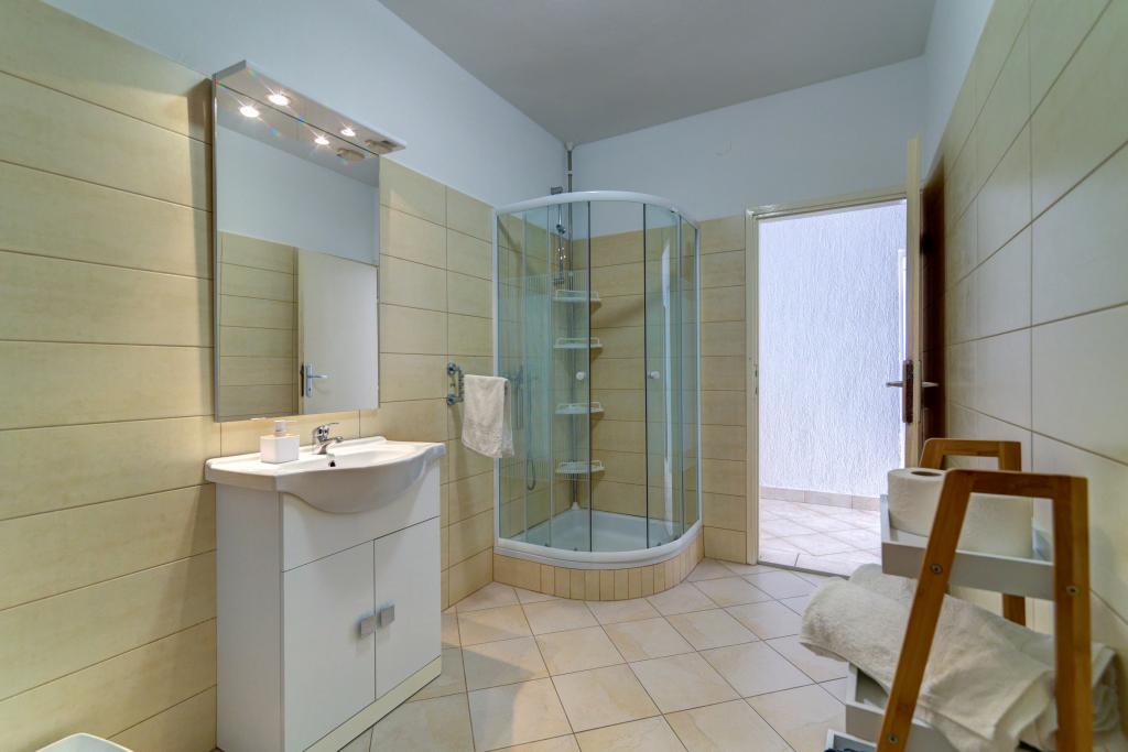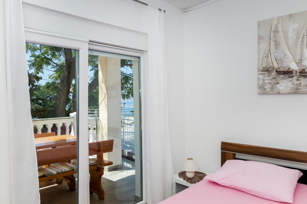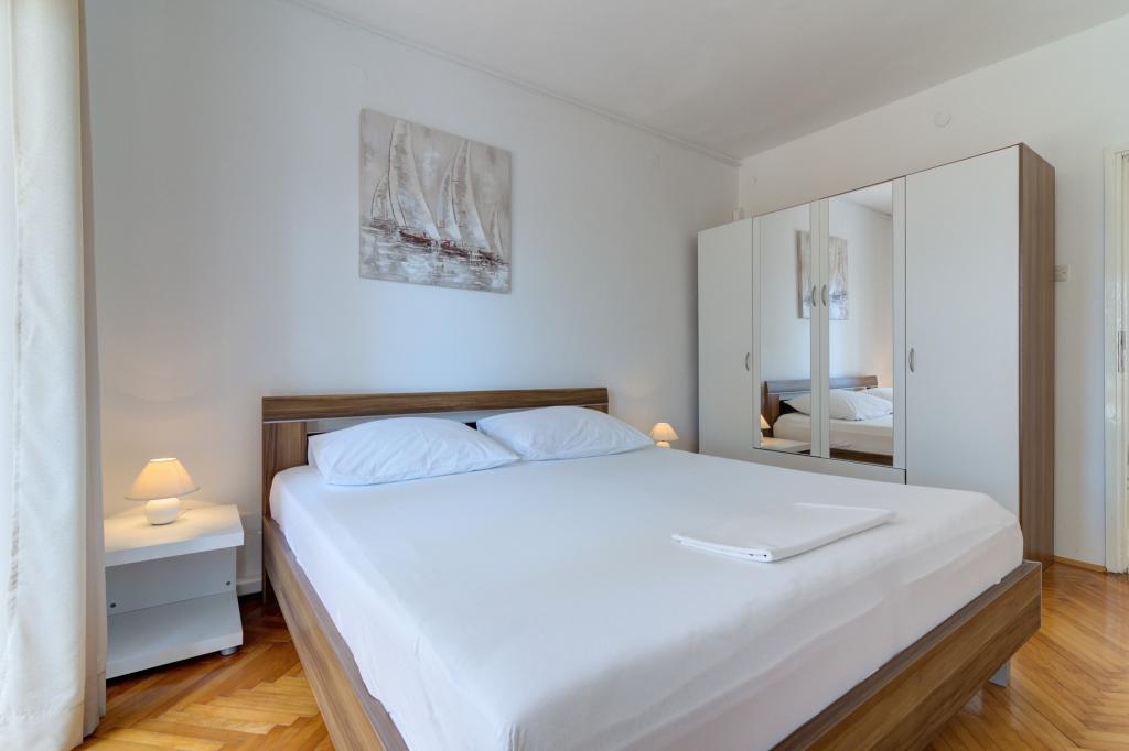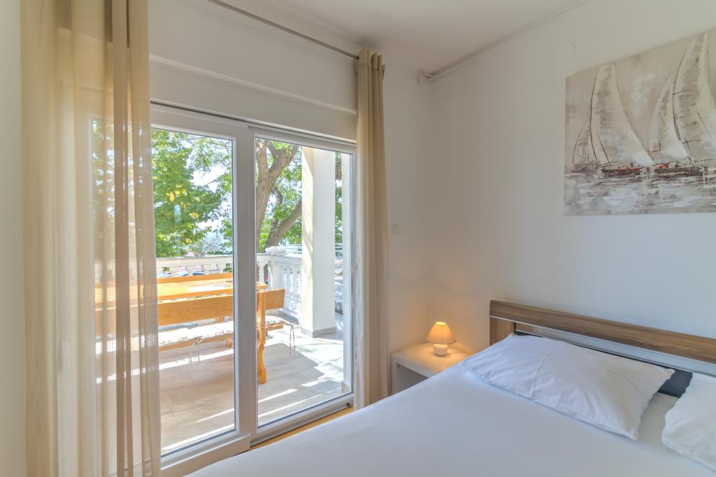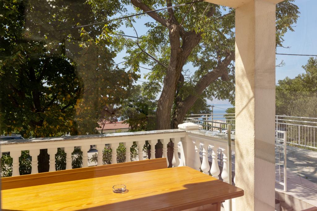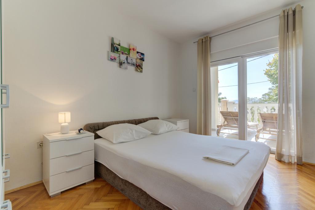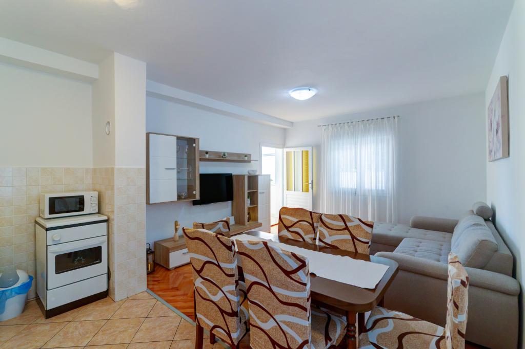Den moderne udstyrede lejlighed Marta (areal 100 m2) til 7 personer er beliggende i stueetagen af et familiehus omgivet af grønne områder og har to store værelser med dobbeltsenge med smuk udsigt over havet, et rummeligt værelse med tre senge, to badeværelser med bruser og toilet, rummelig stue med ekstra seng, spisestue og køkken forbundet med overdækket lysthus og grill. Et stort overdækket lysthus (areal 40 m2) med grill og siddepladser til 8 personer og to terrasser (areal 50 m2) med havudsigt udstyret med siddepladser og to liggestole er kun beregnet til denne lejligheds gæster. Foran lejligheden er der anlagt have med to store træer, græs og blomster og tre gratis parkeringspladser. Anlægget er beliggende i en rolig del af byen, 10 minutters gang til den første strand og byens centrum.