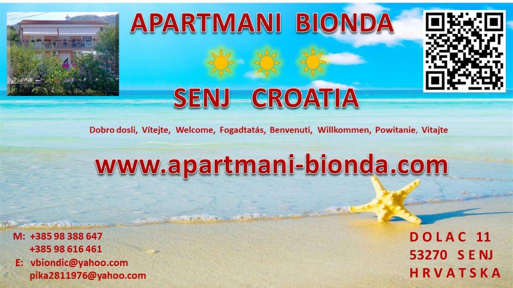 BIONDA Apartments er nybyggede, fuldt og moderne udstyrede i en rolig del af byen Senj. De er beliggende i en separat bygning, dvs. et fritliggende hus. Hver lejlighed har separat indgang, egen balkon eller terrasse, bord og stole til altanen, satellit-tv, trådløst internet, WI-FI, minibar, aircondition, elektriske varmepaneler og parkering til din bil. I umiddelbar nærhed af byen Senj ligger Plitvice Lakes Nationalpark, naturparkerne Velebit, Zavratnica samt øerne Goli, Grgur, Prvić, Krk og Rab. Lejlighederne udlejes hele året rundt.