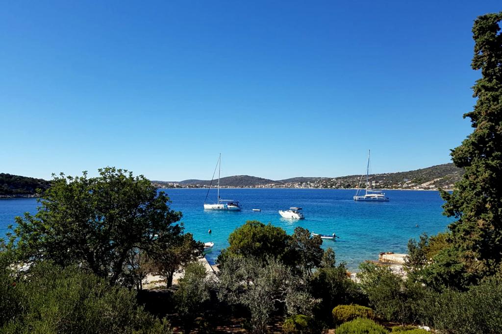 LEJLIGHED I HUS PÅ KYSTEN, MED EN FANTASTISK UDSIGT, LANGT FRA MÆNGDEN! Lejlighed Merara ligger lige ved kysten i Stari Trogir-bugten mellem Marina og Rogoznica, Trogir og Primošten. Det er langt fra bebyggelsen, som sikrer fred og nydelse i det naturlige miljø med fyrretræer. Adgang er mulig med bil og båd. Parkering til to biler og en køje til en båd er til rådighed, samt en ekstra ankerplads i nærheden af huset. Op til 6 gæster kan bo i to soveværelser og en stue. Badeværelse med toilet, køkken med spisestue, pejs med grill på stor terrasse med flot udsigt. Haven med middelhavsplanter er det eneste, der adskiller huset fra havet. Selvom det er isoleret, er der takket være solenergisystemet og strømgeneratoren al den komfort, du er vant til: varmt vand, fjernsyn / SAT, elektricitet, WiFi osv.