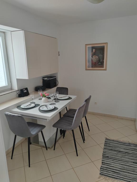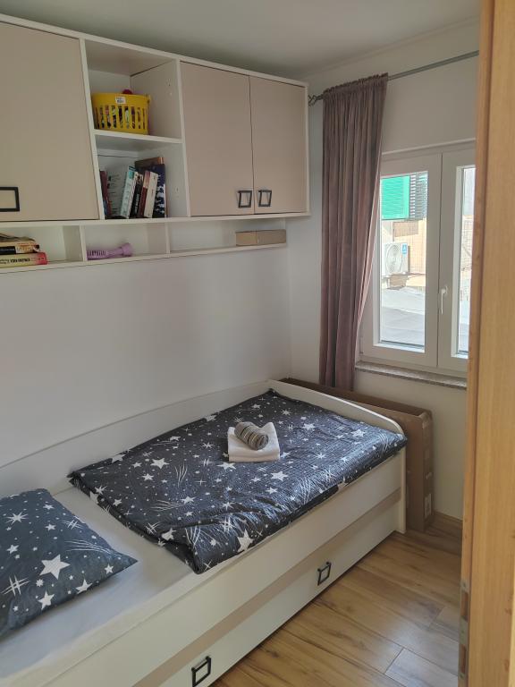 Hus til op til 5 personer med balkon og en smuk udsigt over havet og lystbådehavnen. Gæster har parkering, gratis wifi, aircondition, tv med masser af kanaler, Netflix... Du behøver kun 5-10 minutters kørsel til den første strand. Solaris ligger i nærheden, hvor du har et indendørs og udendørs vandland, så det er åbent hele året rundt, byens centrum ligger 10 minutters kørsel væk, vi har 4 smukke fæstninger at besøge, to nationalparker og meget mere. Huset er ideelt til en familieferie og afslapning med udsigt over havet. Den rolige beliggenhed giver mulighed for et behageligt ophold, og balkonen er perfekt til morgenkaffe eller aftenafslapning. Jeg står altid til rådighed for yderligere information.